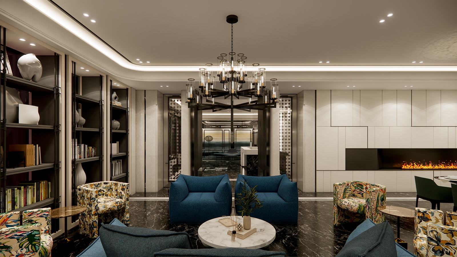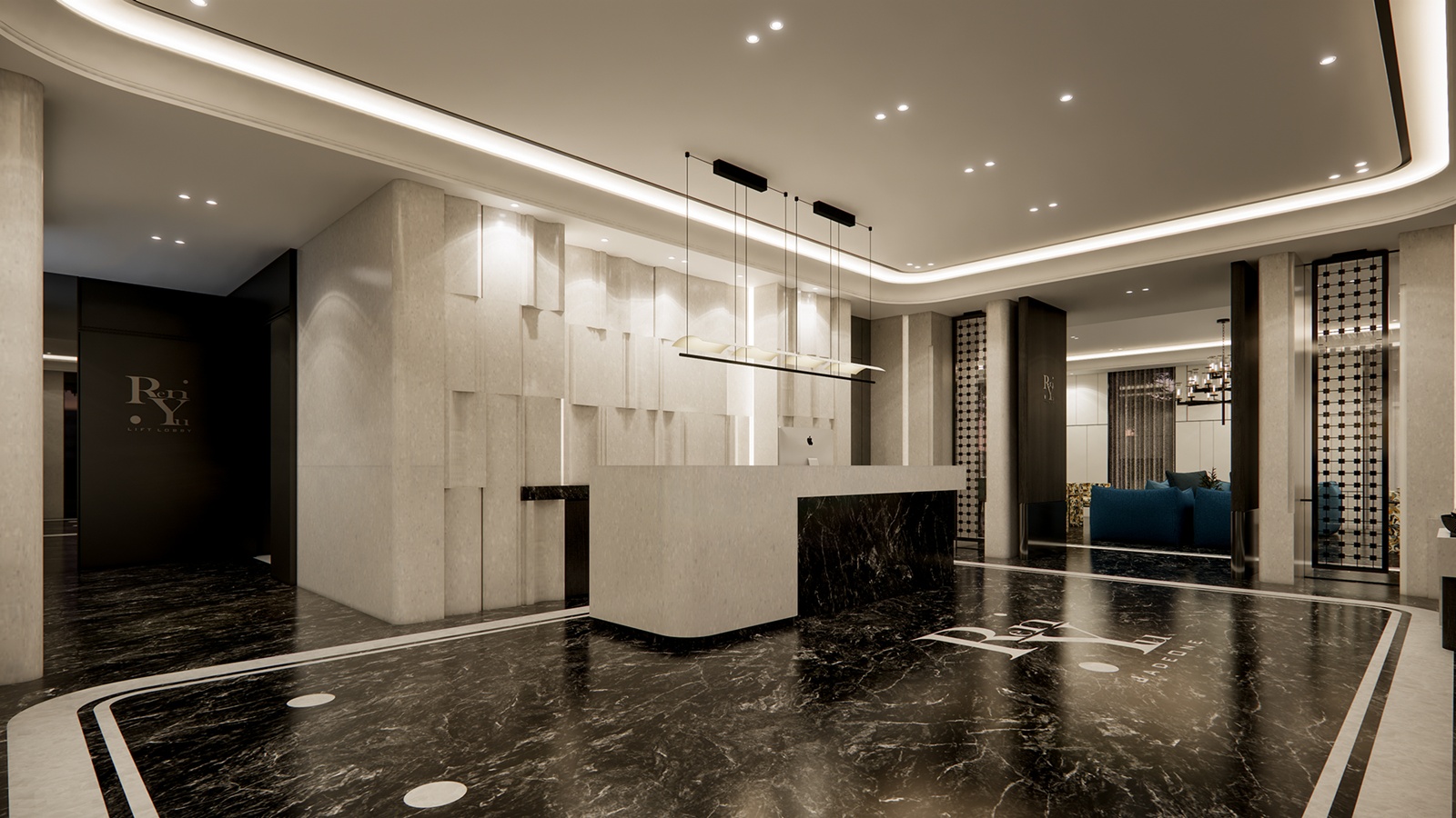由主要入口大廳進入,黑白對比的石材奠定明確的迎賓基調,牆面透過一致尺度的立體分割,形成穩定的立面節奏。主題 LOGO 作為辨識元素,嵌入石材、木皮與金屬之中,引導動線而不干擾整體美學。交誼廳承接大量自然採光,弧形天花消除銳角陰影並均勻柔化光線。淺色牆面與深色地坪構成穩定基底,軟裝家具選用具東方文化意涵的織品,隱約回應法國藝術史中東西交融的意境。在接近私領域的門廳與梯廳,刻意收斂曲線與裝飾,僅保留法式線板的比例精神,並轉譯為立體牆面分割,搭配金屬細節與間接照明,使垂直動線在功能之外,亦具清晰節奏,進而強化公私領域轉折處的銜接秩序。