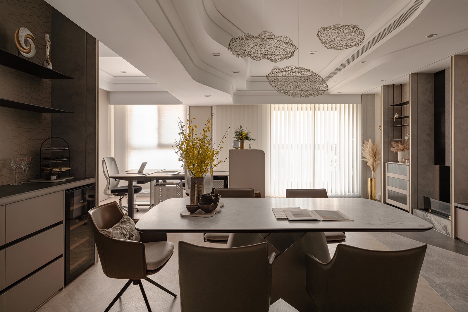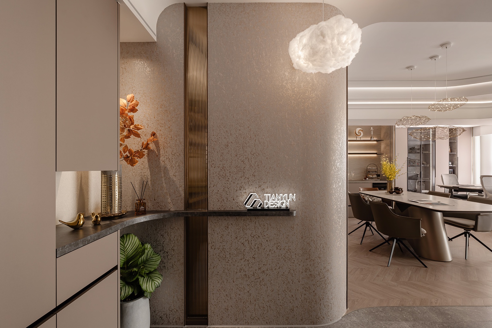 本案榮獲  2025 波蘭ADC設計典藏大獎 Architecture & Design Collection Awards – 銅獎。本案為辦公室設計,以「藍天為圖、浮雲為形」為核心理念,旨在創造融合自然意象的辦公場域。設計語彙從天、地、壁三向展開,藉由流暢的曲線與光影變化,呈現豐富的層次感。天花板、地面與吧台區的流線語彙與燈帶,以及雲朵造型燈具,緊密呼應核心概念,傳達「氣場循環、財氣流動」的東方意象,為辦公場所注入溫度與獨特品味。