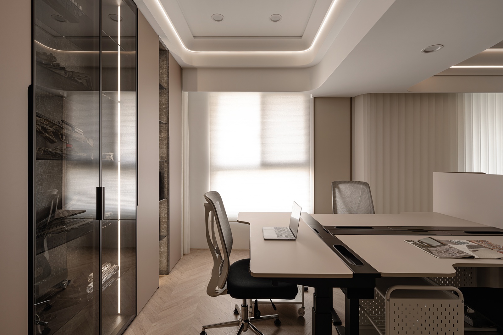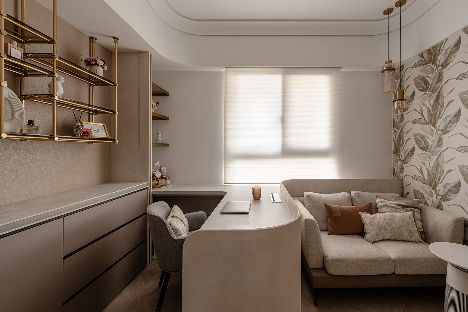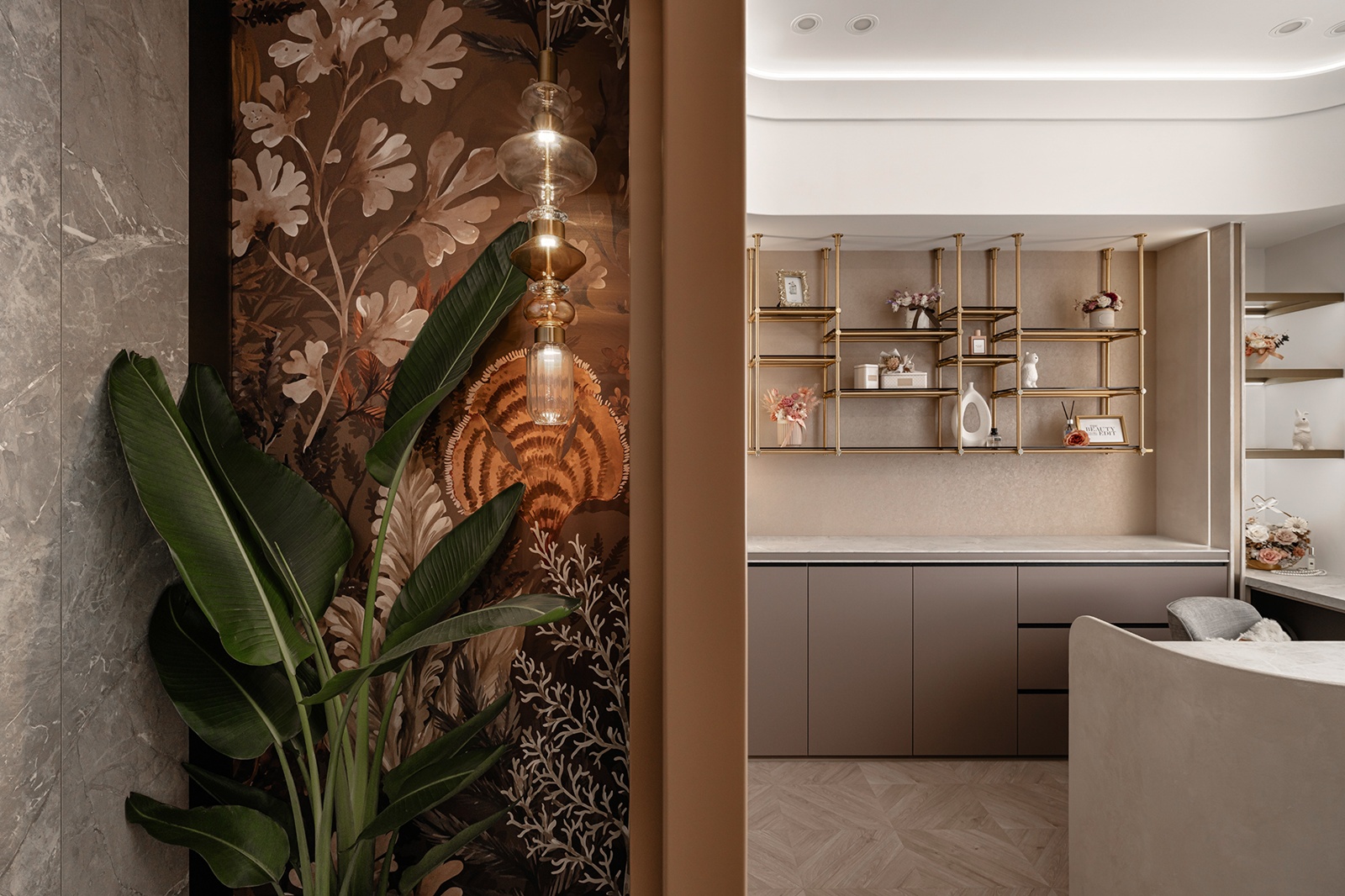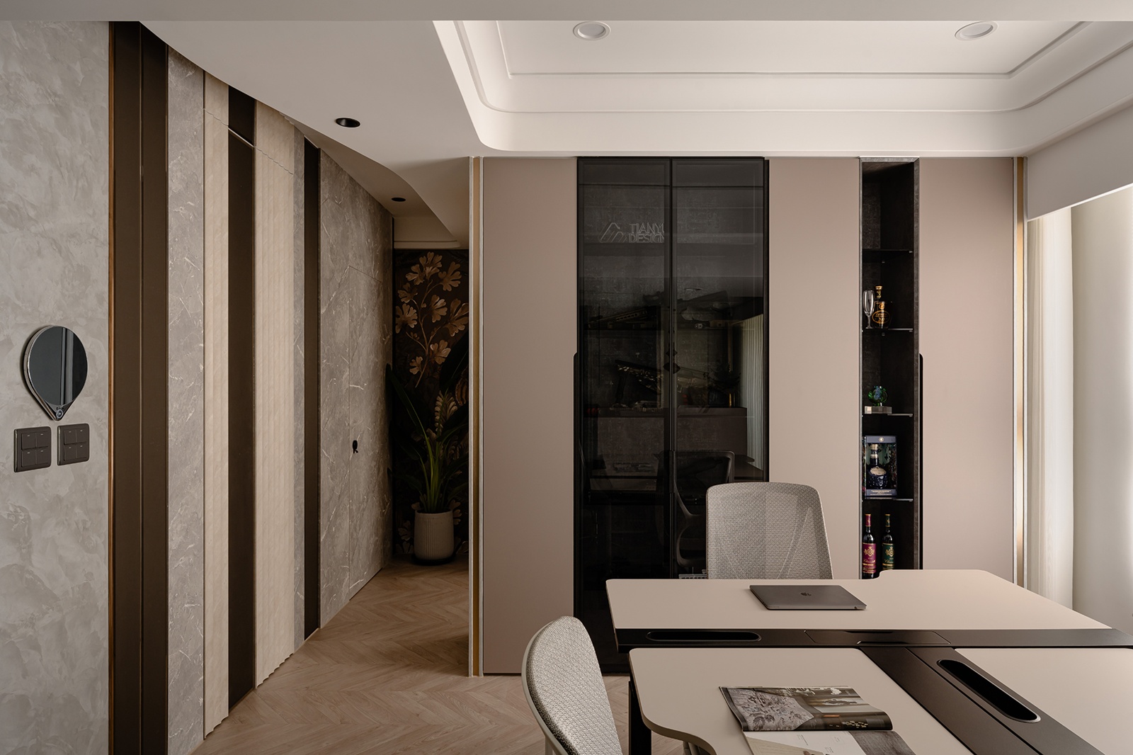自玄關進入,弧形立面界定出吧台與廚房,化解風水疑慮。吧台櫃體與廚房壁面以線條勾勒結合金屬元素,提升整體精緻度。天花與地板互相呼應的弧線走勢,地坪運用多種材質拼接,創造整體感並引導動線。辦公區配置升降式活動桌,滿足團隊彈性擴編需求並兼顧人體工學。後方展示收納櫃採用黑玻門片,為空間增添故事性。一旁廊道的隱藏門片,以米色、淺灰色石材紋理與古銅金屬飾面拼接,門後設有儲藏間與衛浴。衛浴區以義大利花磚及不同大理石材鋪陳,圓弧形鏡面與黃銅色澤的玻璃吊燈,帶來明亮溫馨感受。總監辦公室延續公區曲線元素,辦公桌呈現弧形並連接沙發洽談區,並配置精品展示及更衣空間。整體採低飽和色調搭配熱帶植物壁紙,黃銅金屬層架點綴優雅質感,帶來沉穩雅緻氛圍。