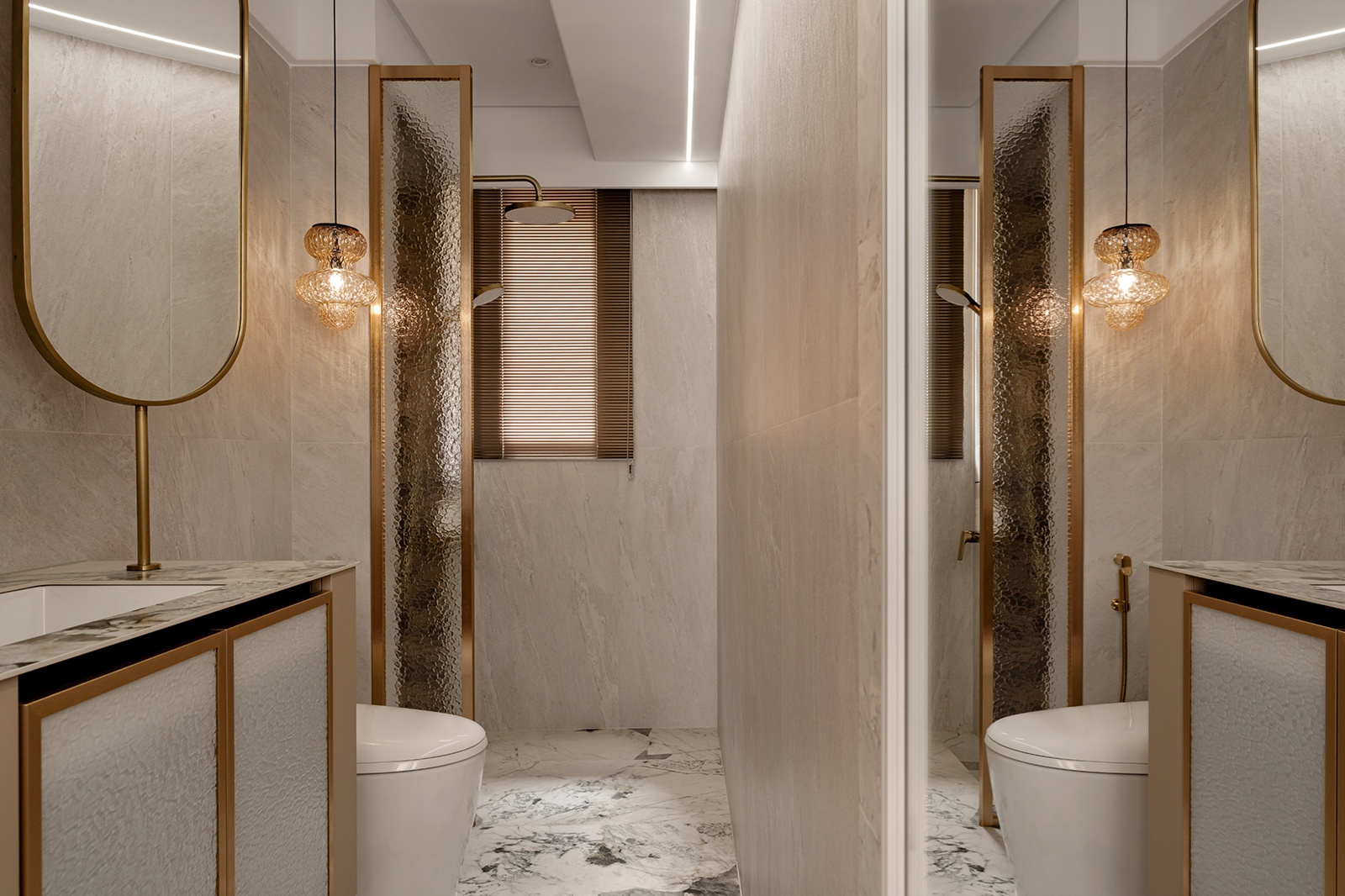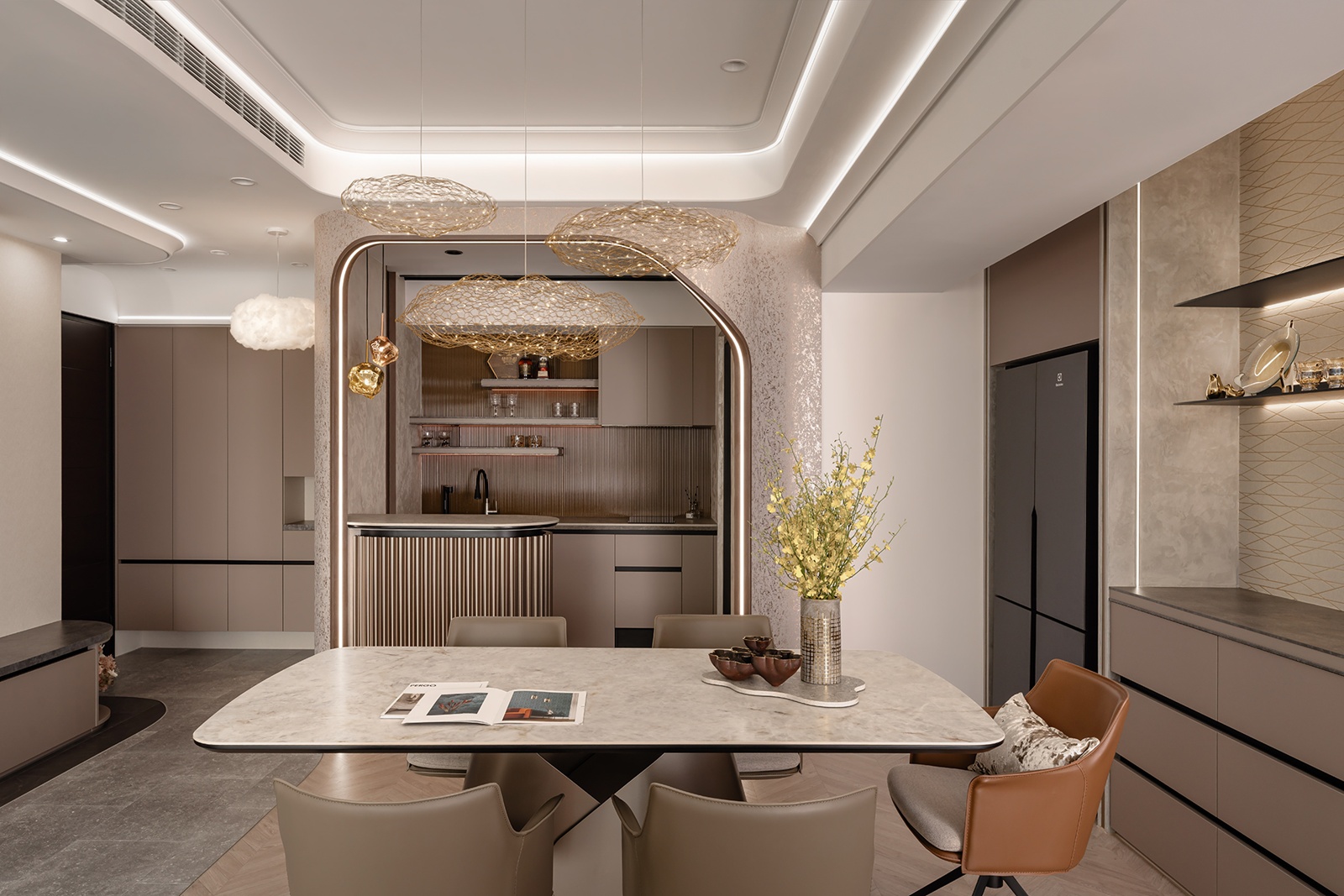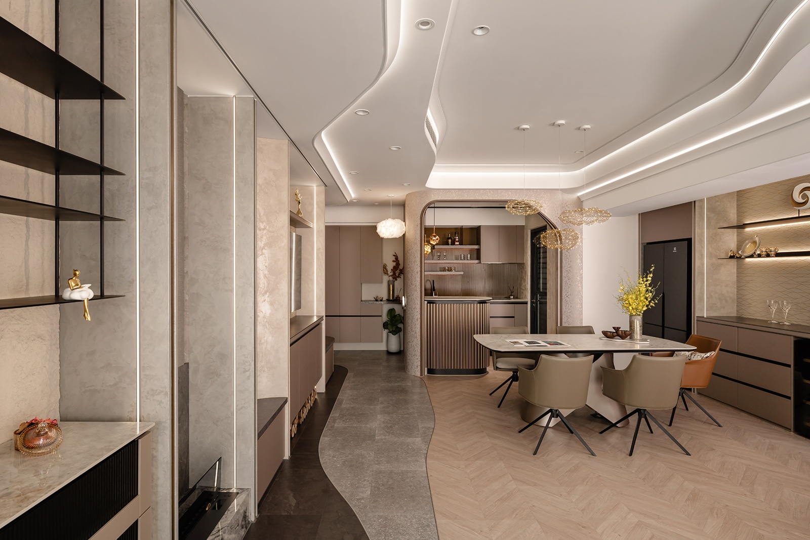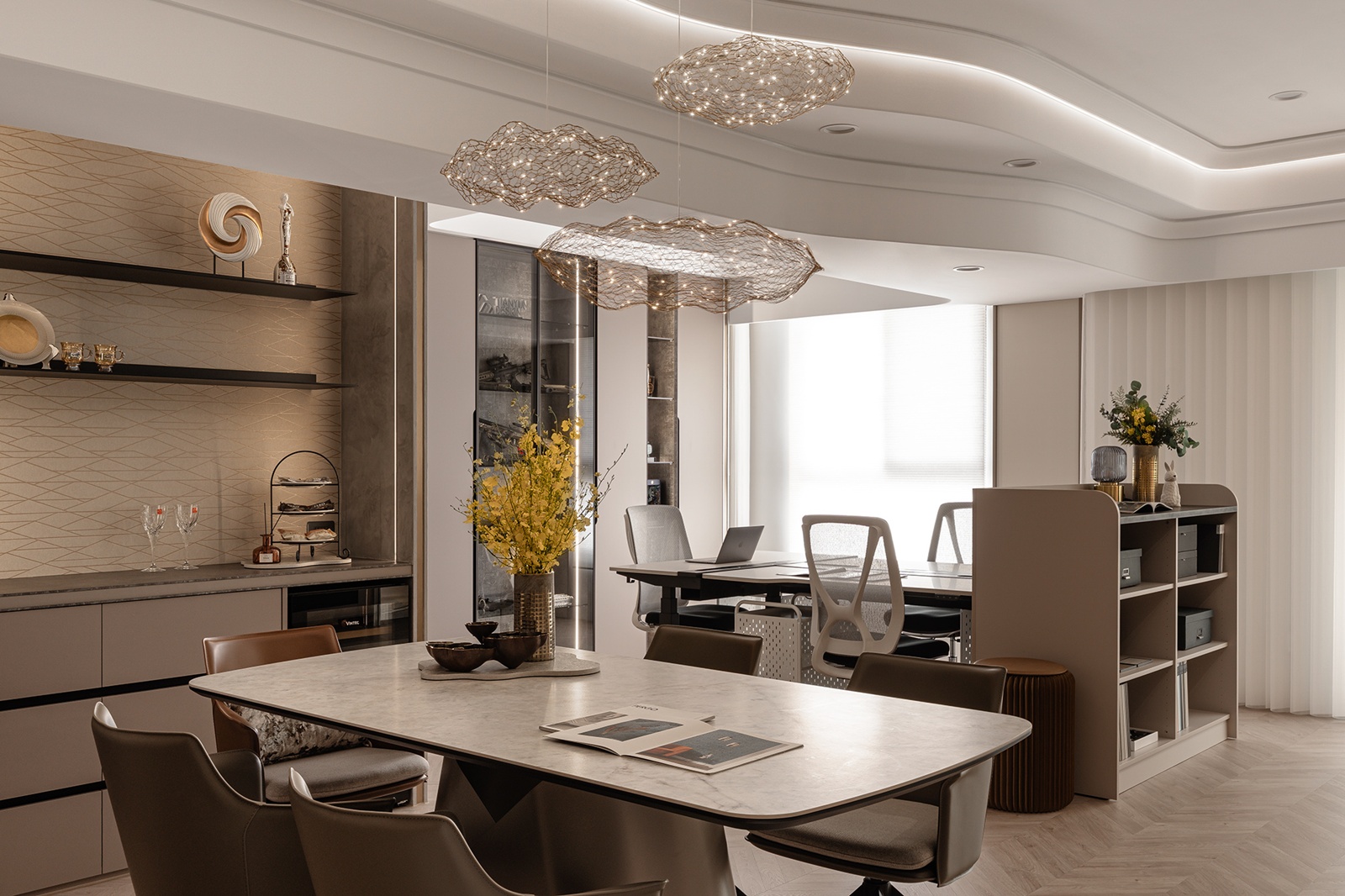 自玄關進入,弧形立面界定出吧台與廚房,化解風水疑慮。吧台櫃體與廚房壁面以線條勾勒結合金屬元素,提升整體精緻度。天花與地板互相呼應的弧線走勢,地坪運用多種材質拼接,創造整體感並引導動線。辦公區配置升降式活動桌,滿足團隊彈性擴編需求並兼顧人體工學。後方展示收納櫃採用黑玻門片,為空間增添故事性。一旁廊道的隱藏門片,以米色、淺灰色石材紋理與古銅金屬飾面拼接,門後設有儲藏間與衛浴。衛浴區以義大利花磚及不同大理石材鋪陳,圓弧形鏡面與黃銅色澤的玻璃吊燈,帶來明亮溫馨感受。總監辦公室延續公區曲線元素,辦公桌呈現弧形並連接沙發洽談區,並配置精品展示及更衣空間。整體採低飽和色調搭配熱帶植物壁紙,黃銅金屬層架點綴優雅質感,帶來沉穩雅緻氛圍。