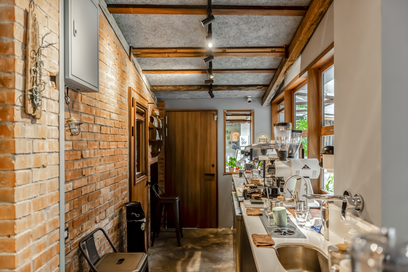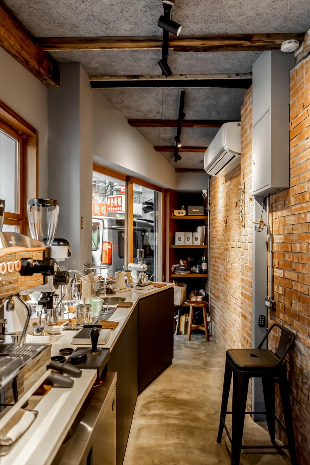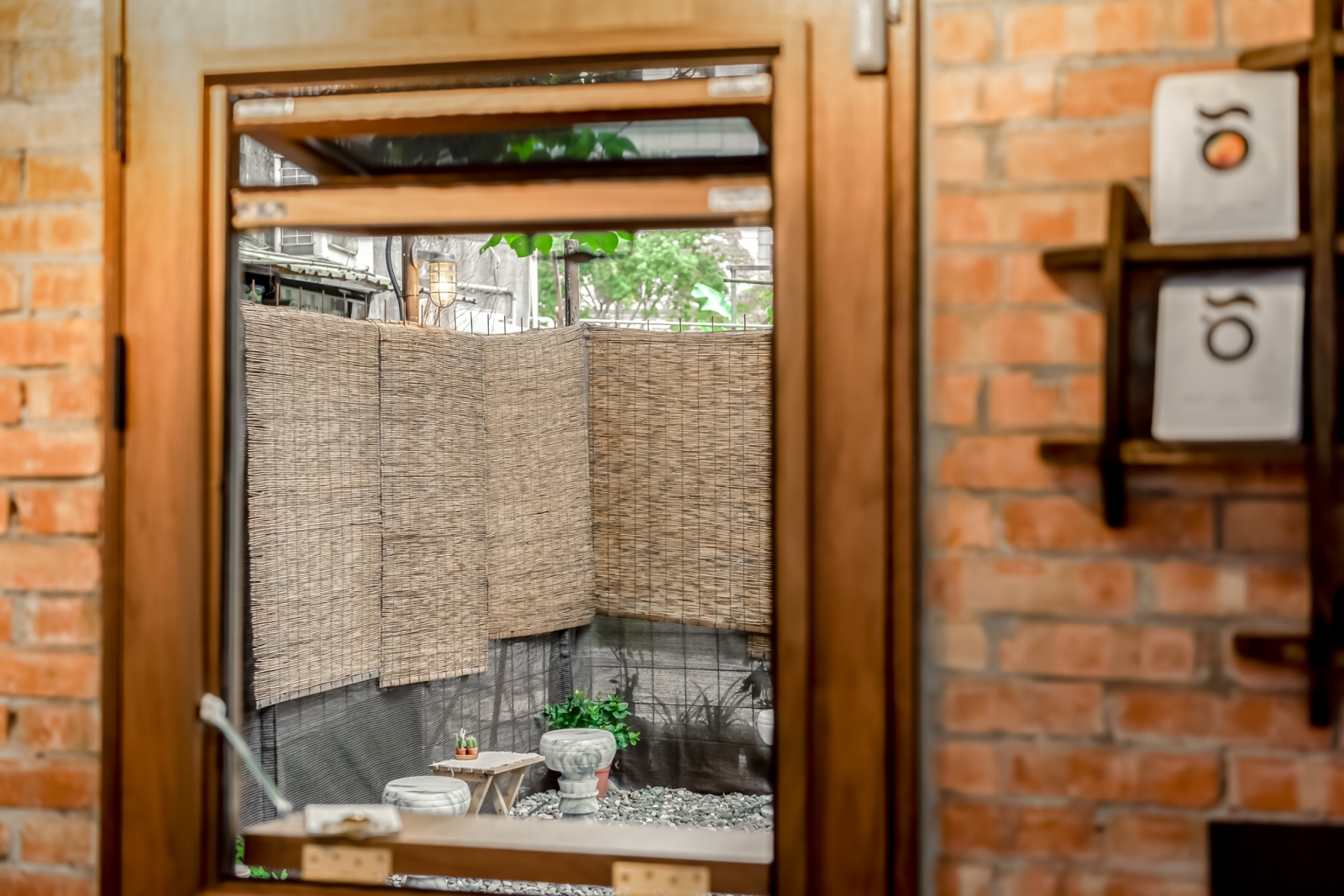 內部空間狹長而秩序井然,白色檯面的咖啡台沿窗設置,將工作區延伸至街景。天花板刻意留下舊有的木樑構造,與樸實的灰色水泥天花板形成粗獷質感。軌道燈柔和地投射於紅磚牆,光影在磚面與木紋間游移,烘托出溫暖氛圍。工作區後方設有木門,可以通往竹簾圍繞的微型戶外庭院。日式枯山水的造景中有露營風桌椅,提供顧客靜謐的品飲時光。這種「內外相望」的設計,使封閉空間獲得延伸,給予咖啡師心緒的休憩空間,忙碌中同時能望向自然。