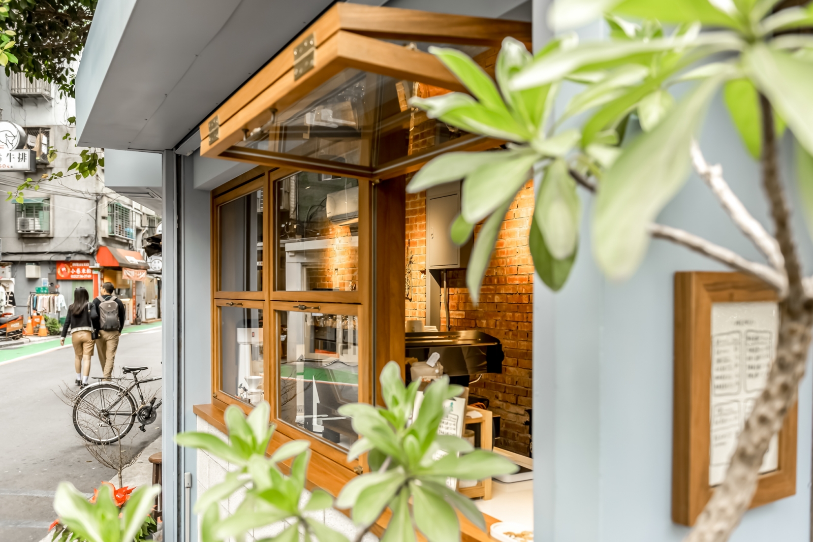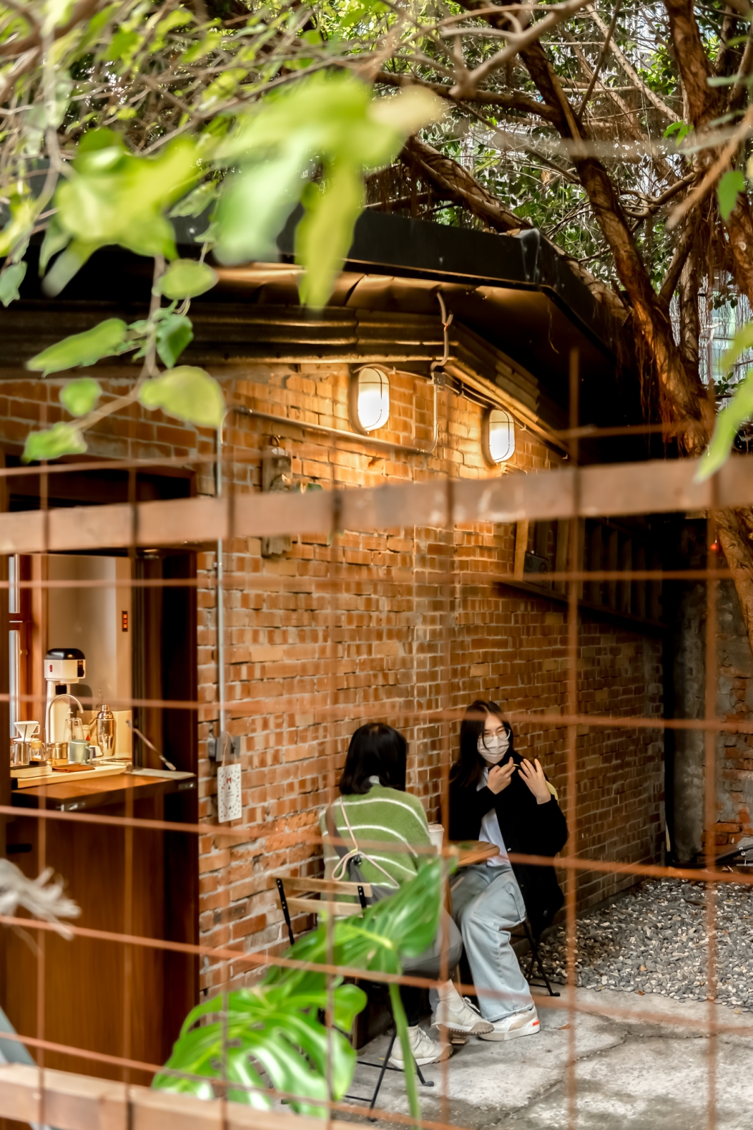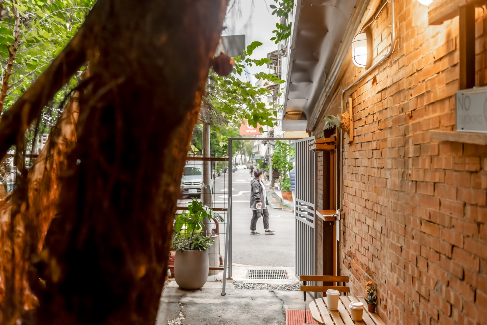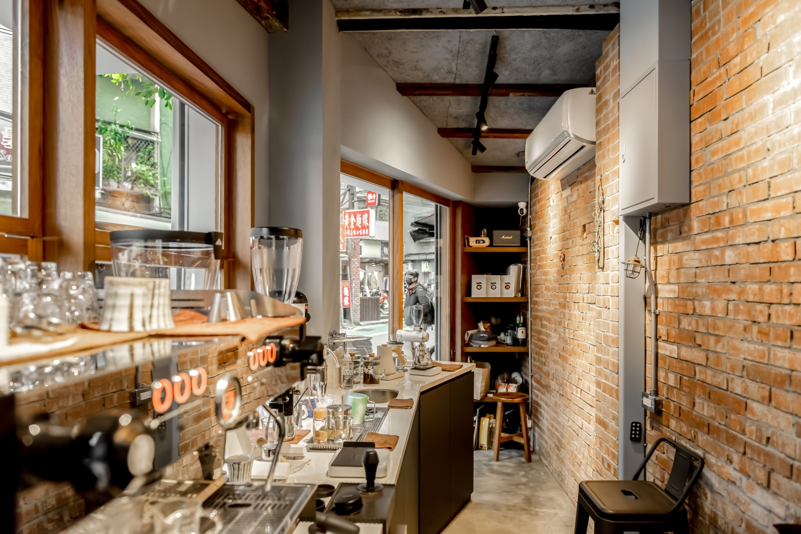 內部空間狹長而秩序井然,白色檯面的咖啡台沿窗設置,將工作區延伸至街景。天花板刻意留下舊有的木樑構造,與樸實的灰色水泥天花板形成粗獷質感。軌道燈柔和地投射於紅磚牆,光影在磚面與木紋間游移,烘托出溫暖氛圍。工作區後方設有木門,可以通往竹簾圍繞的微型戶外庭院。日式枯山水的造景中有露營風桌椅,提供顧客靜謐的品飲時光。這種「內外相望」的設計,使封閉空間獲得延伸,給予咖啡師心緒的休憩空間,忙碌中同時能望向自然。