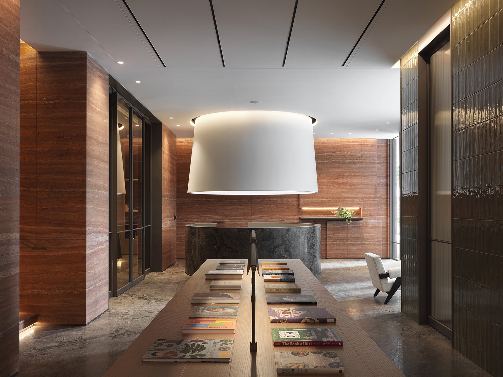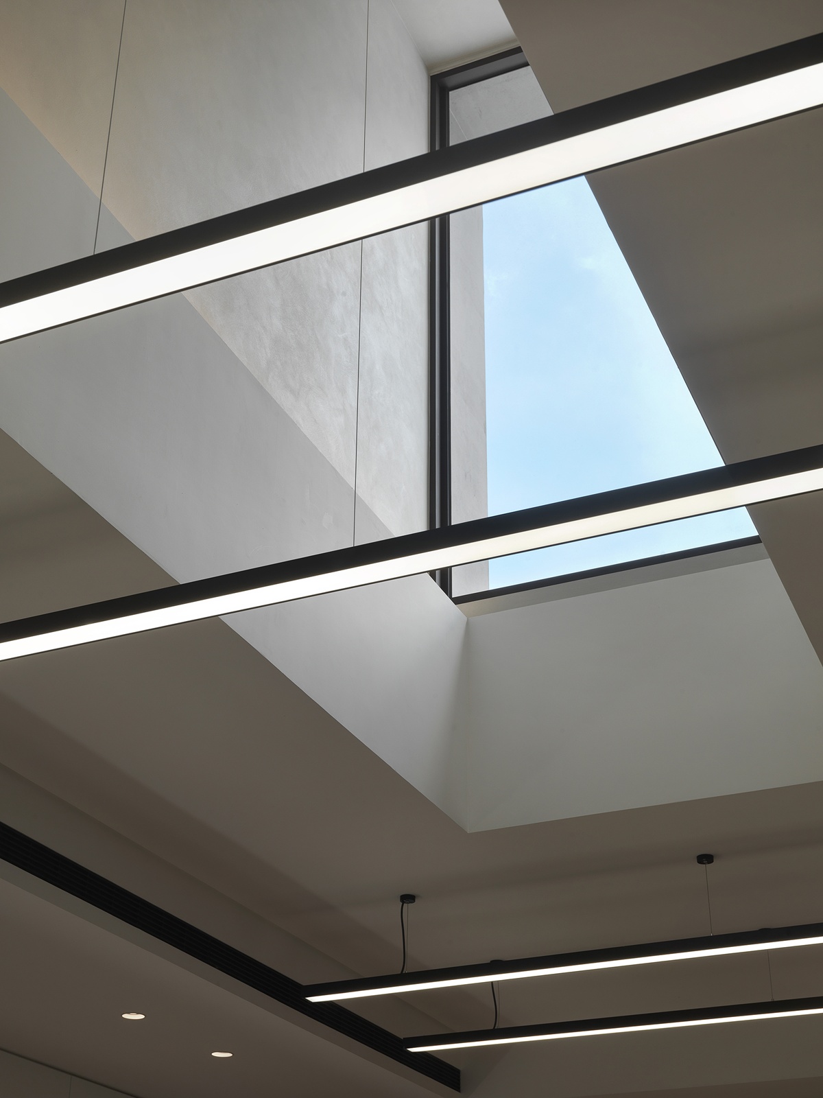 左右兩棟分別作為接待中心與辦公區,動線獨立卻在視覺上統一。接待中心集展演、洽談與展示於一體,空間以自然光引導參觀動線,強化品牌印象。辦公區則結合會議、輕食備料與日常工作空間,減少隔牆分界,創造通透、流動的環境。光影隨時間變化,建築猶如與人呼吸共生。