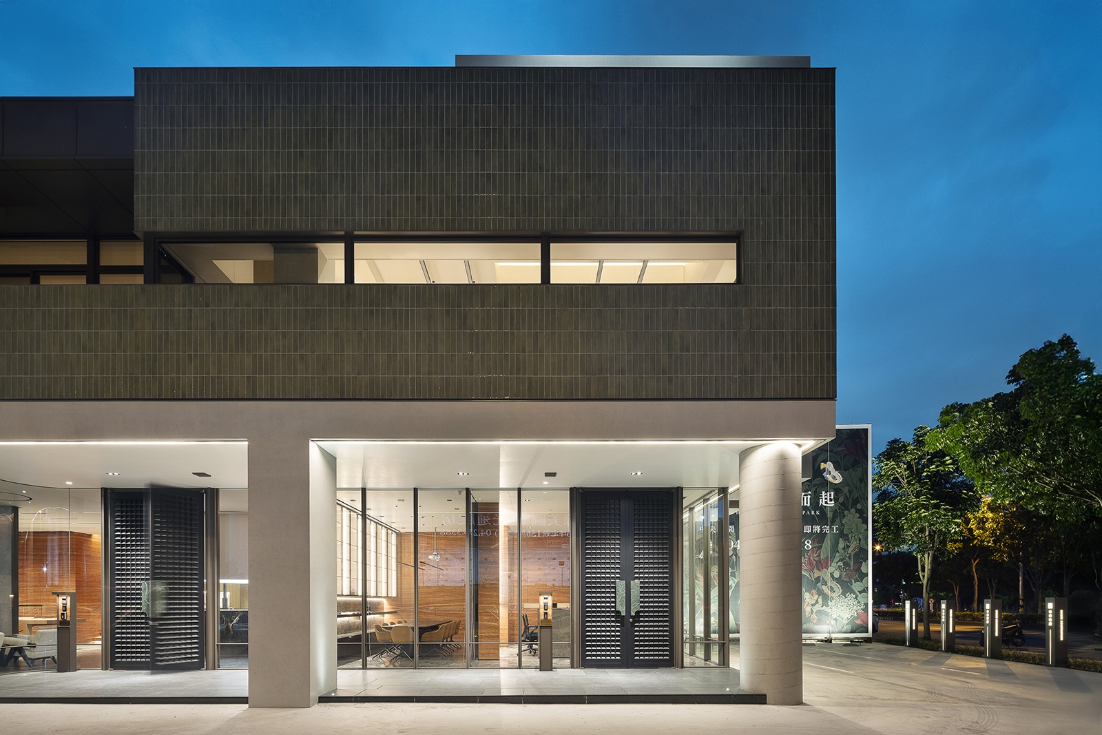外觀以方塊的切割與重組構成秩序性的立面語彙,呈現現代幾何之美。一層的水泥柱體搭配通透玻璃,讓紅洞石牆面鮮明映現;二層綠釉磚則形成明快對比,整體富含層次。量體高低起伏呼應城市天際線,營造理性結構中的柔性詩意。夜間透出的光線自由流動,使建築在城市中展現清晰、柔性的光影韻律。