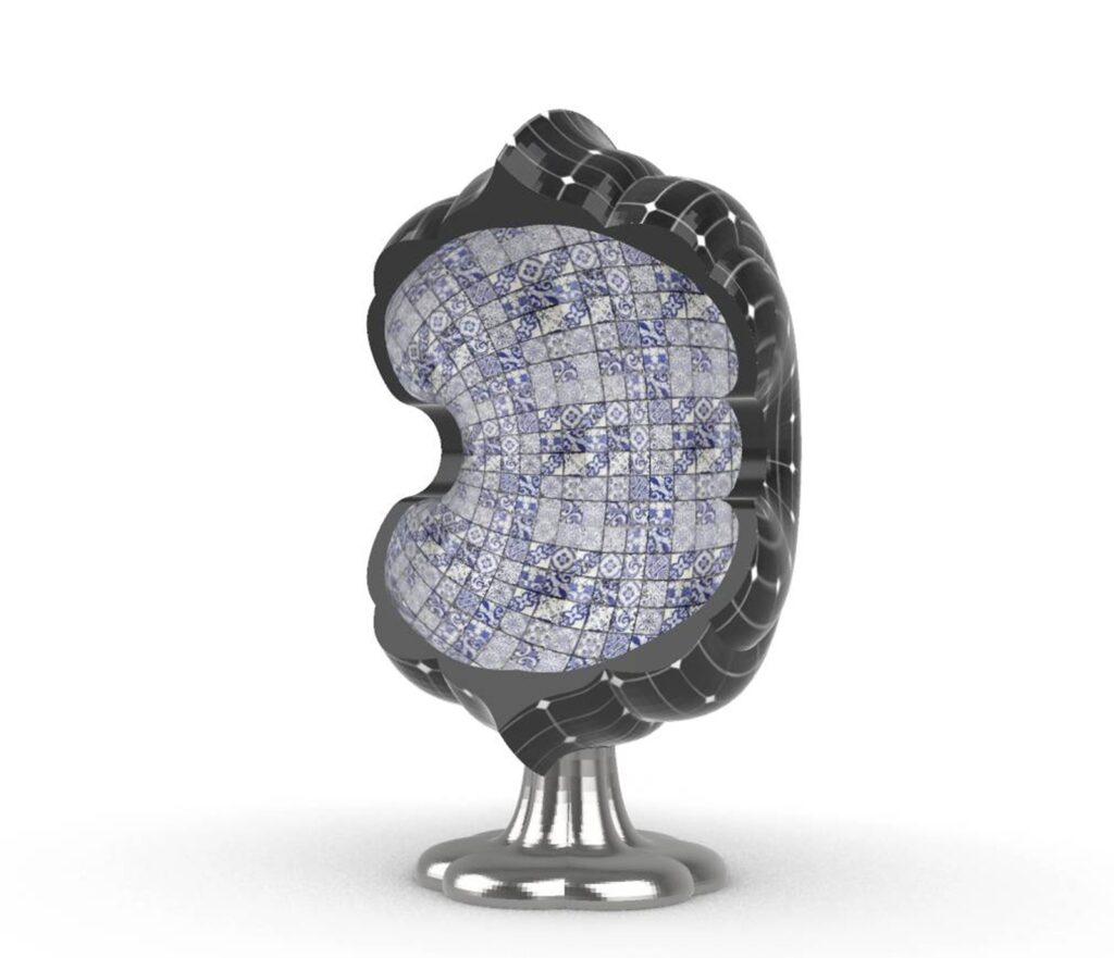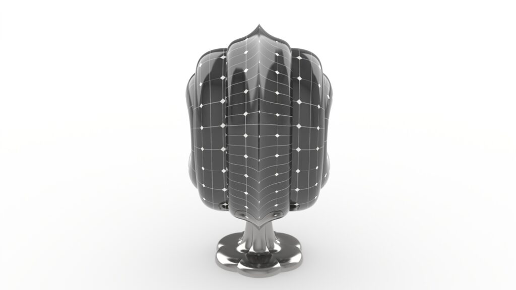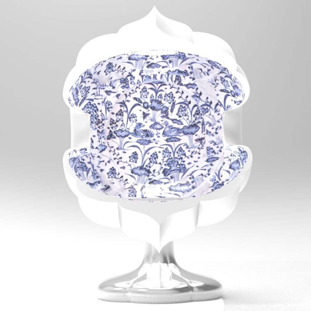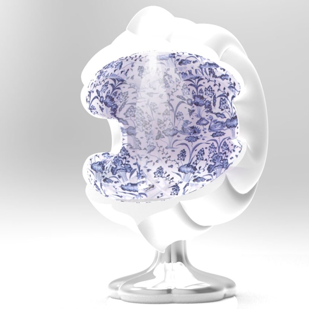 「開光如意椅」的外型設計巧妙地將二維圖紋翻轉為三維立體造型。設計師擷取青花陶瓷瓶上「開光」的曲線輪廓,以橢圓形軌跡進行旋轉,構建出具圍塑感的椅身和自然流暢的扶手造型。椅身內層綴飾青花圖紋,外層則鋪設太陽能板,兼具裝飾與機能。椅腳結構則將蒜頭型瓶身倒置並扁平化變形,設計成為獨特的支撐形式。主體選用不鏽鋼材質確保耐候性,椅腳表面施以電鍍金屬反射塗層,以提升太陽能板的光能收集效率。針對包覆性造型座椅上蓋,設計師以青花瓷瓶的「開光」概念演繹為現代的燈光照明手法,賦予實用加值的機能。