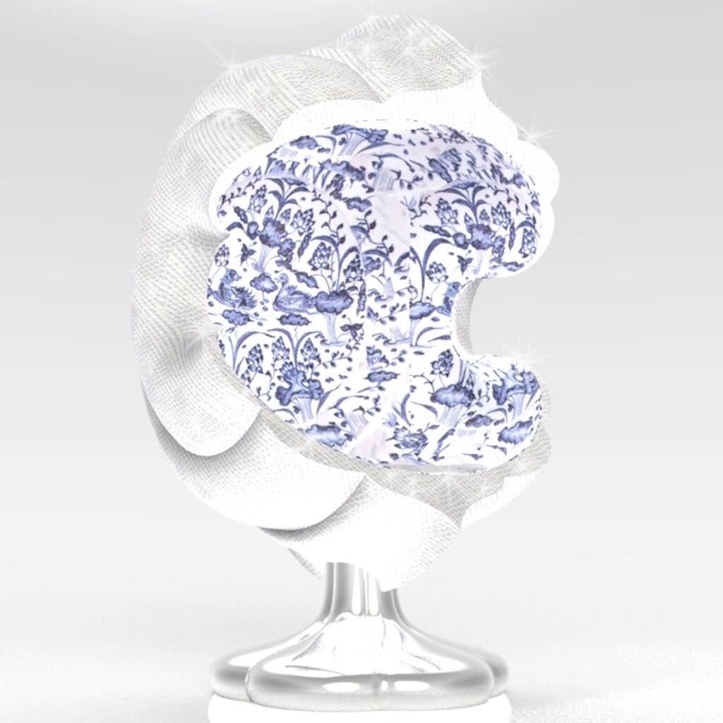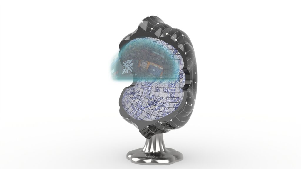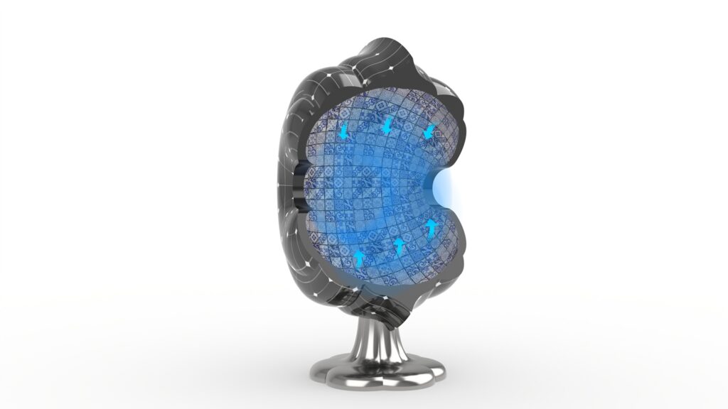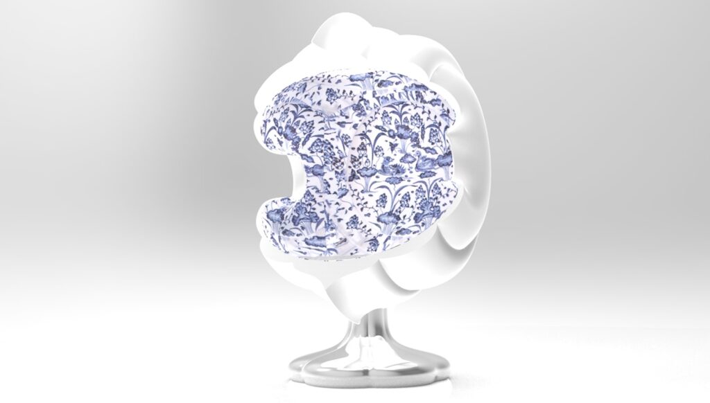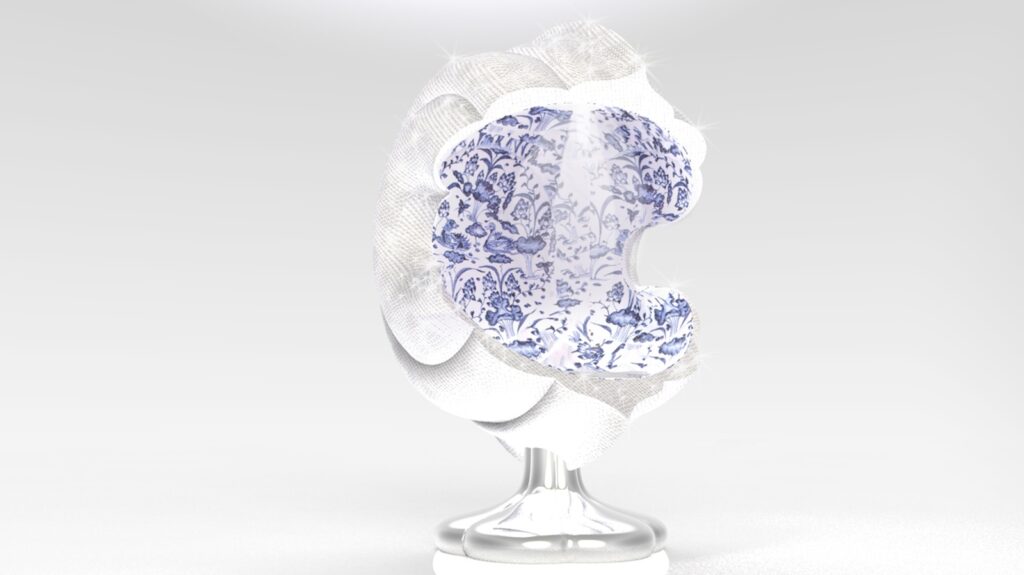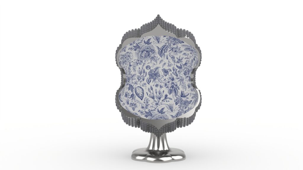 「開光如意椅」的外型設計巧妙地將二維圖紋翻轉為三維立體造型。設計師擷取青花陶瓷瓶上「開光」的曲線輪廓,以橢圓形軌跡進行旋轉,構建出具圍塑感的椅身和自然流暢的扶手造型。椅身內層綴飾青花圖紋,外層則鋪設太陽能板,兼具裝飾與機能。椅腳結構則將蒜頭型瓶身倒置並扁平化變形,設計成為獨特的支撐形式。主體選用不鏽鋼材質確保耐候性,椅腳表面施以電鍍金屬反射塗層,以提升太陽能板的光能收集效率。針對包覆性造型座椅上蓋,設計師以青花瓷瓶的「開光」概念演繹為現代的燈光照明手法,賦予實用加值的機能。