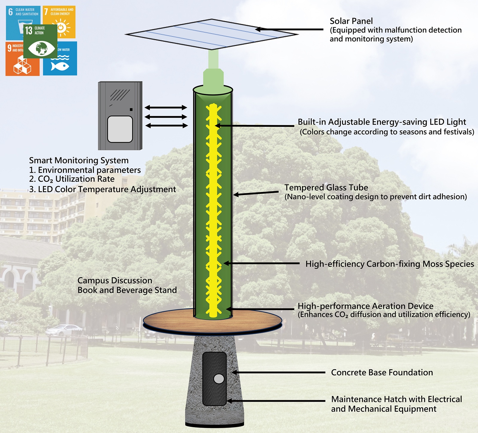 與傳統僅提供照明的路燈相比,智慧微藻捕碳燈多了一層「會呼吸」的生命力。透明綠色的培養柱在白天映照自然生機,夜晚則透過可調色 LED 呈現多變光效,晝夜皆成為城市景觀的焦點。藻體的翠綠色澤,是空氣品質的晴雨表,也是一座會呼吸的地標。燈體內壁採用原子層沉積(ALD)與KOH前處理,能長期保持高透光度,讓微藻始終展現生命力。再加上智慧監控調節光照與氣流,燈體得以長期穩定運作,不需依賴城市供電而達到自給自足。不同於市售景觀燈的靜態表現,它融合觀賞、教育與互動,展現城市與自然共生的象徵。