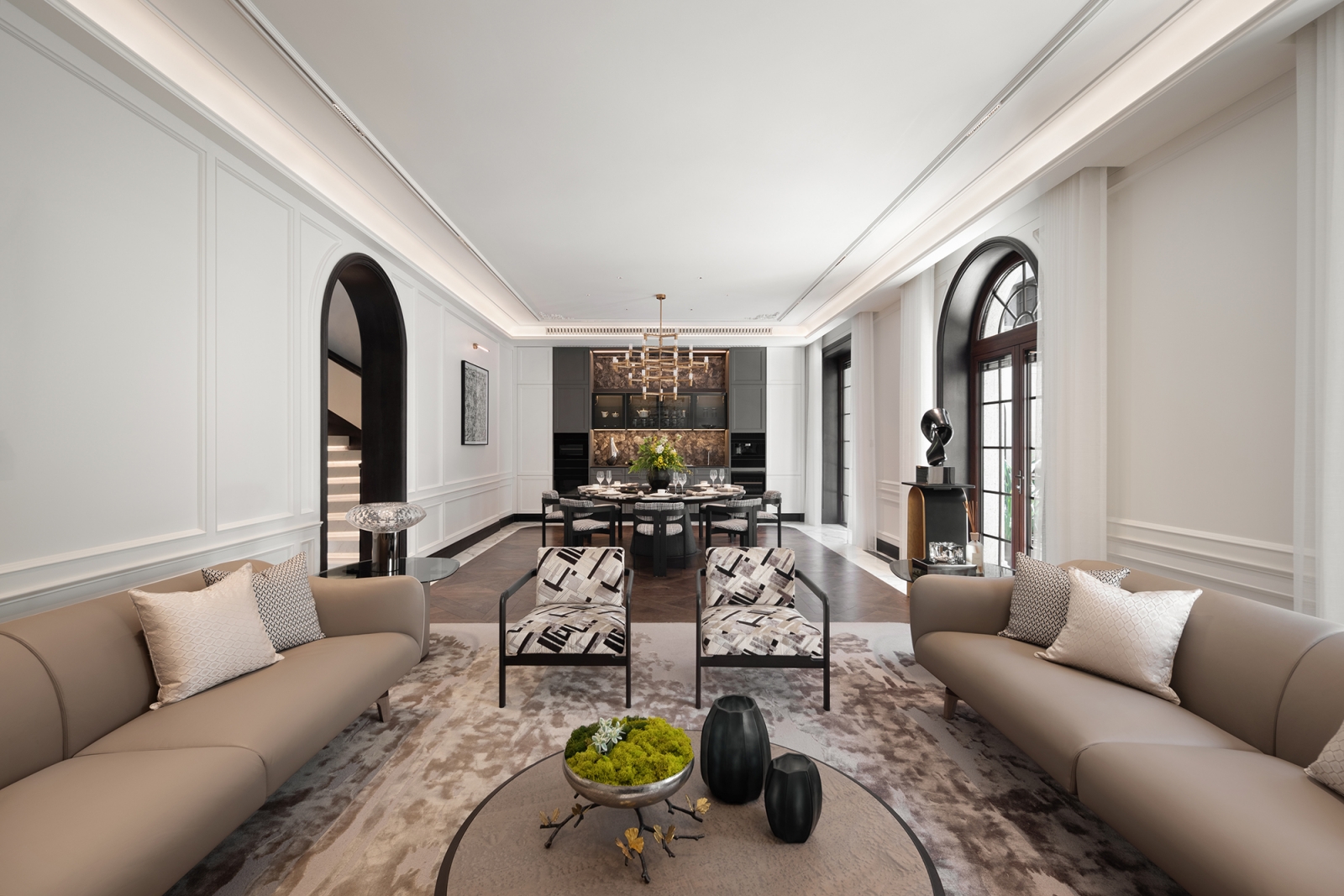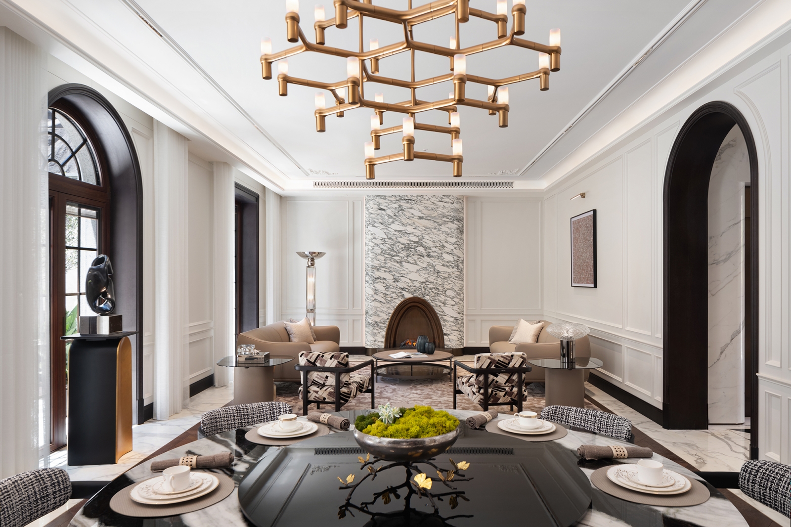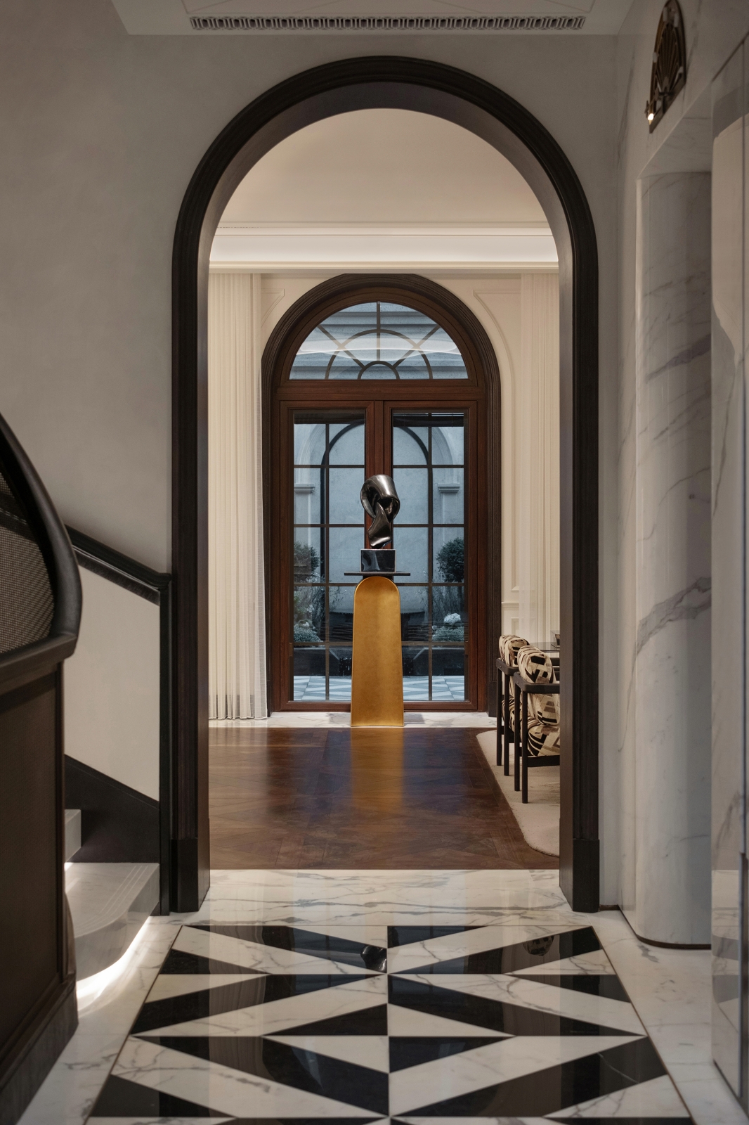 本案榮獲 2025 美國un設計大獎 un Design Award – 銀獎。本案位於上海核心地段,延續石庫門百年歷史與海派風華。團隊以融合與延續為題,保留中西交融的文化風貌,使傳統於現代藝術中綻放新姿。玄關以拱形結構引導動線,魚肚白大理石立面及黑白拼花地坪相互映襯,結合天花抽槽描繪出色彩層序,構築優雅的迎賓節奏與歸途儀式。懸挑樓梯下,水滴吊燈傾瀉柔光,光色相依和鳴,將生活幻化一曲浪漫樂章。