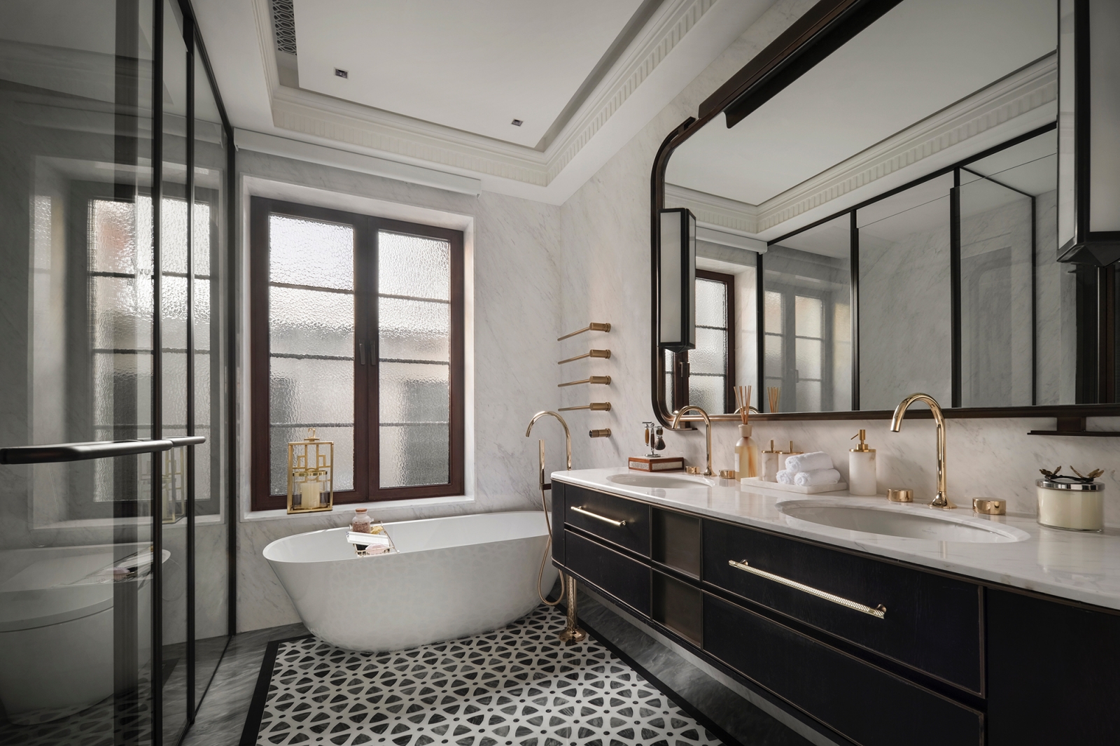 設計以生活機能為核心,藉精準動線串聯多重場域。廚房採德國櫥櫃系統,框形門板呼應屋頂弧線,花紋石材與玻璃櫥櫃相襯成景,於細膩規劃中凝練海派文化的雅致與底蘊。衛浴融入「綠房子」概念,於潔白基調裡綻放盎然生機。不僅如此,地下一層整合閱讀區、酒窖與雪茄室,藉隱藏式動線彼此銜接,兼顧社交流動與私密氛圍。