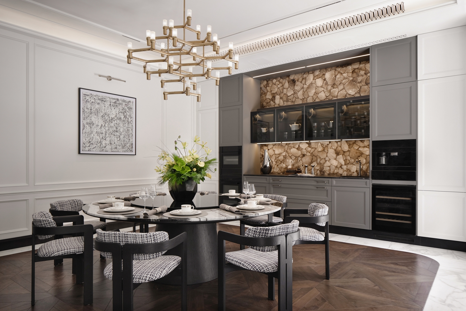 設計以旋律與藝術為構想,將日常轉化成空間曲調。客餐廳延續整體調性,以法式米白線板勾勒立面,結合凡爾賽木拼花地坪與石材肌理,營造古典與現代交融的場域韻律。起居室懸掛原創作品,運用藝術裝置串聯時光記憶,使空間成為情感延伸。臥室則採新法國海派風格,柔化空間色調和比例,於光影轉折間流露溫婉與詩意。