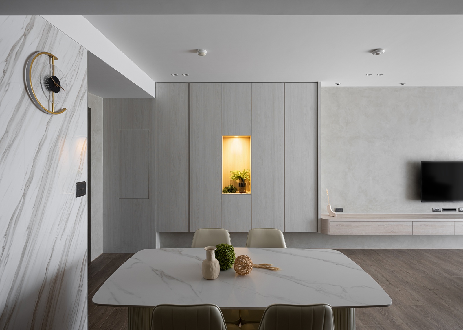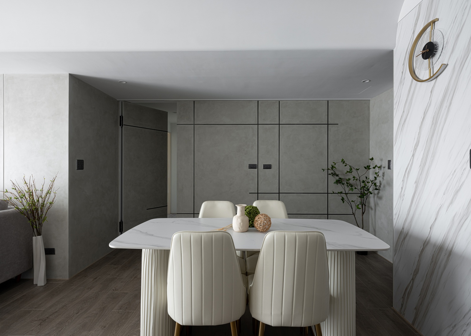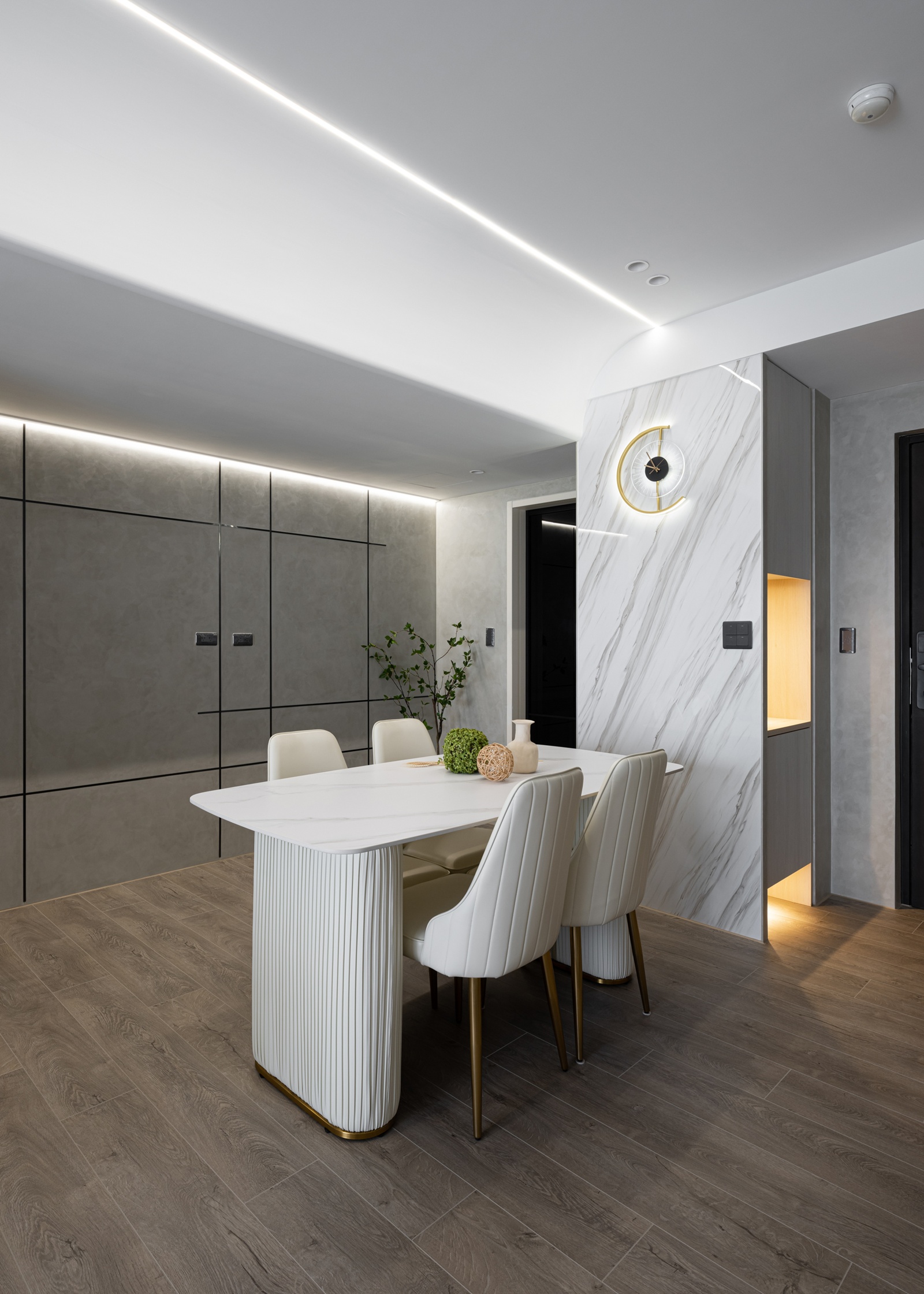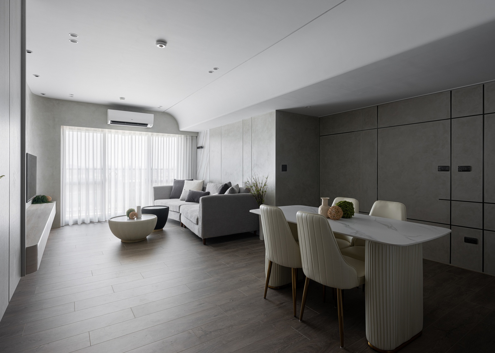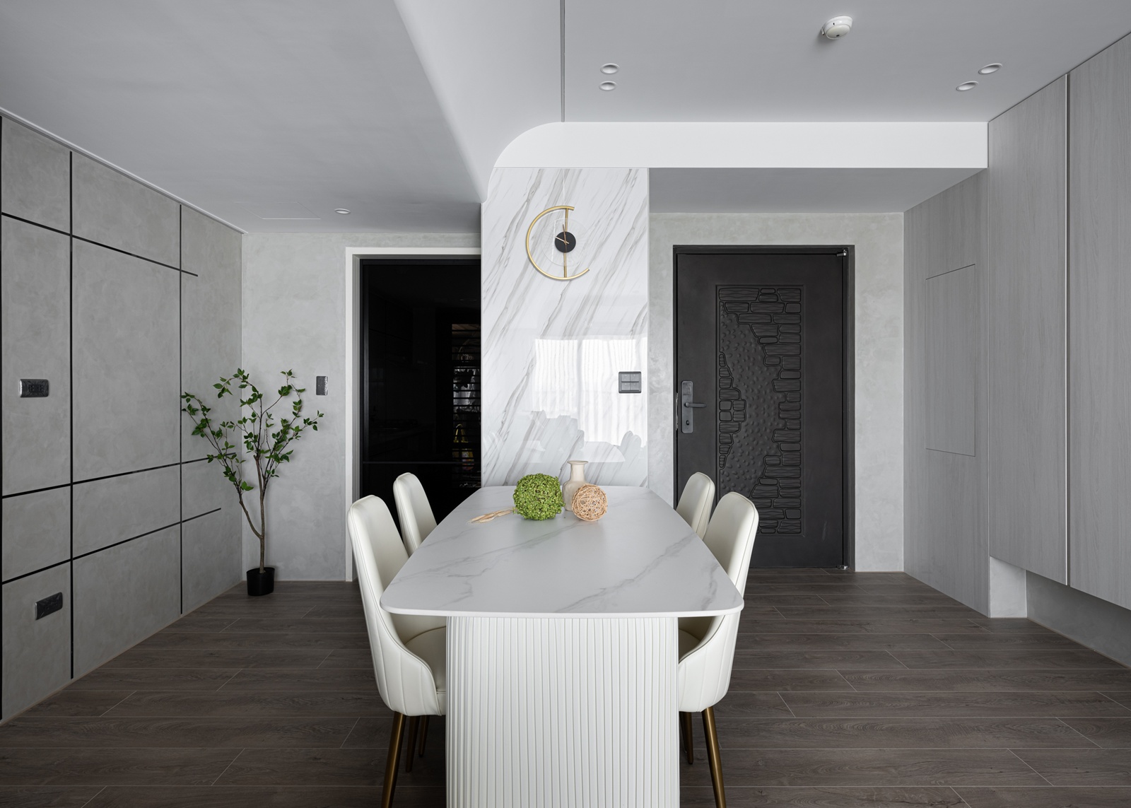 玄關區域兩側以淺灰木紋收納櫃引導動線,底部懸空並內嵌暖色線型燈,減輕視覺重量。客廳維持中性灰白色調,弧形電視牆與大圓弧天花板曲線降低結構壓迫感;沙發與大理石圓茶几的搭配,營造舒適與精緻的生活感。餐廳位於玄關與客廳交界,雪白大理石紋牆面成為視覺焦點,圓角餐桌與皮革餐椅強化共餐氛圍。旁側的黑色線條幾何分割牆面,體現Piet Mondrian對形式與秩序的致敬,隱藏式門片巧妙融入幾何分割,將動線開口隱於視覺秩序之中。臥室延續灰階清爽調性,衣櫃與書桌簡約而實用,開放展示架配合暖色燈光,家具配置延續幾何排列理念,營造休憩與閱讀兼容的舒適場域。