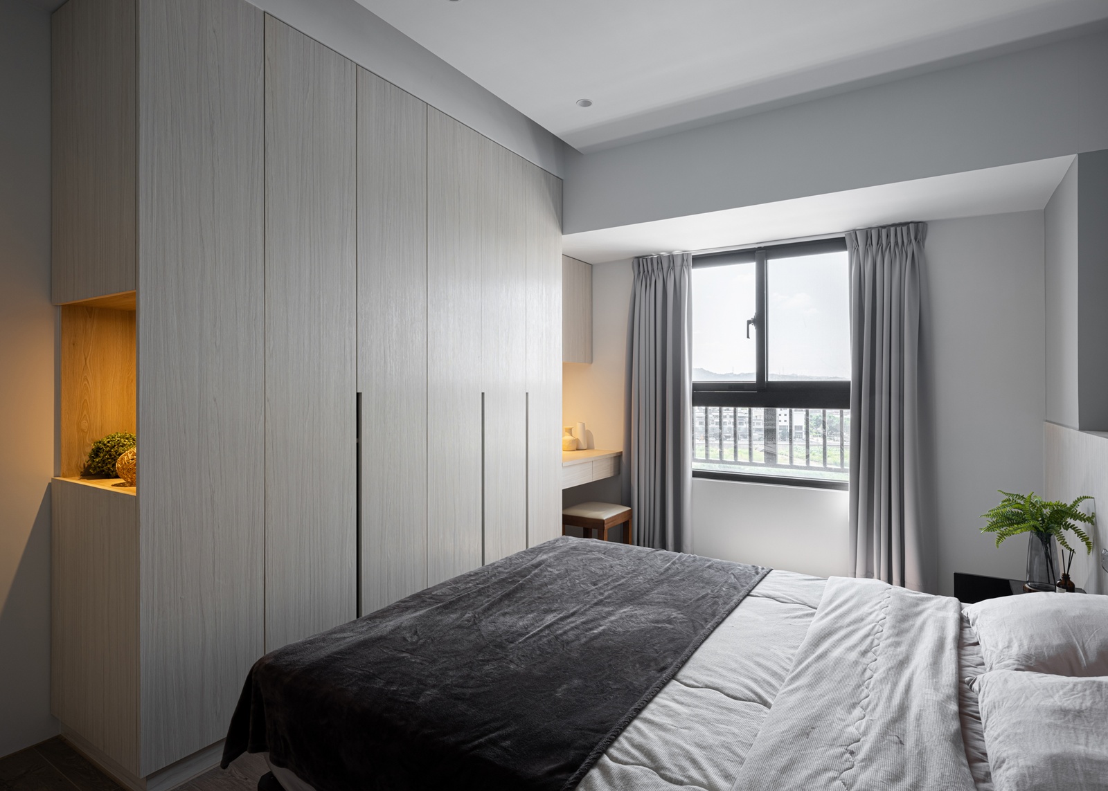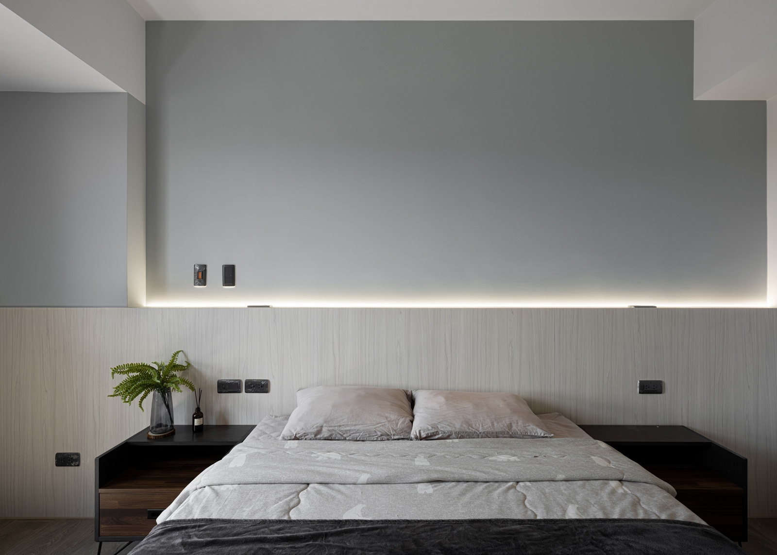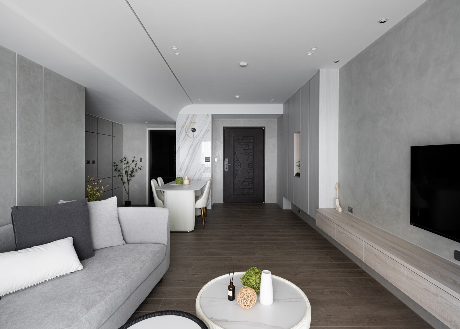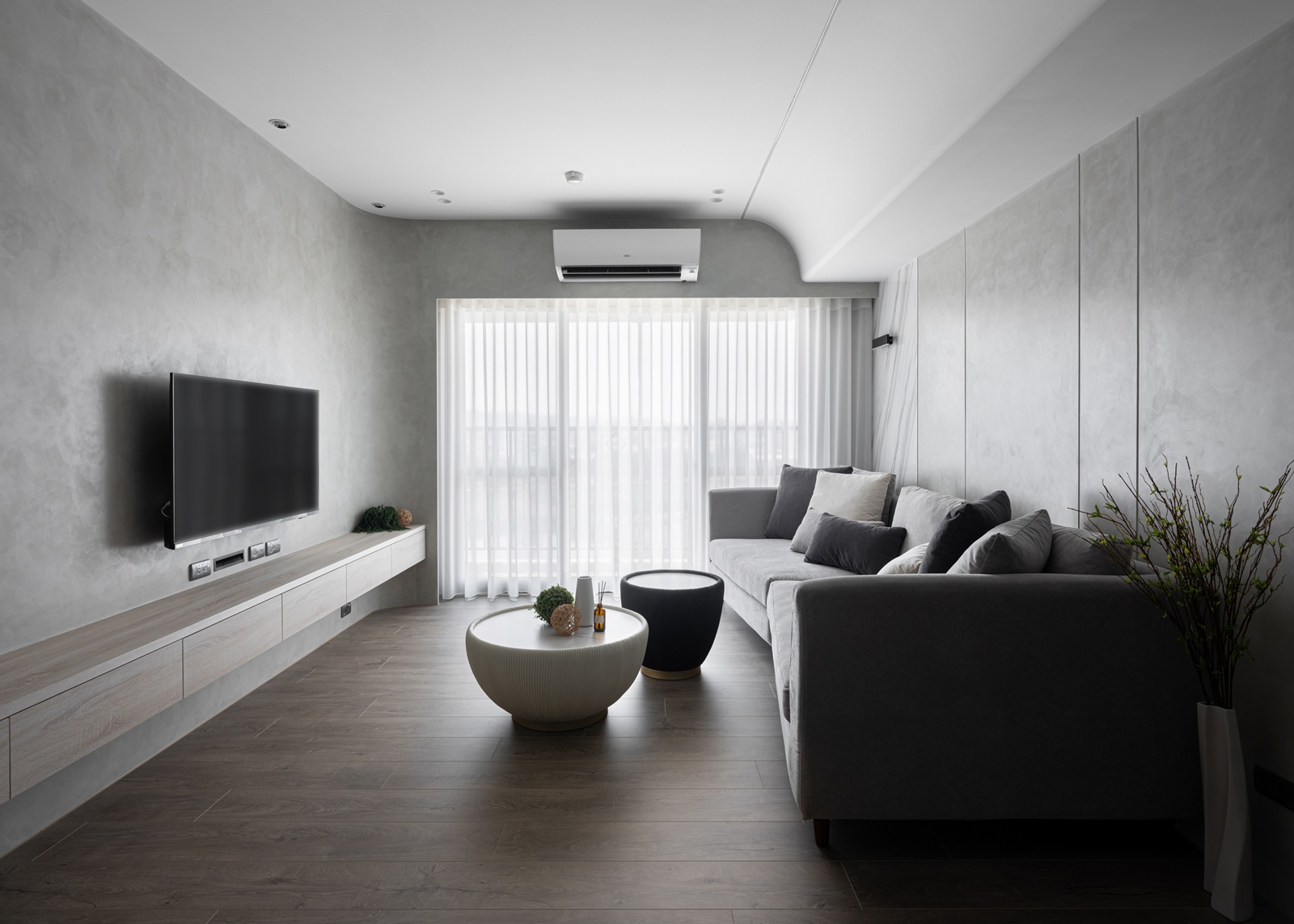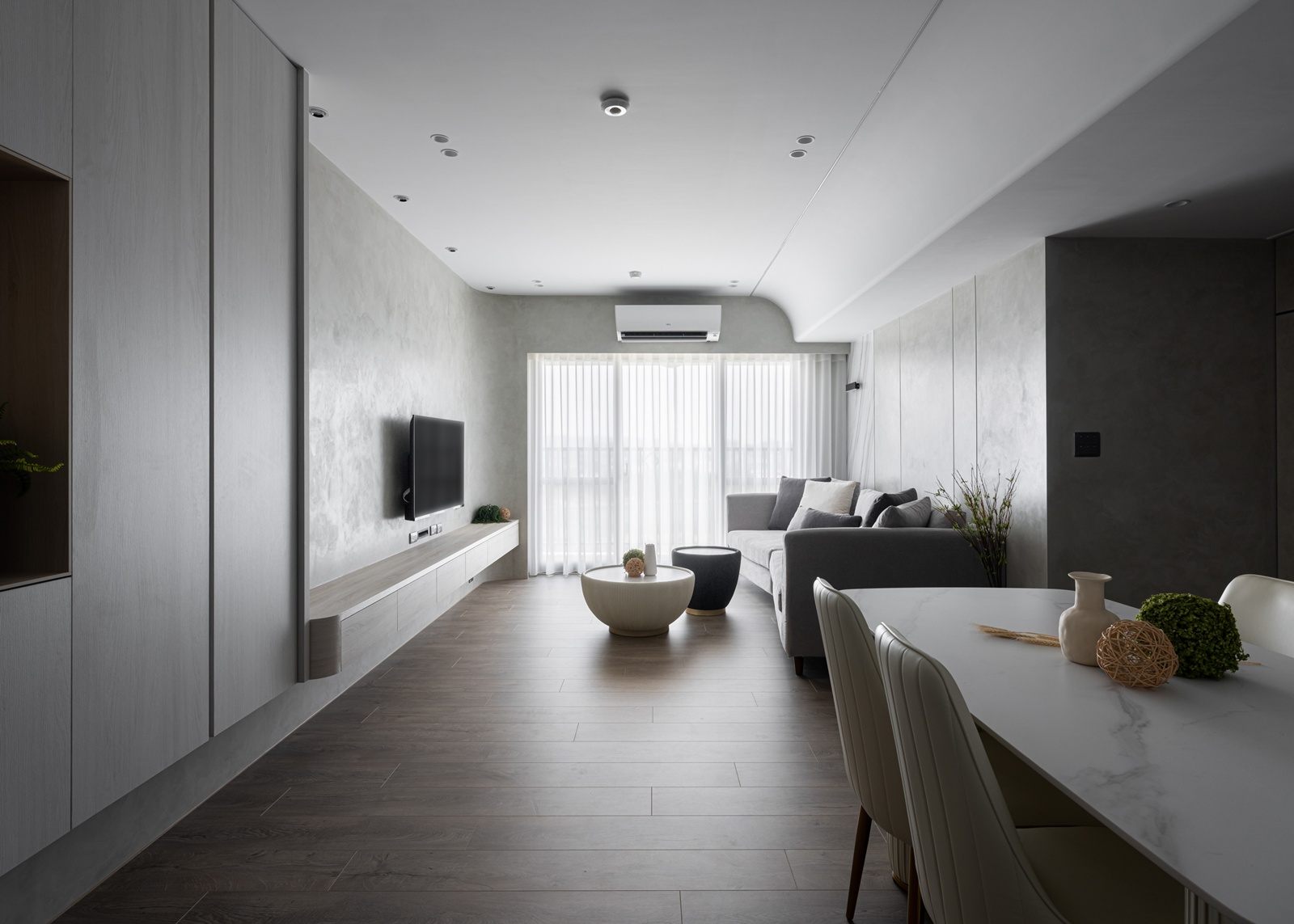 玄關區域兩側以淺灰木紋收納櫃引導動線,底部懸空並內嵌暖色線型燈,減輕視覺重量。客廳維持中性灰白色調,弧形電視牆與大圓弧天花板曲線降低結構壓迫感;沙發與大理石圓茶几的搭配,營造舒適與精緻的生活感。餐廳位於玄關與客廳交界,雪白大理石紋牆面成為視覺焦點,圓角餐桌與皮革餐椅強化共餐氛圍。旁側的黑色線條幾何分割牆面,體現Piet Mondrian對形式與秩序的致敬,隱藏式門片巧妙融入幾何分割,將動線開口隱於視覺秩序之中。臥室延續灰階清爽調性,衣櫃與書桌簡約而實用,開放展示架配合暖色燈光,家具配置延續幾何排列理念,營造休憩與閱讀兼容的舒適場域。