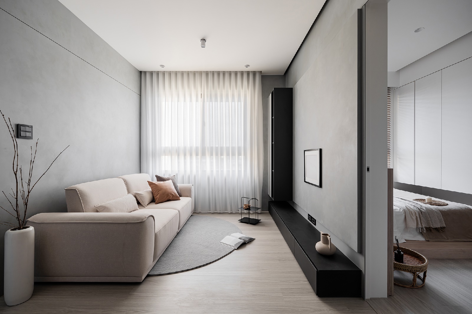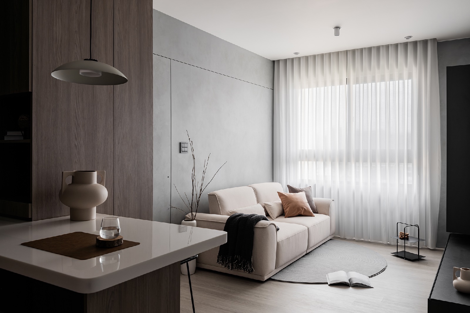 為構建出永續、高品質的住所環境,團隊精研場域佈局和材料應用。首先,留設公、私領域的對外窗,並採開放式設計擘劃公領域,讓單面採光的小坪數住宅亦能擁有充沛的自然光源。接著,全室裝設省電LED燈具,可大幅降低電力消耗,達到節能減碳的效果。另外,使用低VOC的義大利藝術塗料,兼顧空間美感與居住健康。