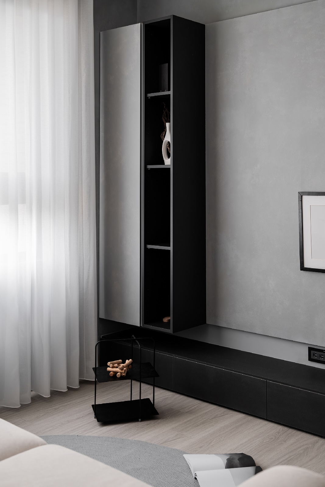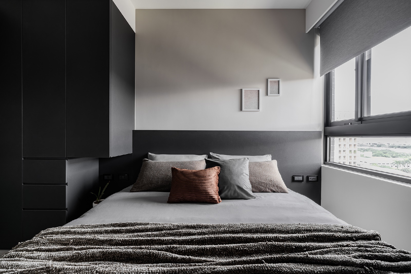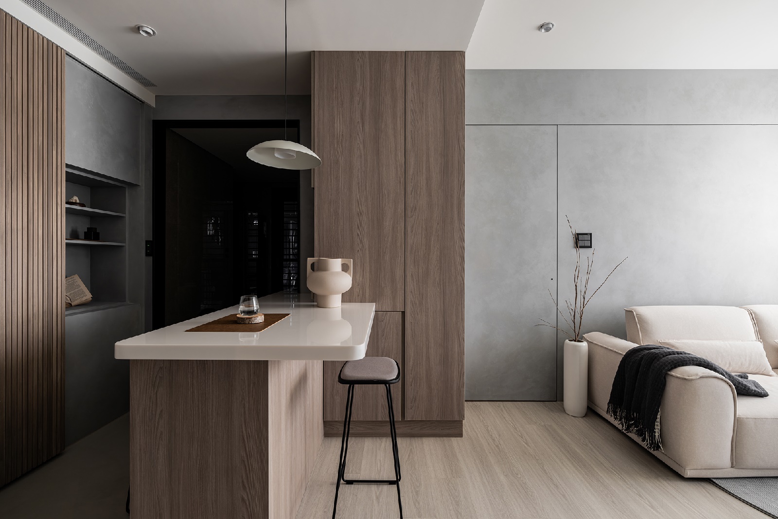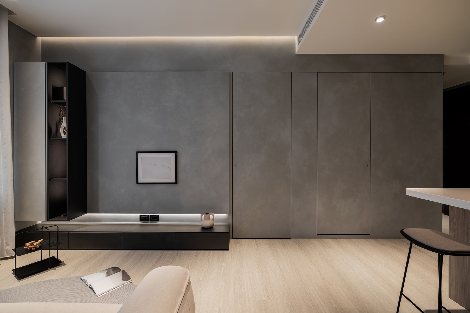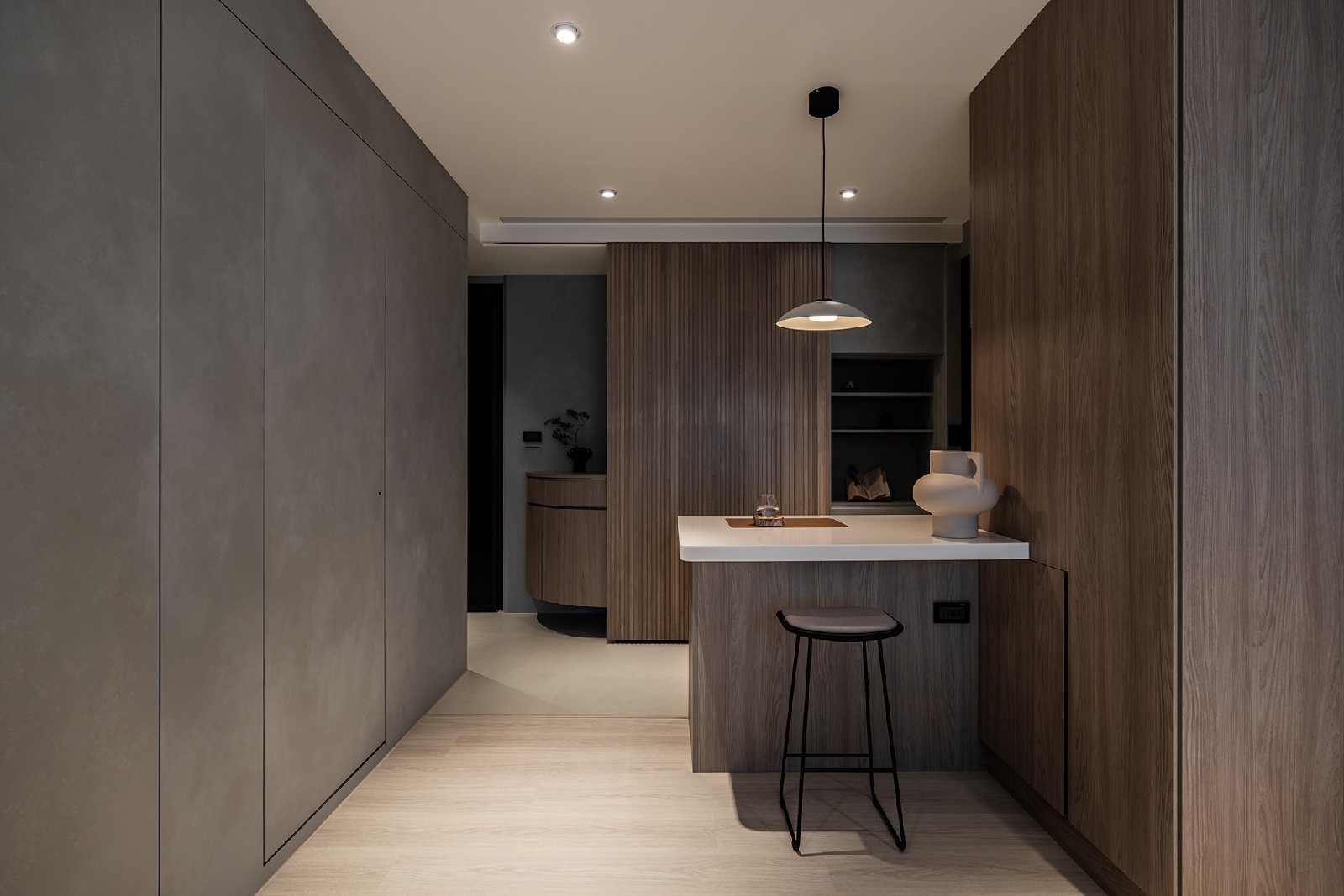 公領域的牆面主要是以灰色藝術塗料做鏝抹,再搭配燈光的映射,可增添視覺層次。而臥室與衛浴室的出入口是採暗門設計,能維持整體畫面的簡約俐落感。為了擴展住所可用空間,團隊特意將廚房原先的隔間牆拆除,並改為開放式格局。其中,臨近玄關、餐廳、廚房一側有設置展示櫃,且是以木格柵拉門作為櫃門設計,能兼具美觀與實用性。另外,考量到屋主欲在家辦公、用餐,團隊增設了中島吧台,並有將其與廚房既有的桌檯做銜接,以拉長空間視覺。私領域採雙主臥設計,且是依循男、女主人的喜好做規劃。一間以黑、灰色調為主、另一間以木質調為主,而兩間皆有設置充足收納櫃,可為兩人創造最適切的專屬空間。