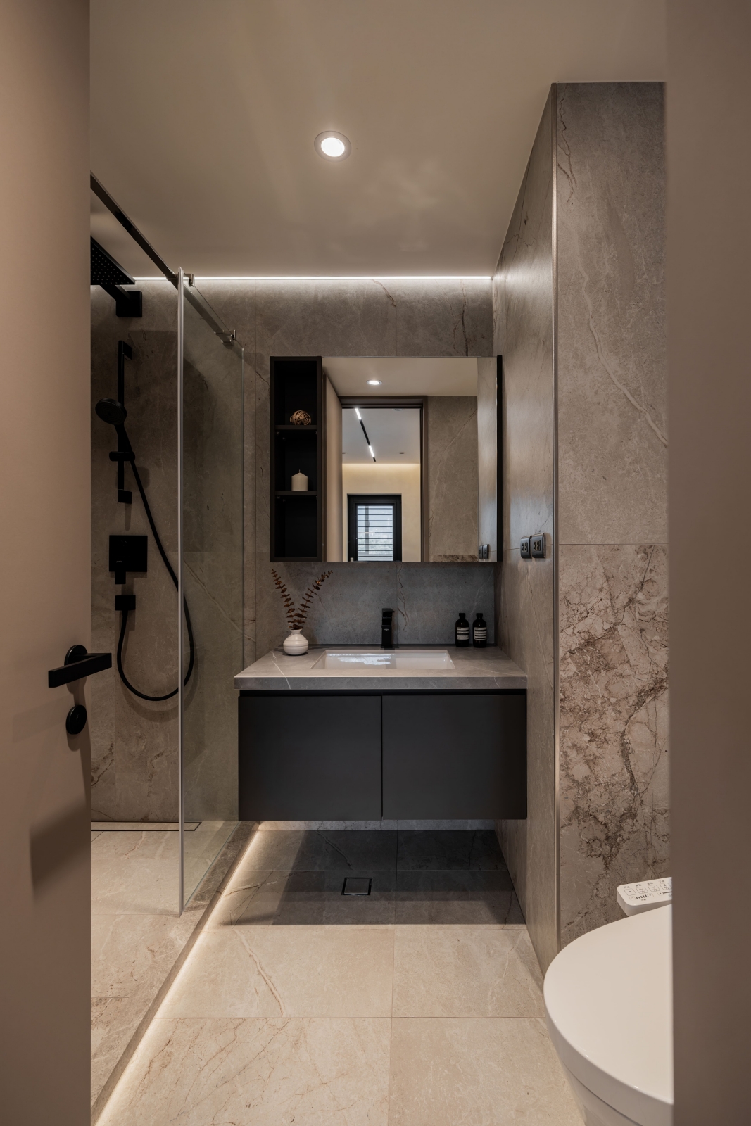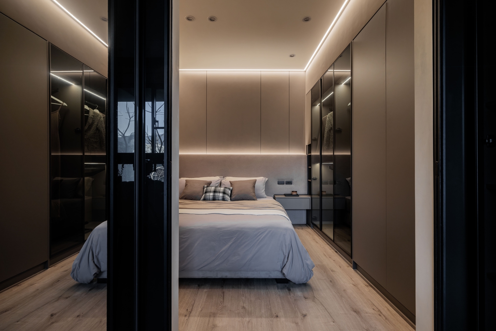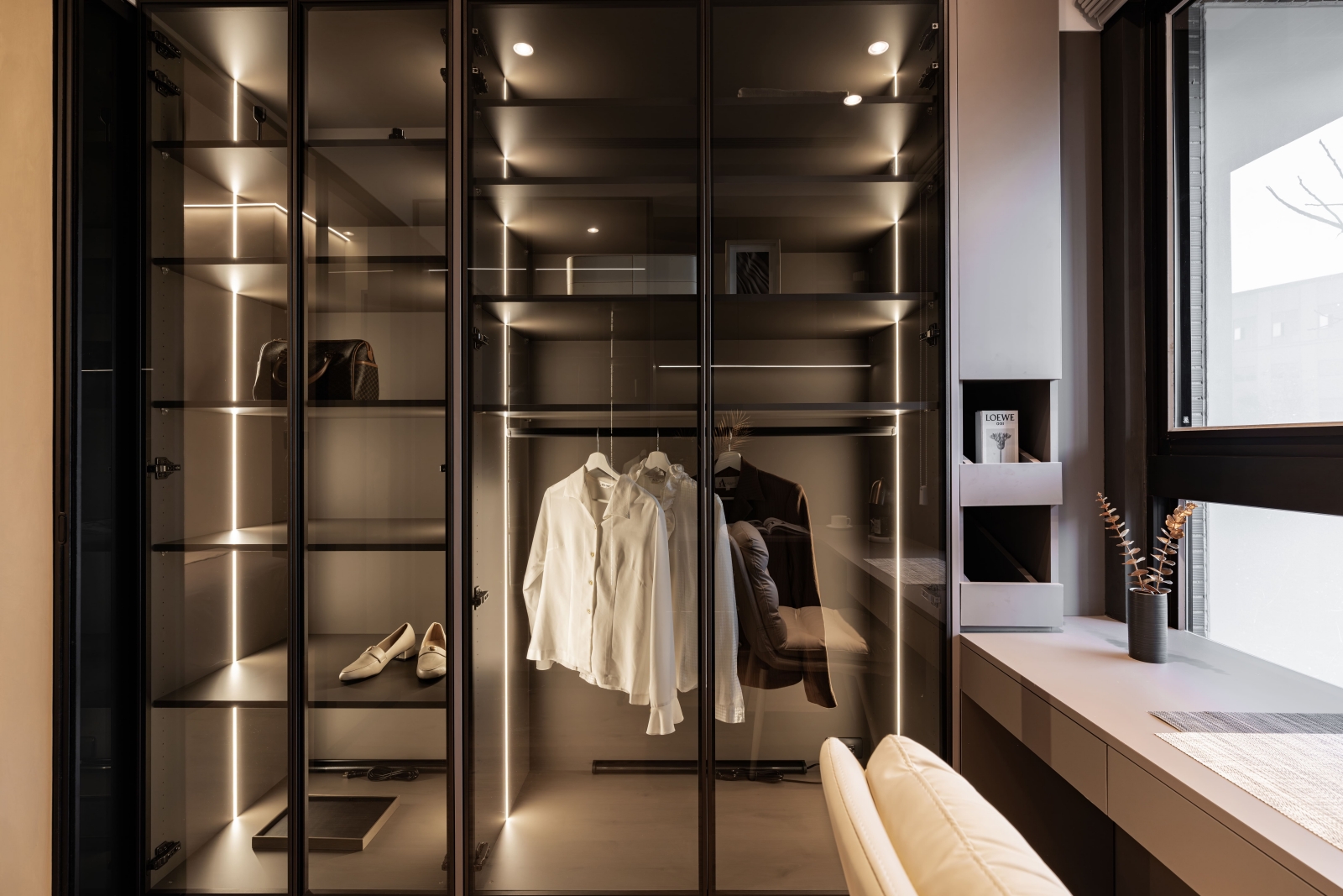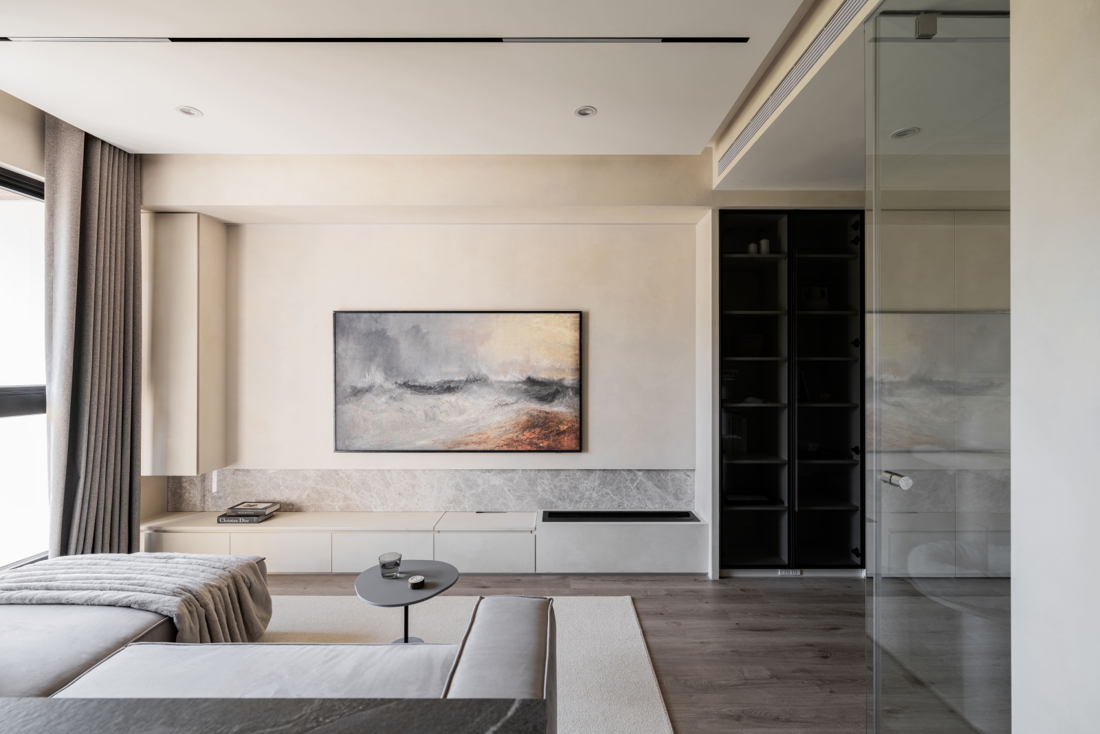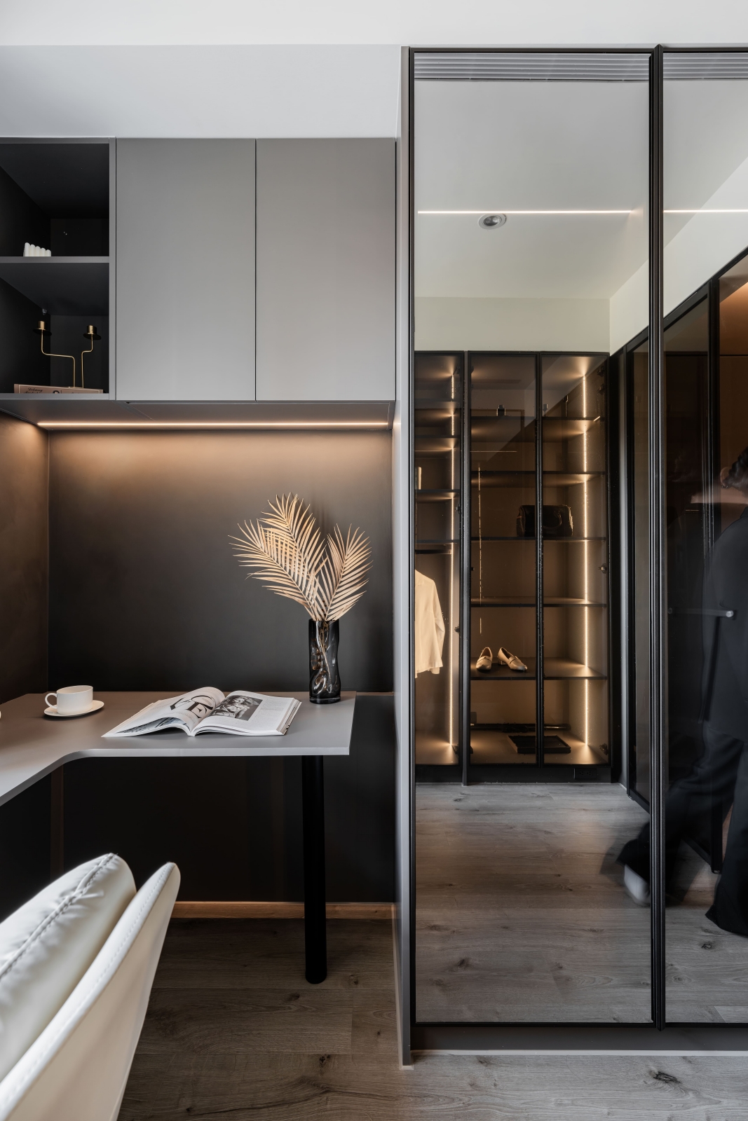 考量業主的使用需求,主臥整合了臥眠區與更衣室,並有設置以灰玻為櫃門的收納櫃,讓場域兼具功能性和通透性。而更衣室內設有L型桌檯,搭配鐵腳與開放式抽屜的設計,可滿足日常工作與存放保養品的需求。另外,衛浴室是選用大板磚鋪設而成,能形塑出高端飯店的質感。
