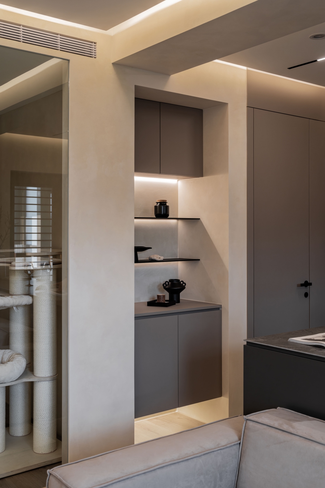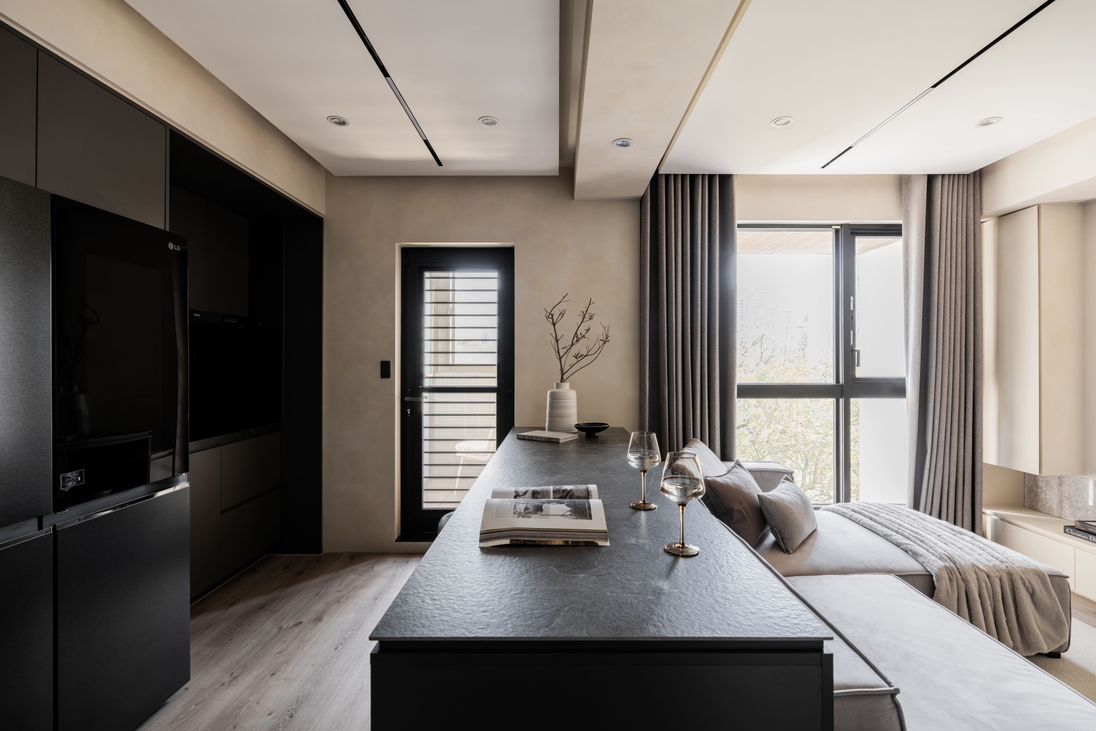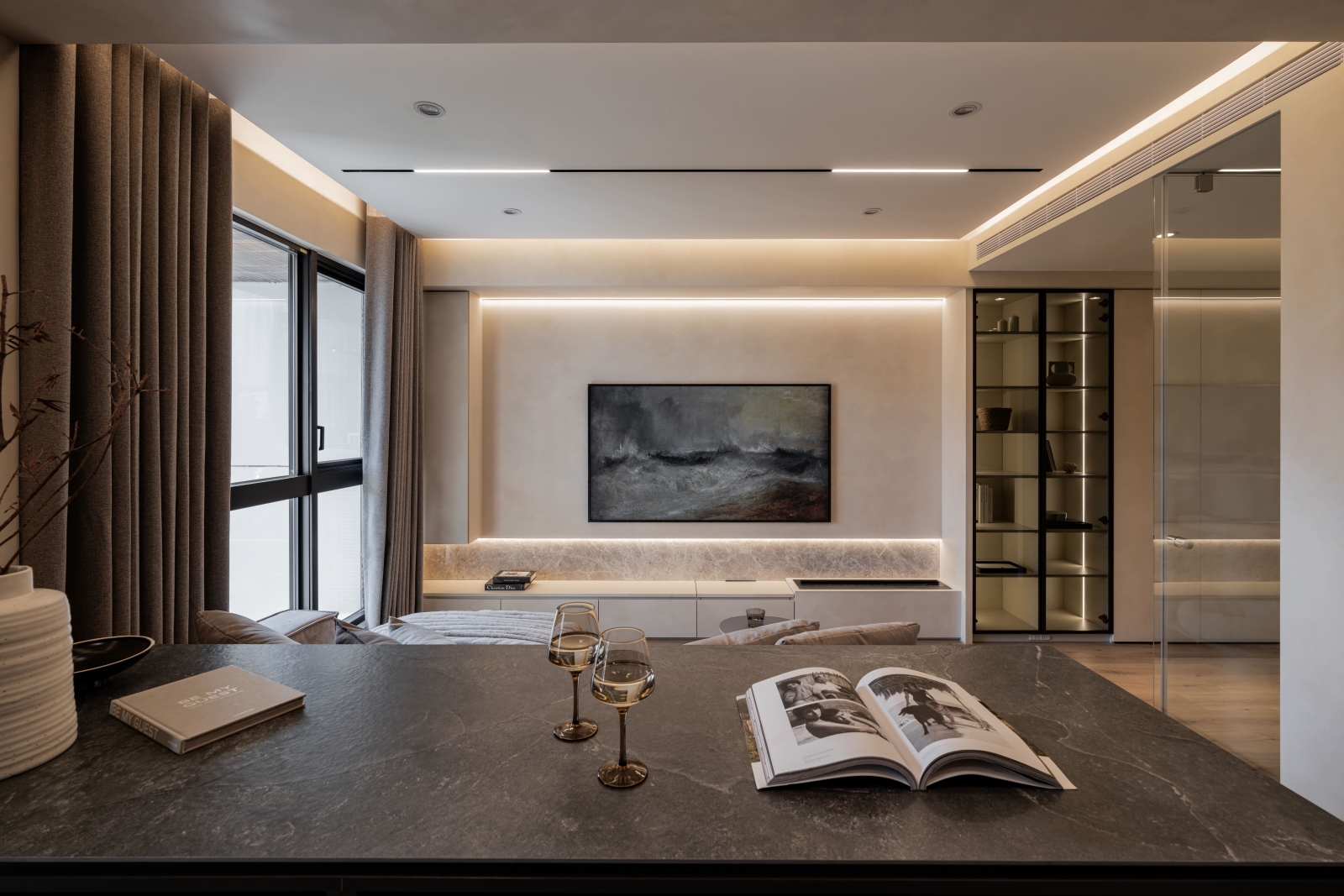 為擴展空間尺度,團隊特意將原先廚房的隔間拆除,並採用開放式設計整合客廳與餐廚區,讓業主享有敞亮的居住環境。其中,兩區天花板採漂浮式設計,搭配燈條照明,可減輕視覺壓迫感。而電視牆亦延續相似概念,以局部內凹、石材與燈條設計,創造出層次與懸浮感。餐廚區配置與沙發同寬的吧台桌,其內凹結構能放置吧台椅、收納櫃可存放電器設備。而臨近吧台區的畸零地則增設吊櫃與展示櫃,以提高空間坪效。