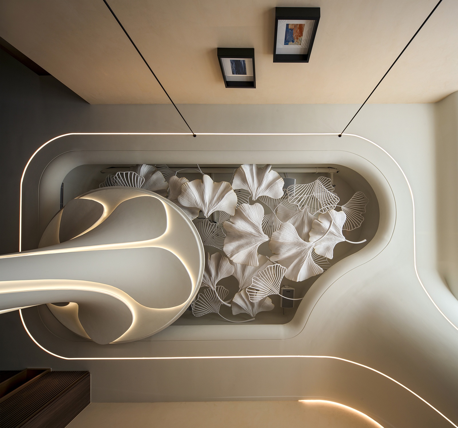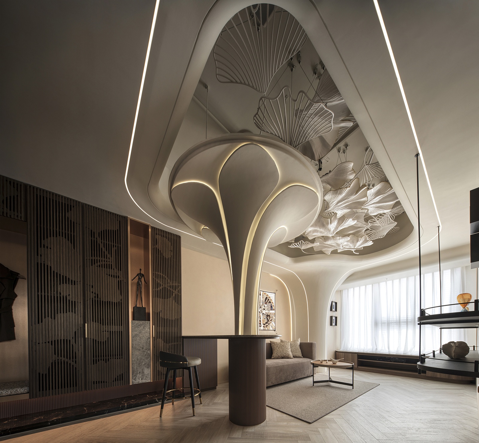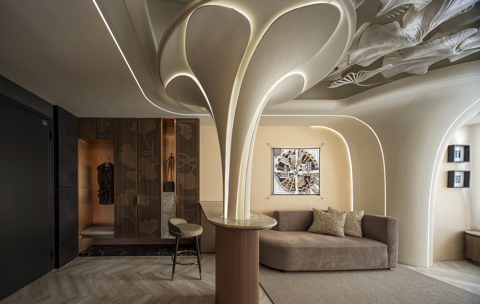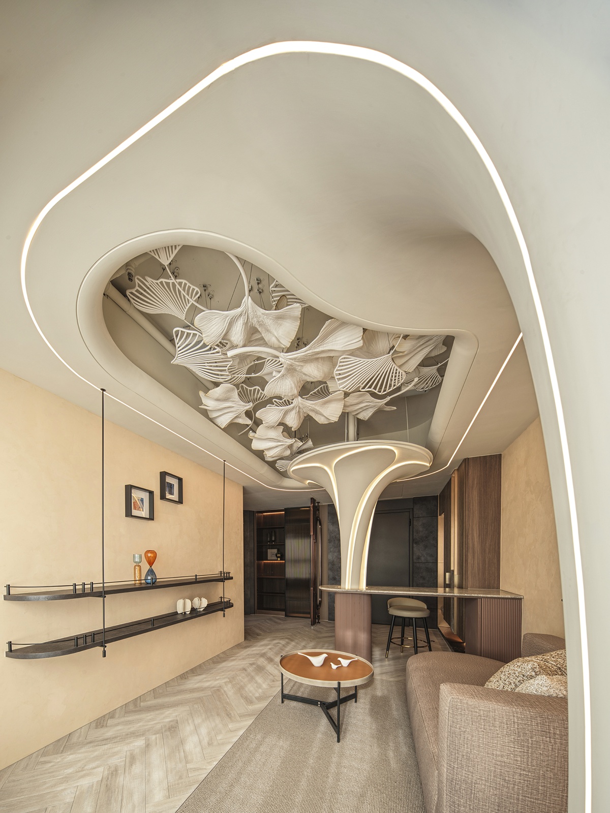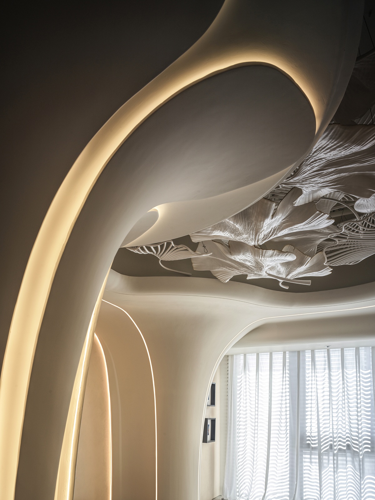 本案榮獲 2025 英國FADA未來藝術與設計獎 Future Art & Design Award UK – 金獎。如果說建築是冰冷的幾何,那麼本案設計便是對生活的浪漫頌歌。設計團隊從生活模式出發,讓住宅不受格局限制。手法以 GRG 作為主要素材,透過其可塑的特質,將結構雕塑出如大自然般流動的弧線與曲面。這份柔美曲線和浪漫氣勢升華了日常,帶來「完美時刻」的安居感。