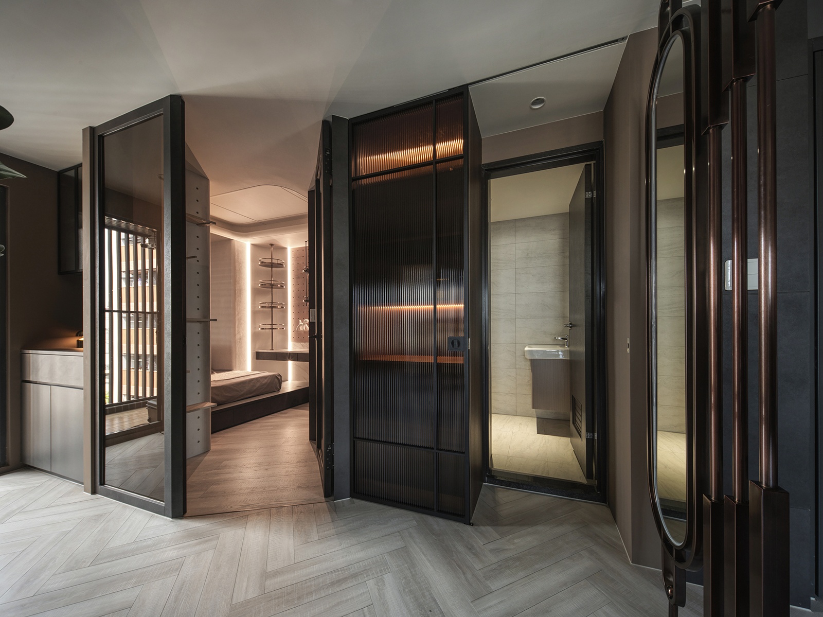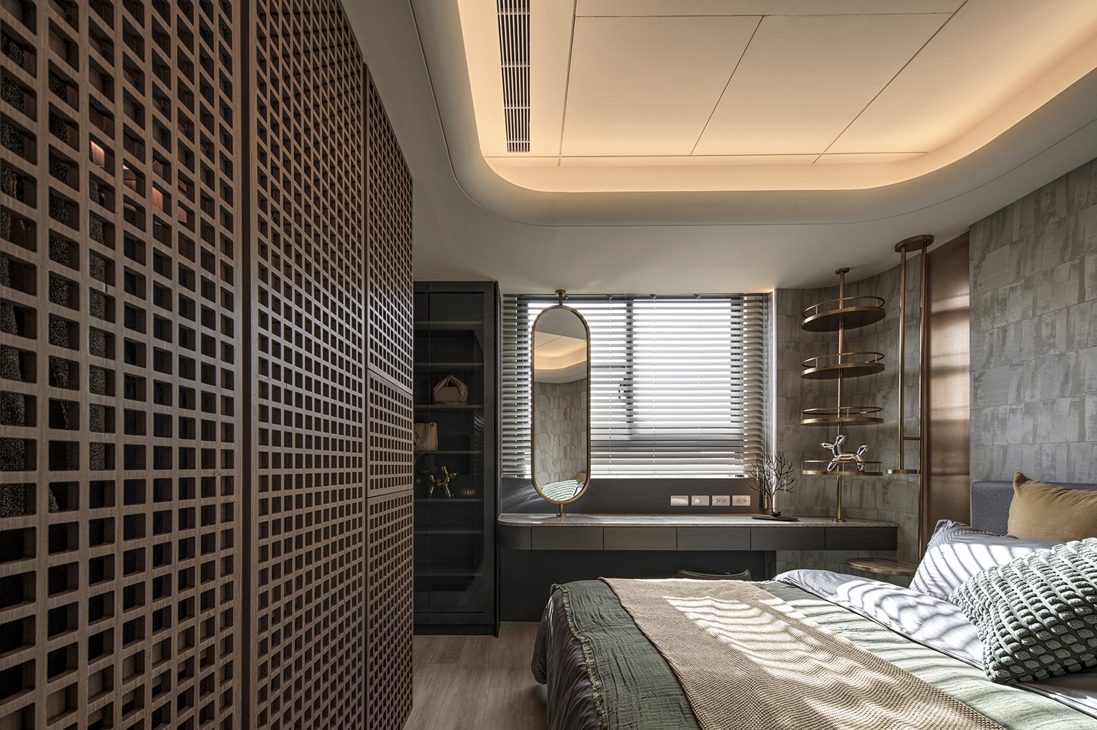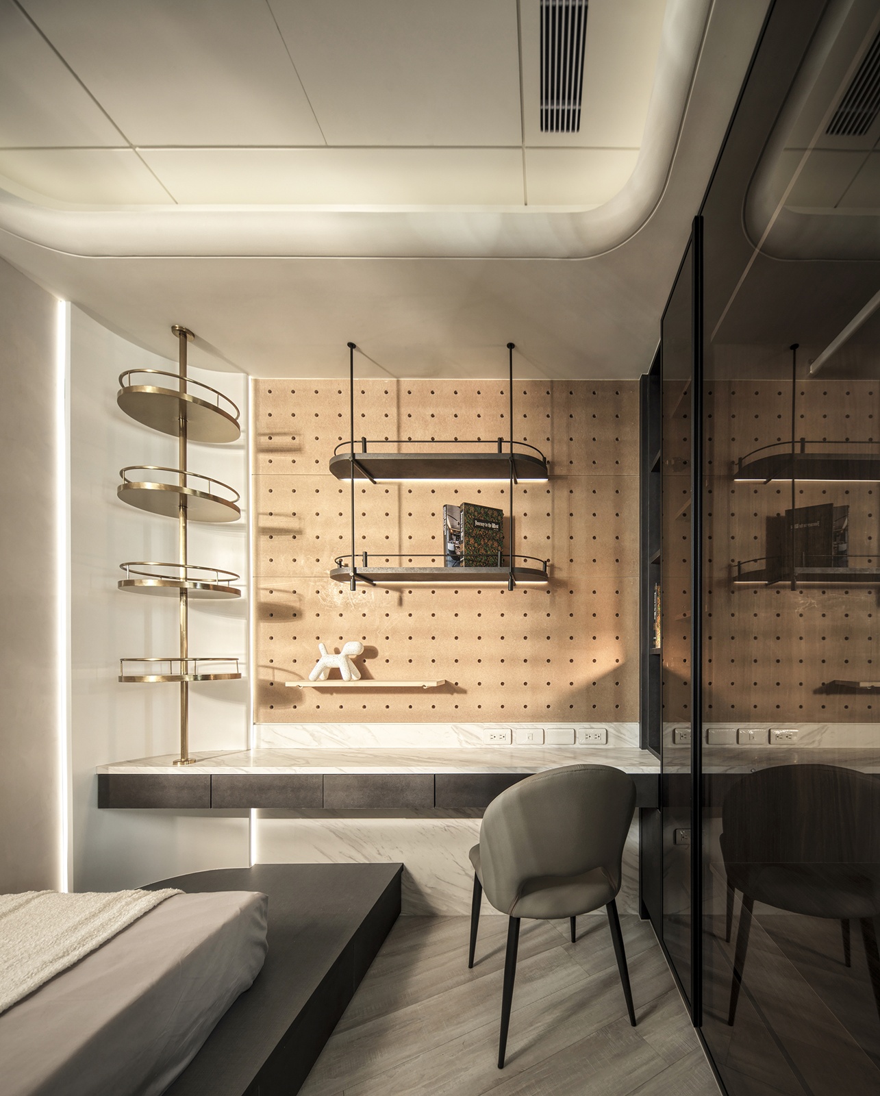 主臥隱身於客廳一側的隱藏門後,圓弧設計延續柔和旋律。CNC 鐫刻的衣櫃門片,透視且延展了空間感,內藏的燈光細節,則如林間光影般細膩。次臥則是多功能書房客房,茶色玻璃的穿透感帶來輕盈感受,牆面採用如樹洞般多變的洞洞板,創造多重使用的可能。