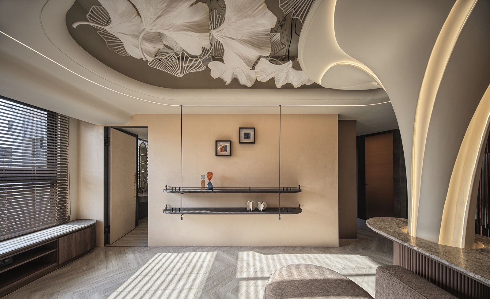 甫入門,一座 GRG 藝術雕塑如銀杏樹林般舒展,這片「銀杏之森」不僅作為玄關的端景,更成為玄關、餐廳、書吧與客廳等四大公領域間的靈魂連結。弧形的壁連天造型向上延伸,如林中交錯的枝幹,既模糊了場域的界線,又清晰劃分出不同的生活場景。考量風水和通風,動線經周詳規劃,讓後陽台的清風成為這座居所的自然呼吸。公共區域不設制式電視牆,而是配置大面積投影布幕,提供多元的使用模式。