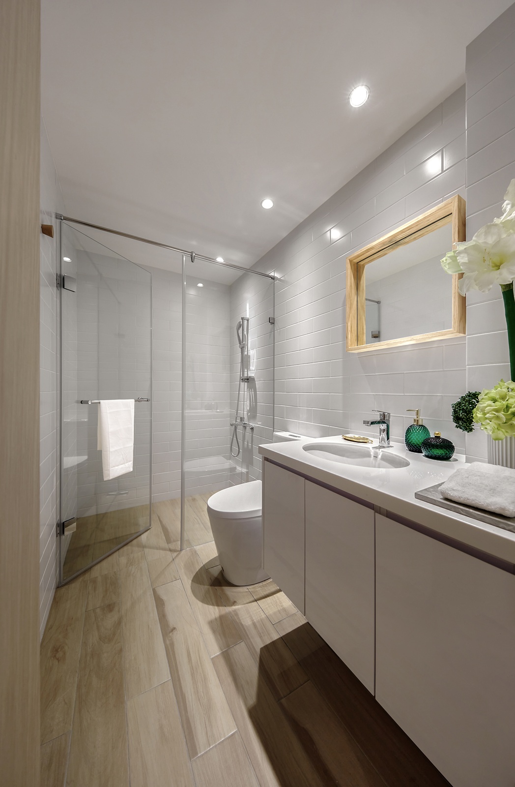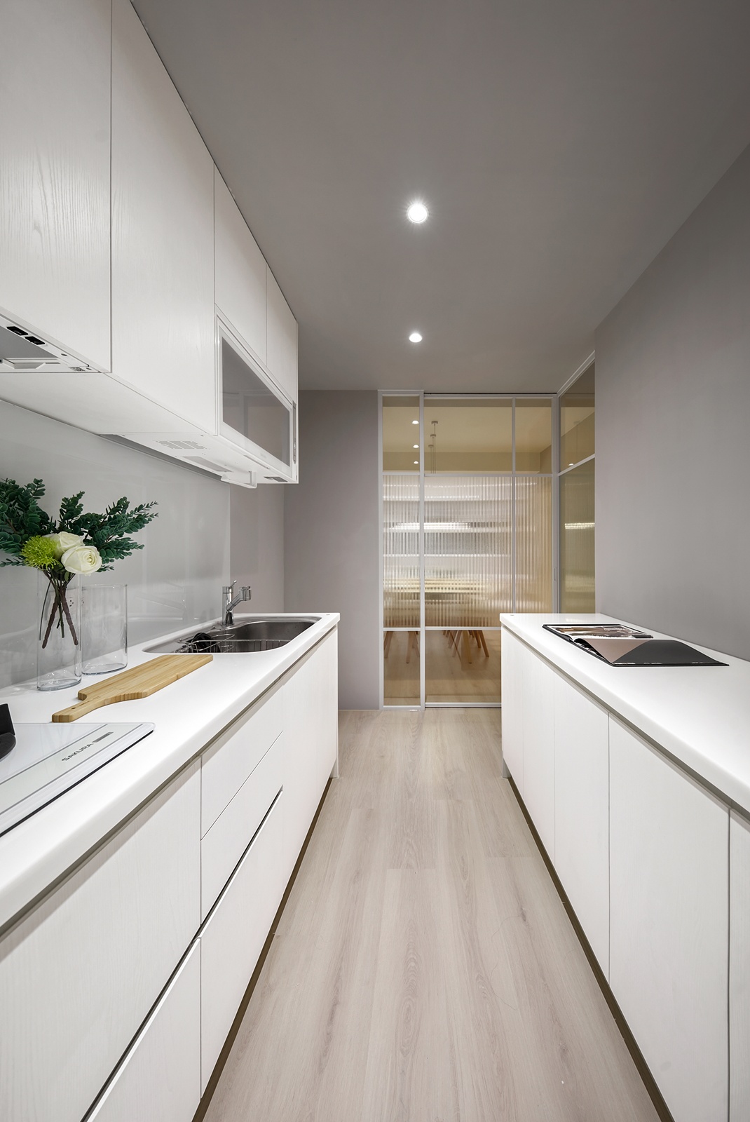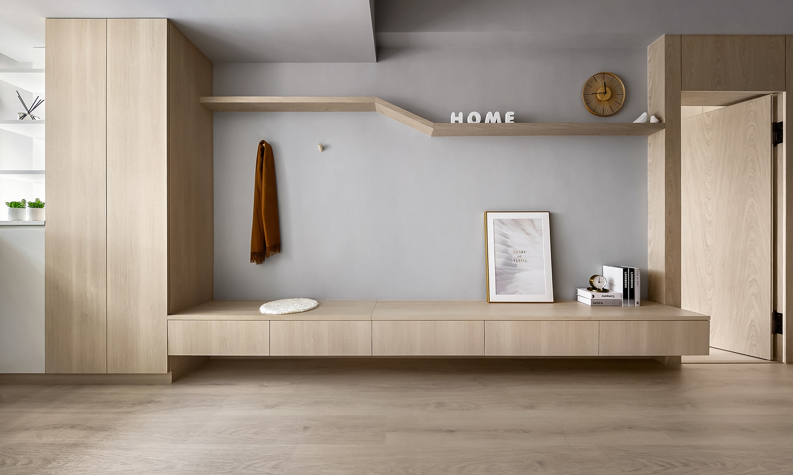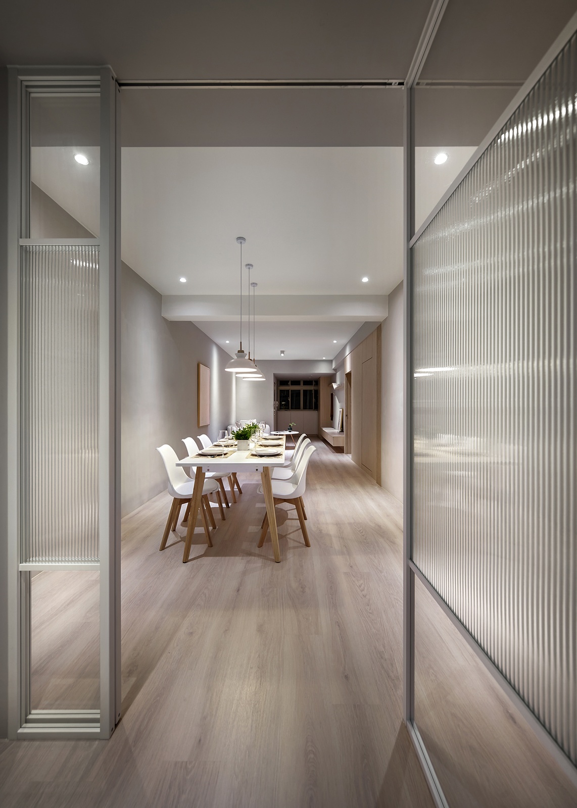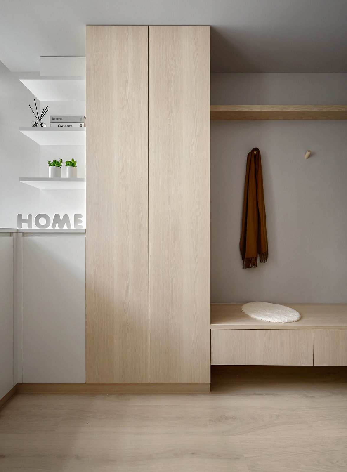甫入室,團隊善用畸零地,將其規劃為落塵區,讓人進屋時能有個緩衝空間。來到公領域,團隊是採開放式設計整合客、餐廳,以創造寬敞、明亮的空間感受。而劃分場域的方式則是利用預留層高與露樑的設計。置身於客廳,為營造和諧的視覺畫面,團隊特別選用了相同紋理的木質櫃體、層板與門框做呈現。其中,層板有配合樑柱結構做折線造型的處理;主臥則是有採取暗門設計將出入口隱匿於場域之中。向內走去,團隊在客廳與餐廳之間預留了兩米寬的留白區域,以此作為孩子玩樂的區域。此一規劃也使得夫妻倆不論置身於公領域的哪一位置都能照看到孩子,大大提升了安全性。此外,餐廳一側亦有預留3-4米的空間,以作為日後擺放收納櫃的區域,讓空間使用上更具彈性。通往至廚房,團隊拆除了原先的封閉式隔間,並改以玻璃拉門做界定。此舉不僅能增加室內採光,還能避免烹調時油煙逸散的問題。緩步移動至衛浴室,為延續公領域的地坪造型並兼顧防水效果,其地板是以木紋磚做鋪陳。