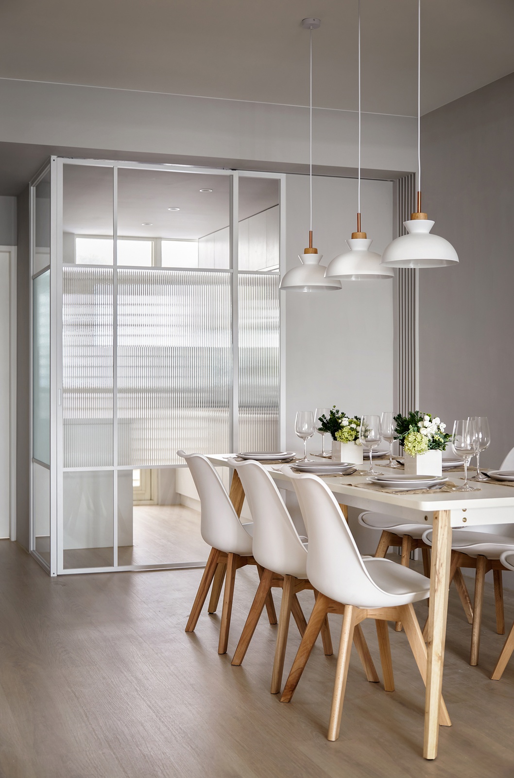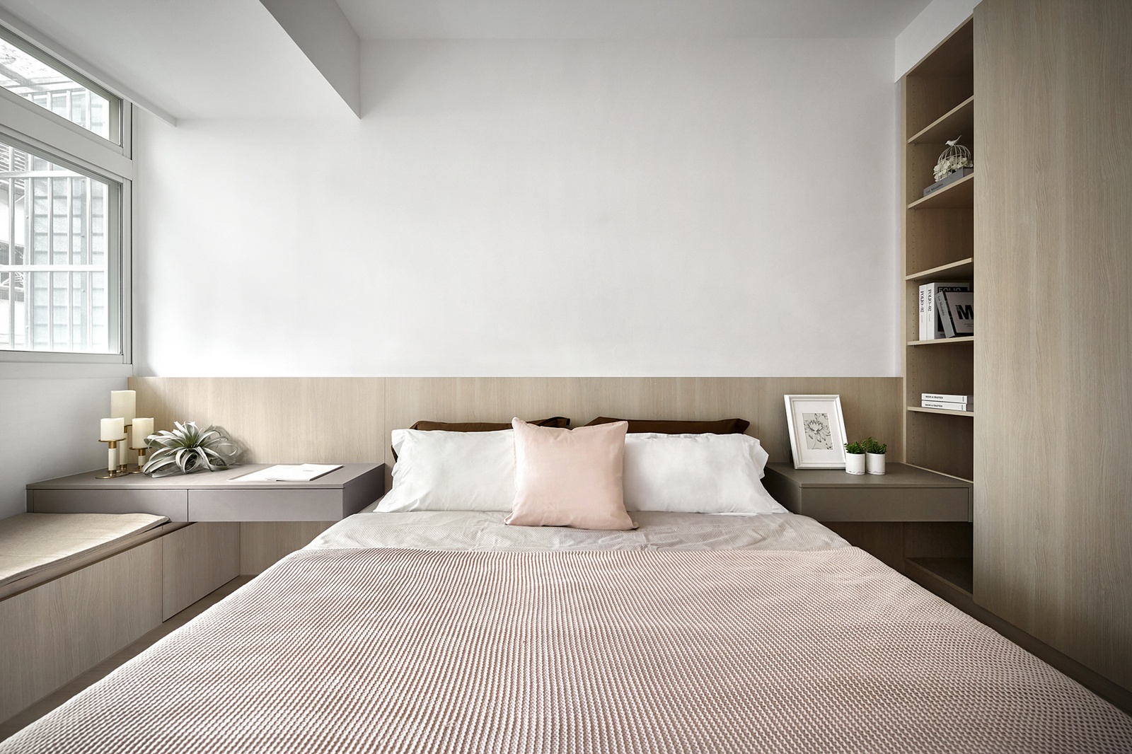整體規劃上,考量到屋主的預算有限,團隊主要是以簡約的佈局做設計。透過恰到好處的機能配置與色彩應用,不僅能滿足屋主的使用需求與喜好,還能避免冗餘的裝飾造成的資源浪費。值得一提的是,團隊將廚房隔間拆除的設計,能有助於增加室內採光、促進空氣流通,減少人工照明與空調的使用,達到節能減碳的效果。另外,本案所用的材料多以綠建材為主,包括以回收木屑壓製而成的系統板材、低甲醛的超耐磨木地板、低VOC的環保塗料與節能的LED燈具等,能有效減緩施工對環境造成的衝擊。
