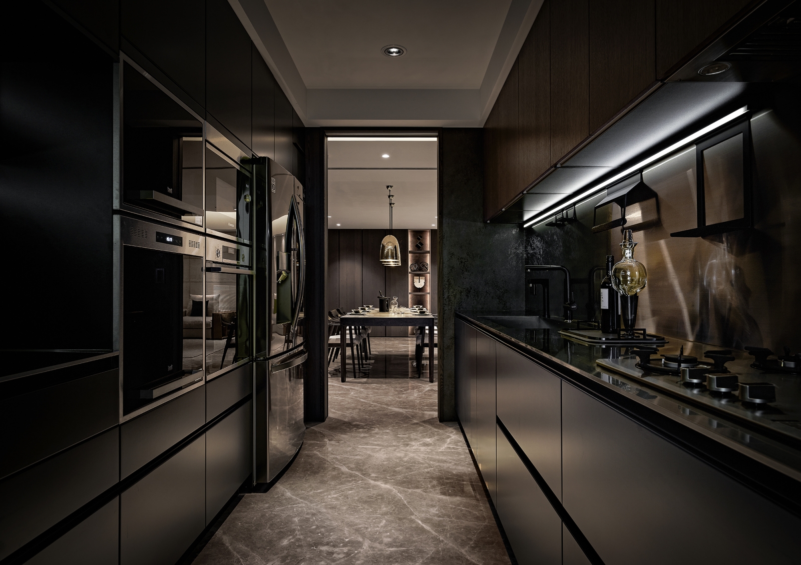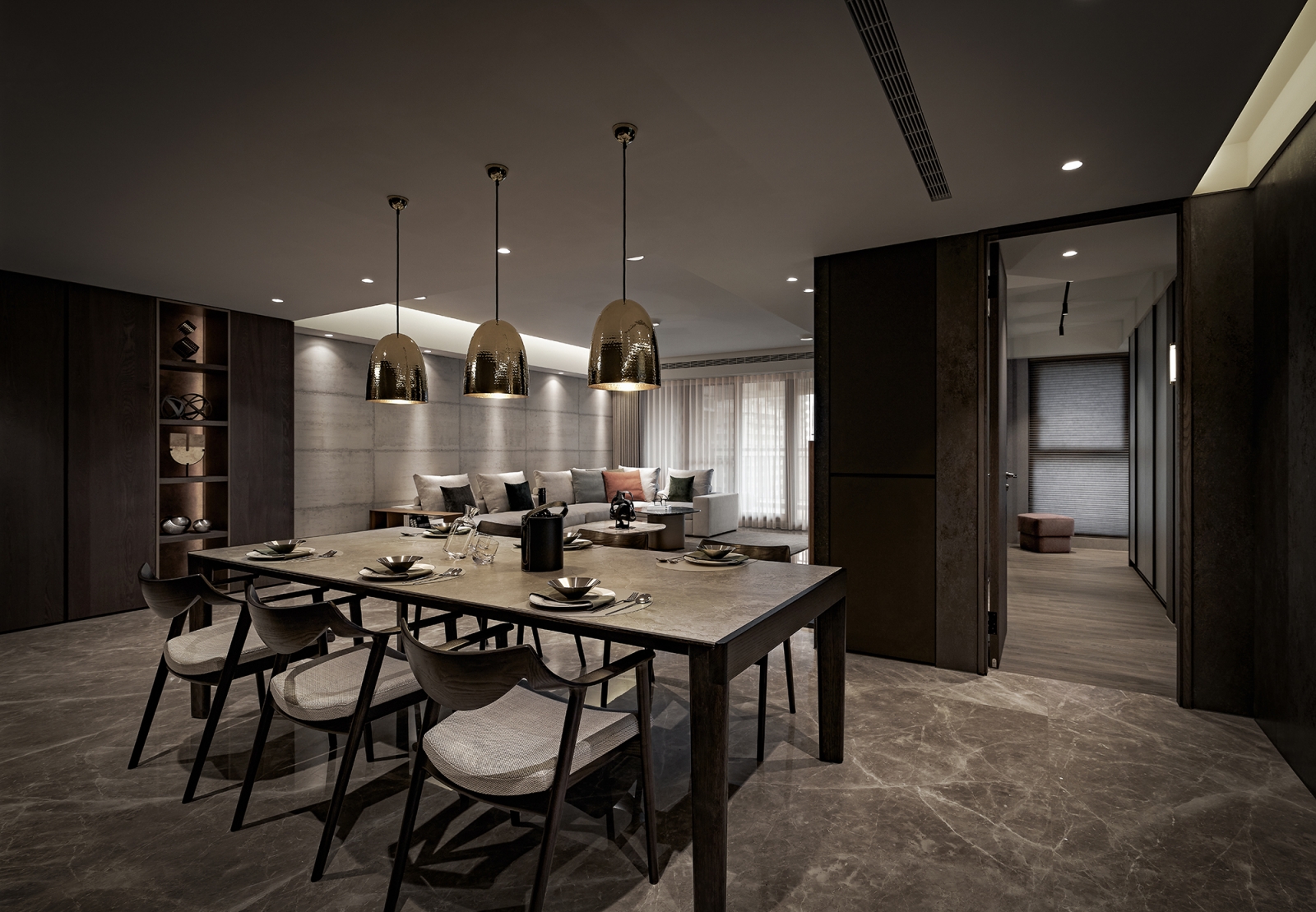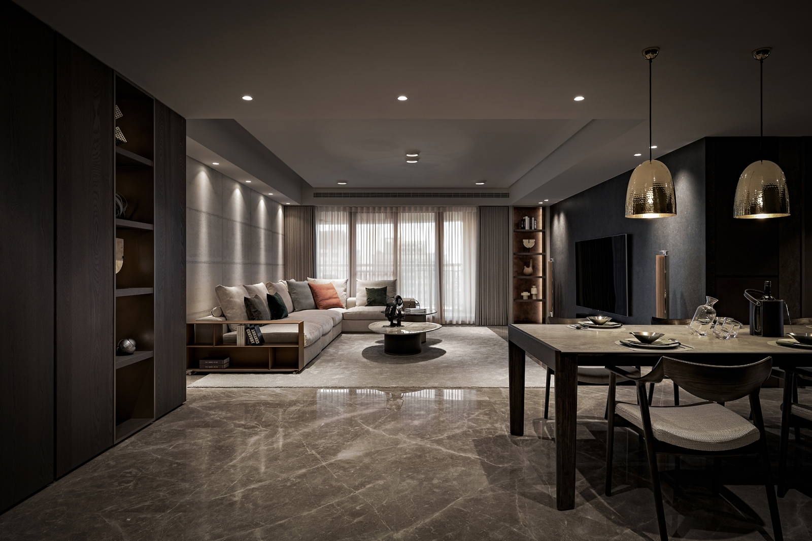 外觀以深色基調,融合金屬冷冽感與木材溫潤肌理,呈現現代工業風沉穩氣質。白榆木鋼刷實木木皮、大理石與鋁合金框等材質對比運用,展現個性與溫暖。設計注重比例與施工講究工藝,透過剛硬與柔和的對比,營造空間的平衡與和諧。