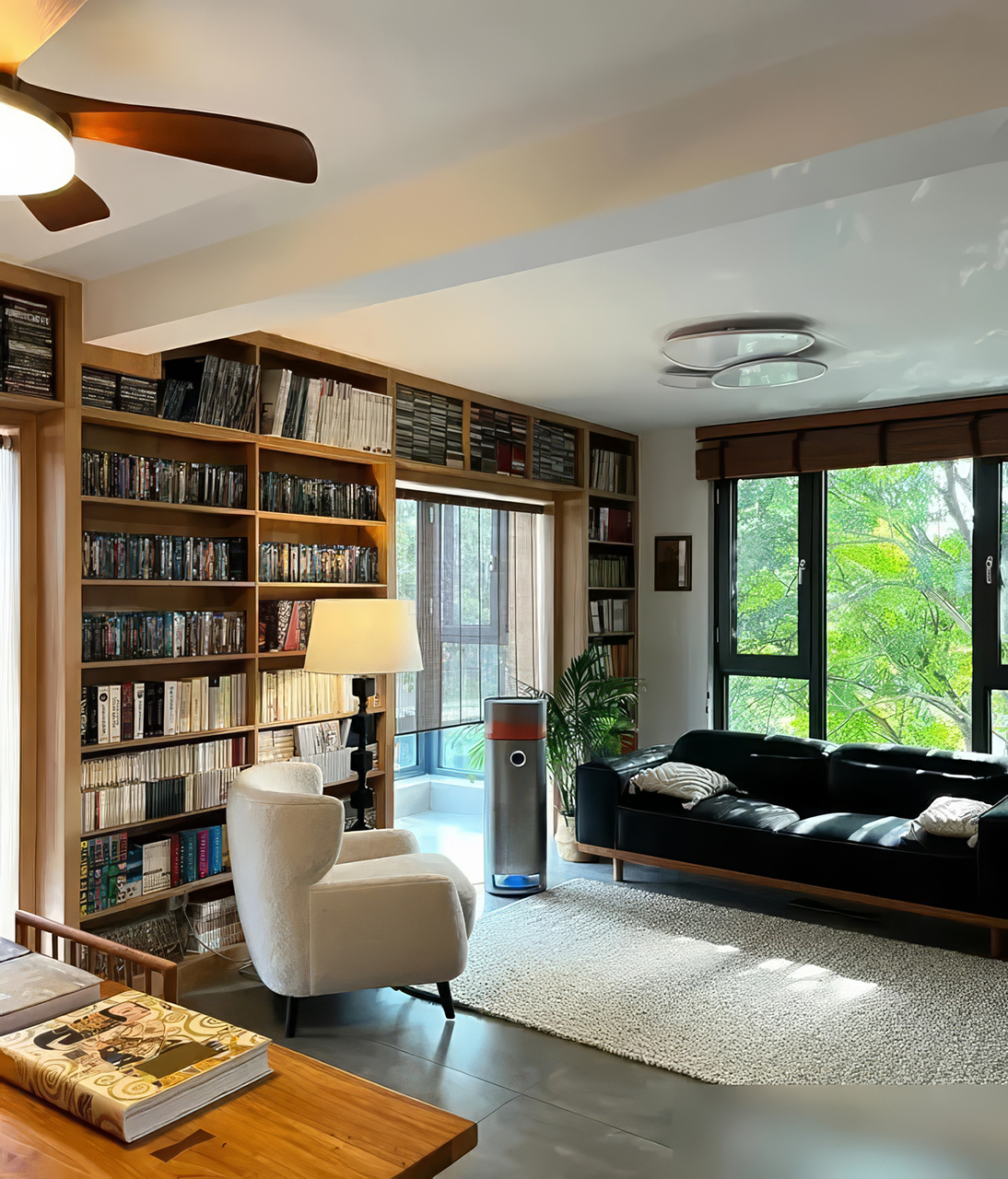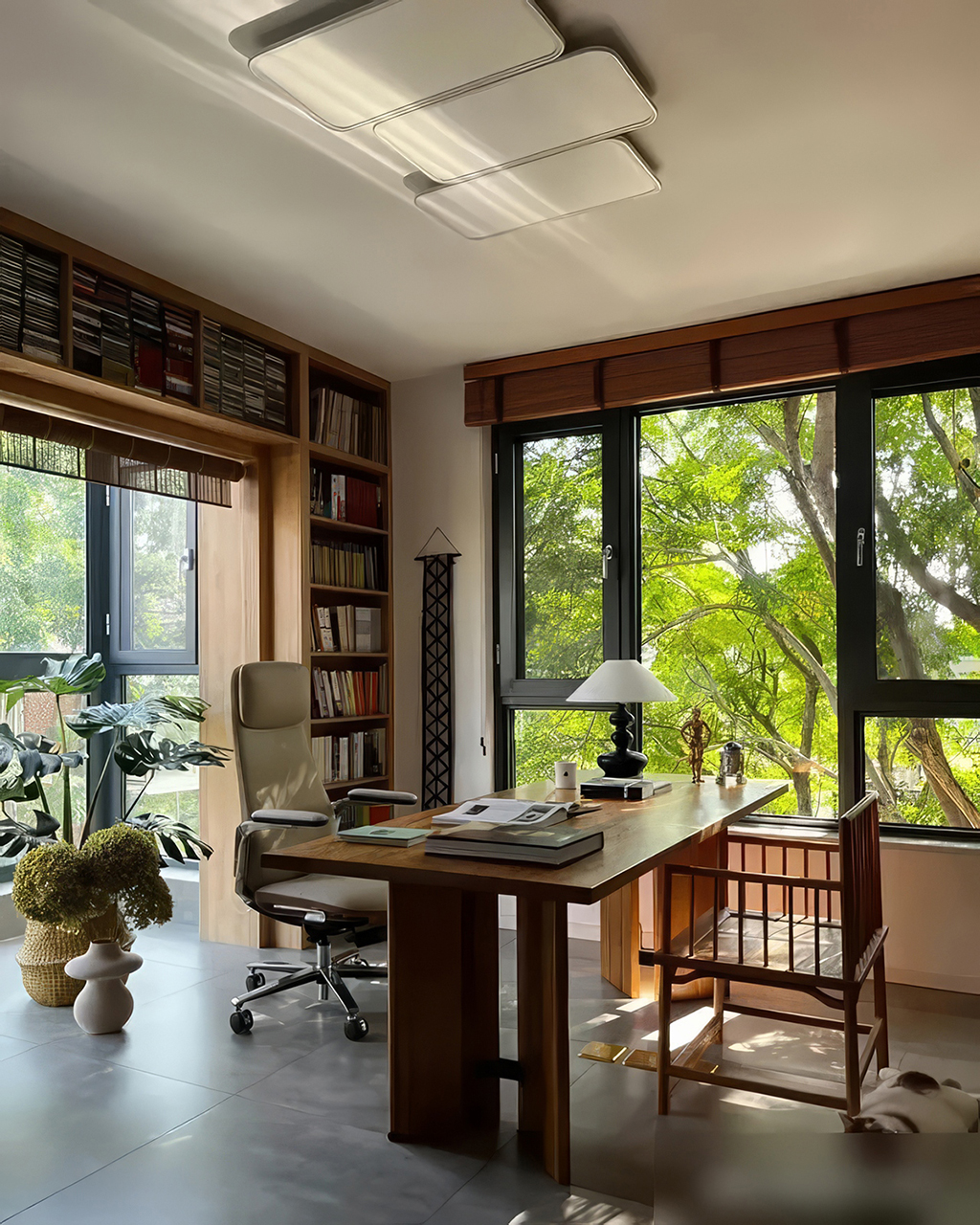 書房三面環窗的設計,將羊城充沛的日照轉化為天然照明系統,晨光斜射入室時,書本的油墨香彷彿都帶著陽光的溫度。設計師摒棄了傳統封閉式書房的構想,用環繞式書架築起知識殿堂,既解決了藏書需求,又保持了空間通透性。客廳的750×1500mm灰色柔光磁磚,經過精密計算的鋪設角度,讓自然光在室內形成柔和的漫反射。當6公尺寬的落地窗將窗外綠景框成巨幅掛畫,人們突然發現,最好的軟裝設計師原來是四季更迭的自然本身。