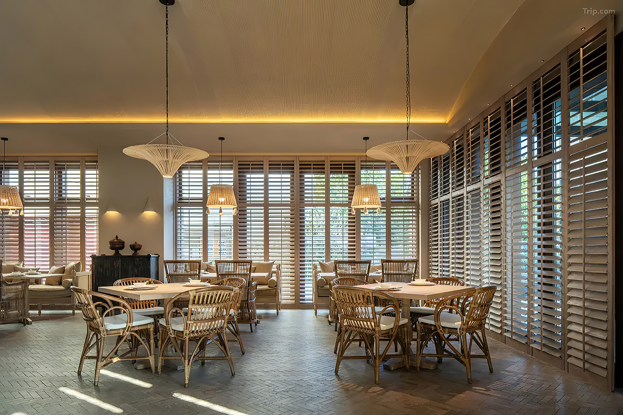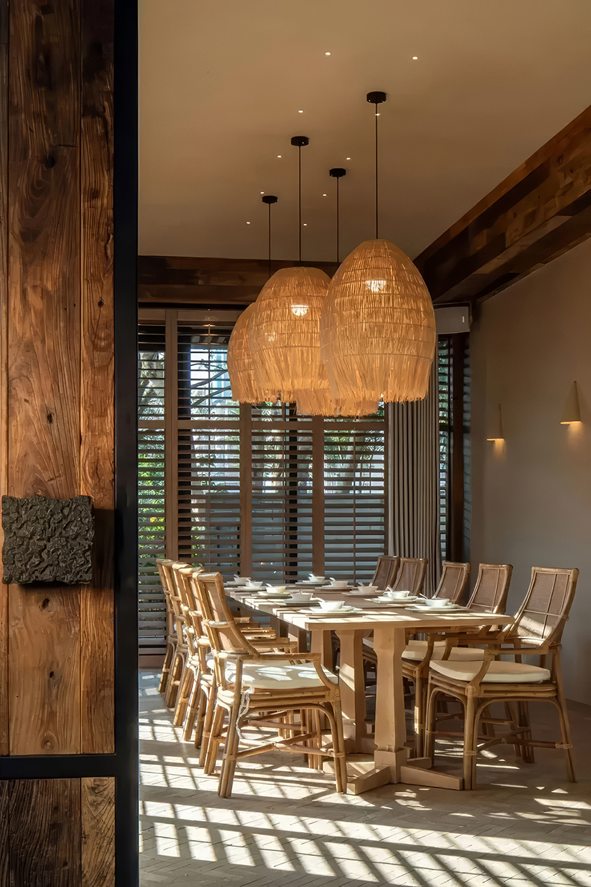 餐廳選取真實的天然材料給予用餐環境適當的包裹,藤編的燈具和作業、米色的塗料、地面鋪設的石磚…在光的渲染下,展現出獨特的質感和色澤。在光影的變幻中,彷彿能感受到時光的流轉與沉澱。
