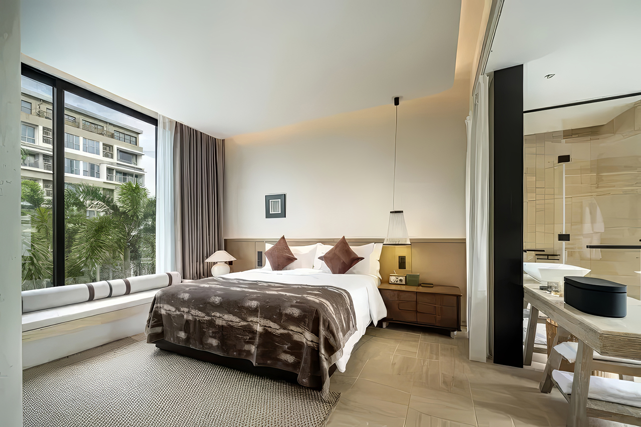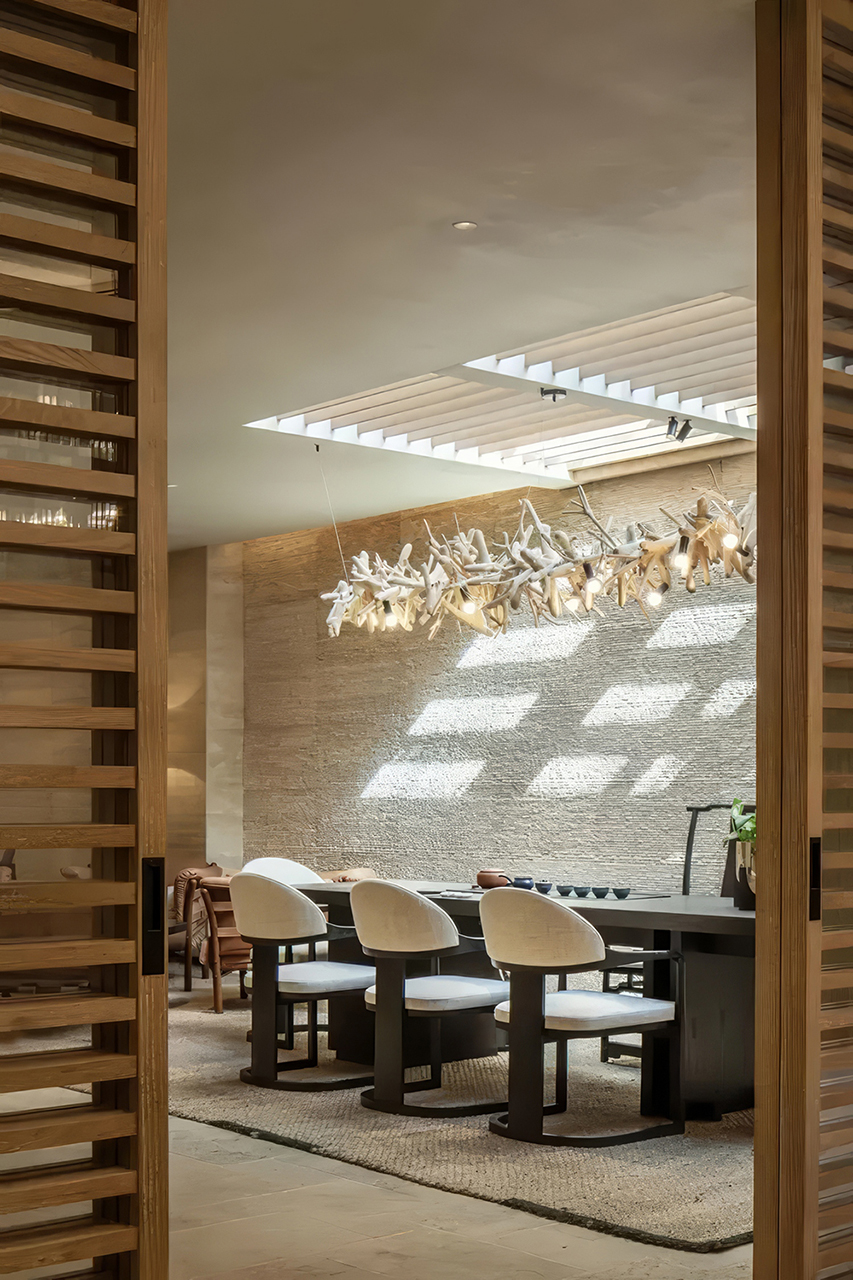 光影效果是與光共生的設計中不可或缺的一部分。透過巧妙的設計手法,如利用牆面、地面、家具等物件的遮蔽和反射,創造出豐富多樣的光影變化,能夠為空間增添層次感和立體感,營造出獨特的氛圍。例如,在三亞海棠灣鹿鳴酒店的公區書吧,設計師將書吧的視覺通透性最大化,光以漫反射的方式暈染著空間,呼應著窗外緩慢且自由生長著的植物,透過有意識的冥思氛圍,抵達到內心的平靜狀態。當賦予光線幾分雕琢,它便綻出了靈韻,藤編的參議篩露出碎金似的光片,在木製餐桌與地板上閃爍。透過木製的百葉窗,光又被梳理成絲絲縷縷,輕柔地灑下,為空間披上一層暖紗。