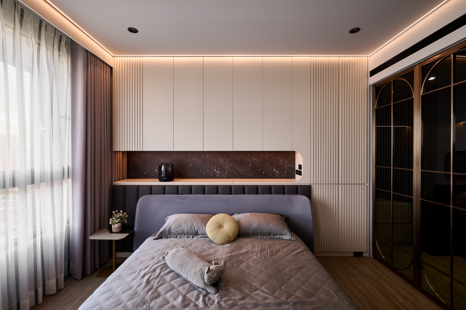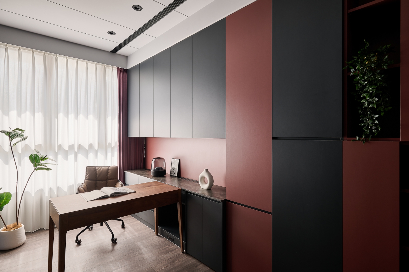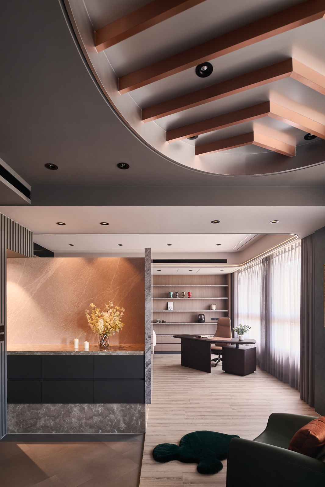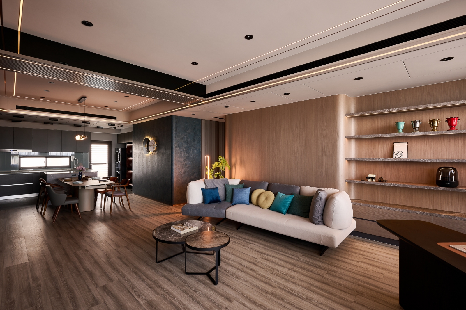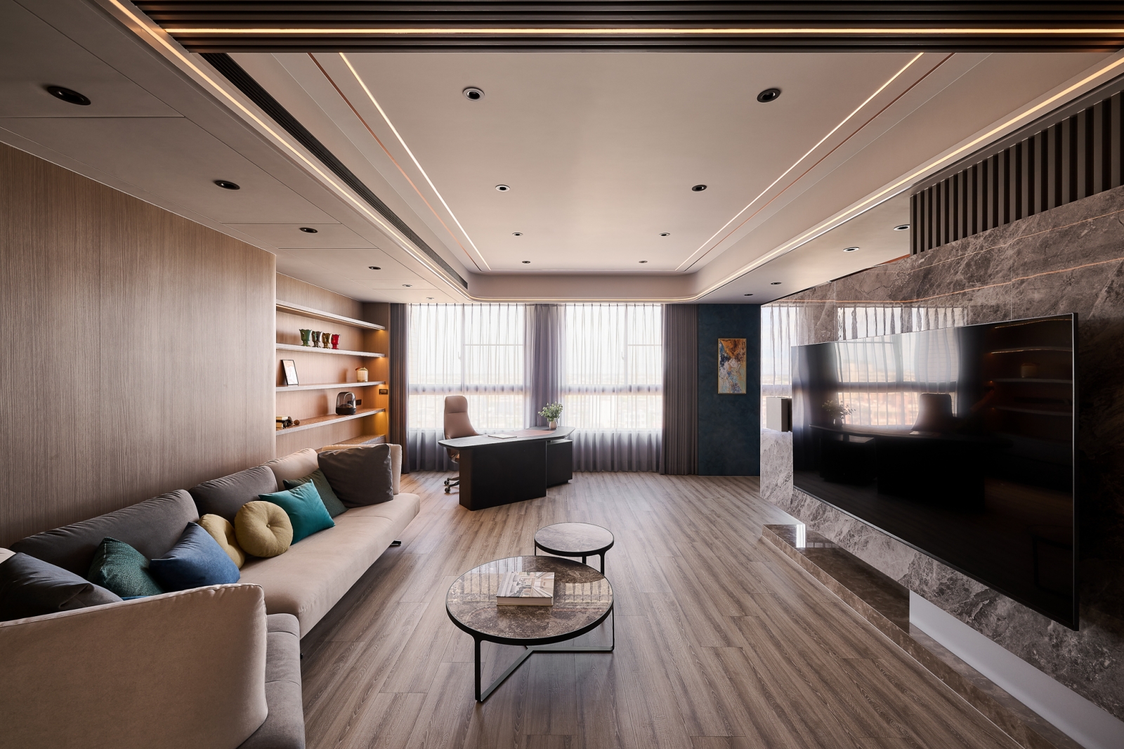 設計理念源於居者渴望閱讀與辦公不受侷限,於是打開公共區域,減少隔間並保留三大片玻璃窗,以天花線條與燈帶延伸至窗景,室內外視線自然連結,讓光影與景觀融入生活。電動捲簾與光線控制,營造可轉換的氛圍,無論是沙發、玄關椅或書桌,皆成為閱讀與沉思的舞台。