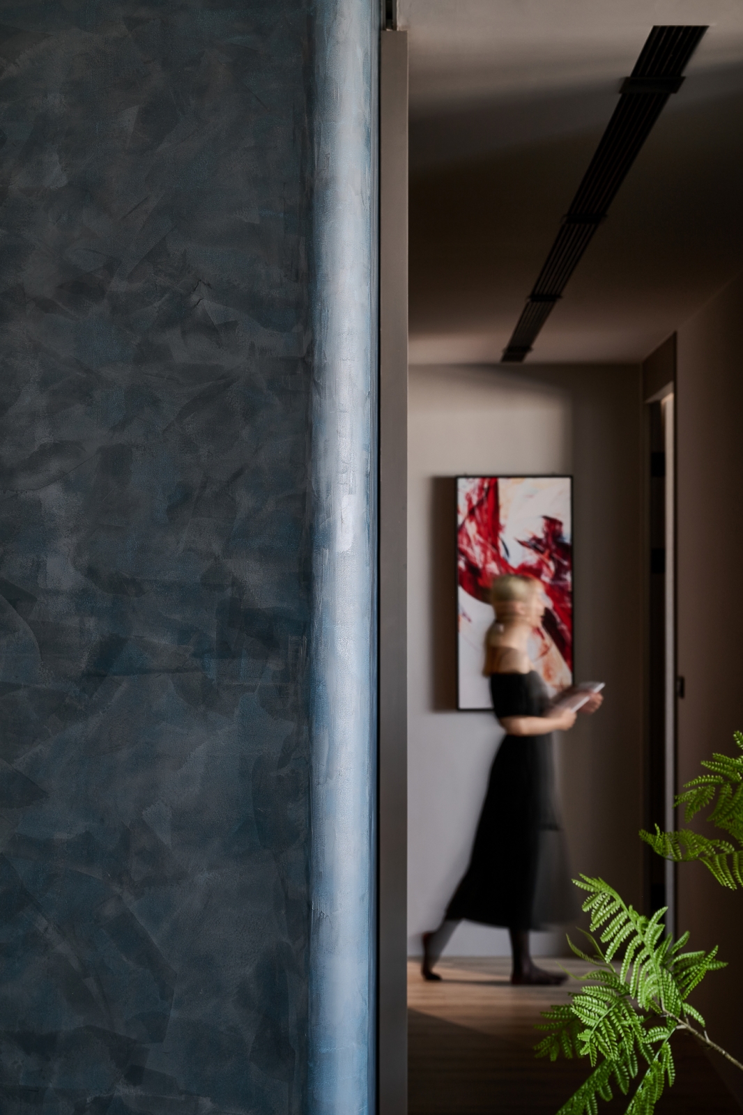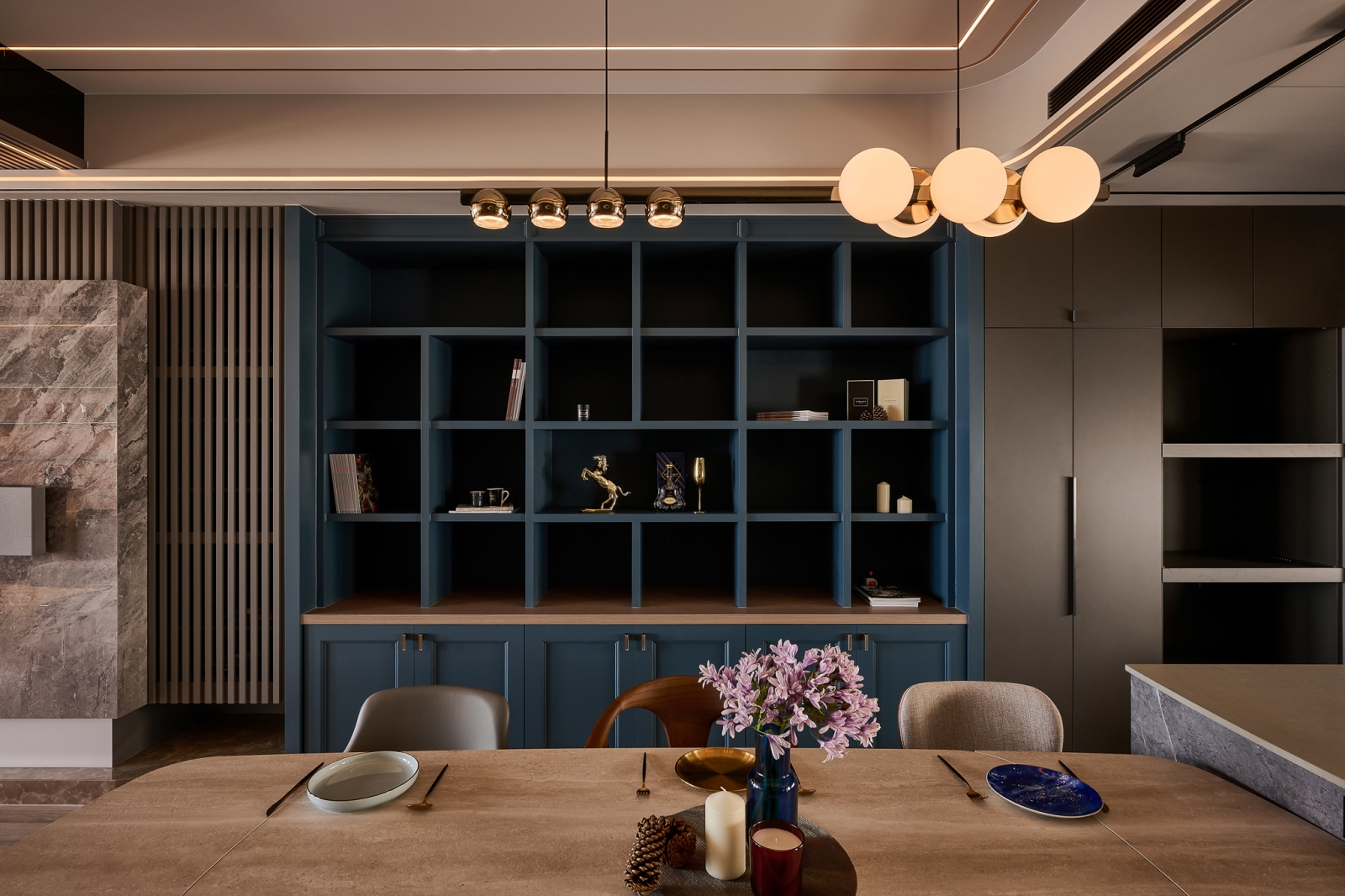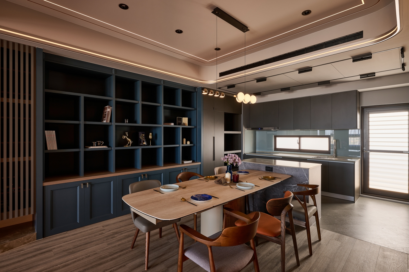 差異化在於以藍色調貫穿全宅,呈現自在流轉的閱讀氛圍,融合多種材質,卻在比例與收邊上達到和諧與耐久。串連閱讀、工作與生活場景,使室內各處皆融入書房氣息。從材質混搭到光影調控,皆回應居者需求,展現獨特且完整的設計語彙。