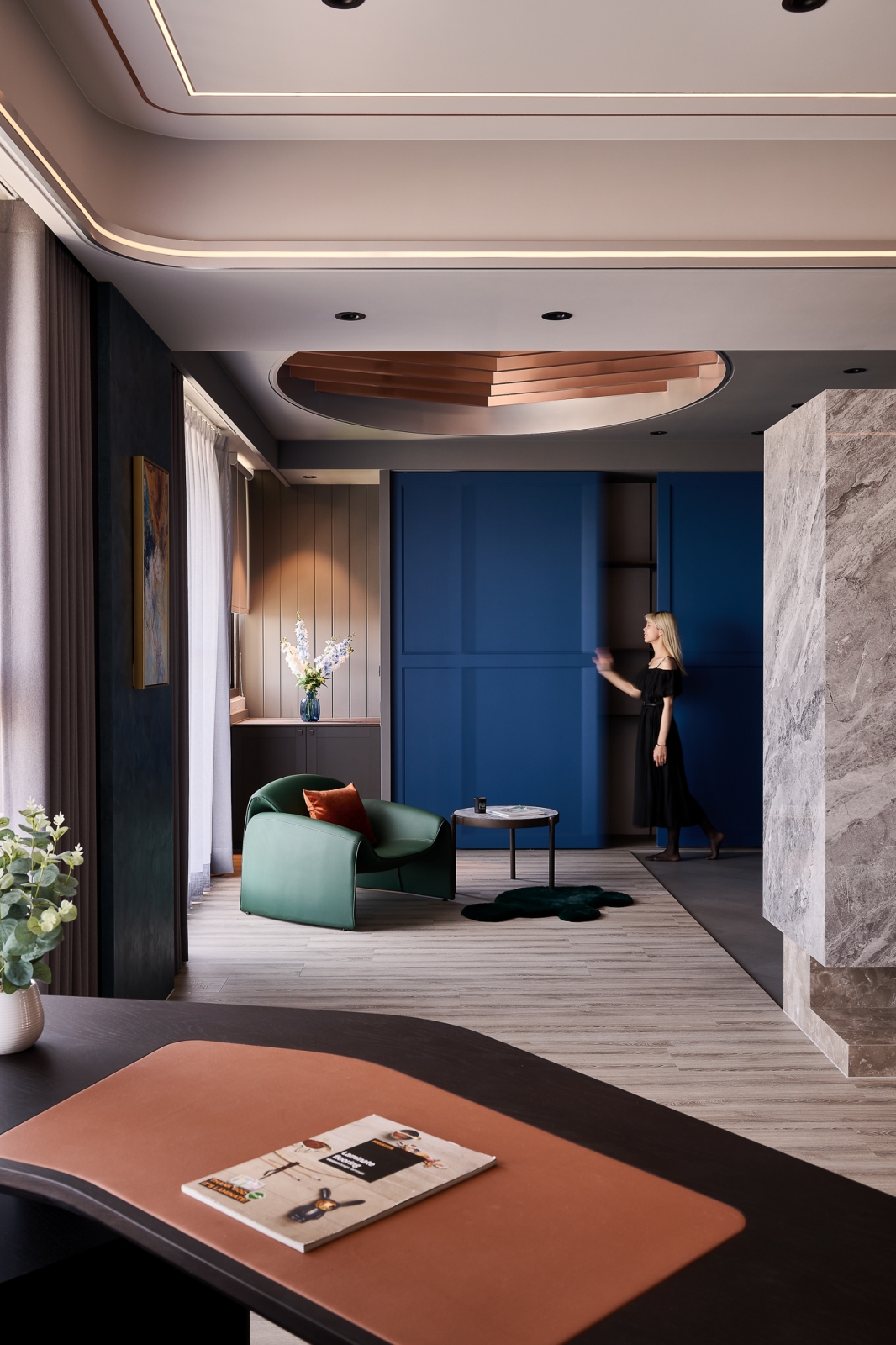 本案榮獲 2025 義大利羅馬設計獎 Rome Design Awards – 金獎。本案室內設計以藍色為主軸,將住宅打造為自由流動的閱讀與音樂場域。空間融合異材質與特殊漆,混搭而不凌亂,軟裝凸顯個性。設計使家中每個角落皆可沉浸於閱讀或工作,將單純的居所轉化為靈活多功能的住宅,貼近生活節奏。