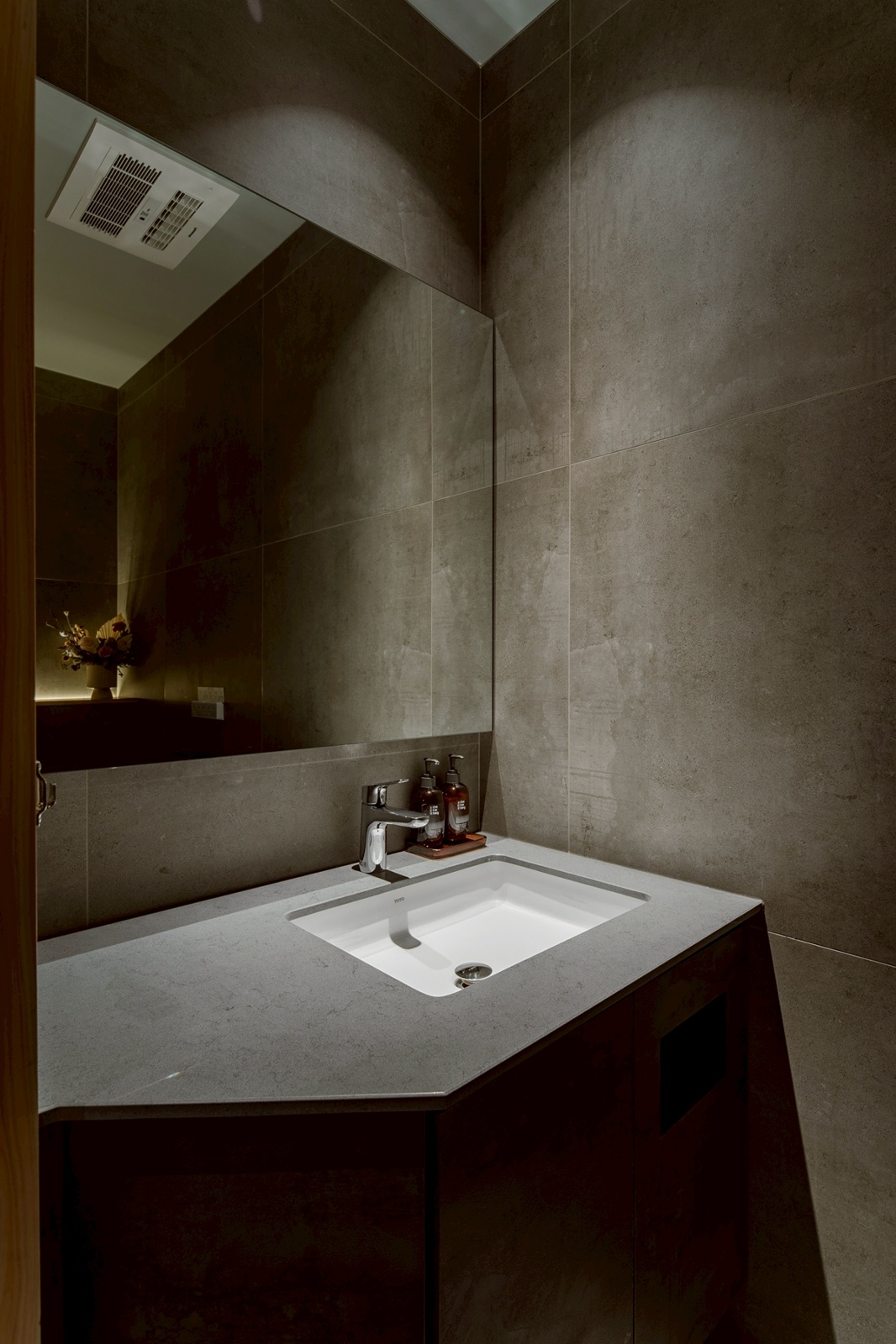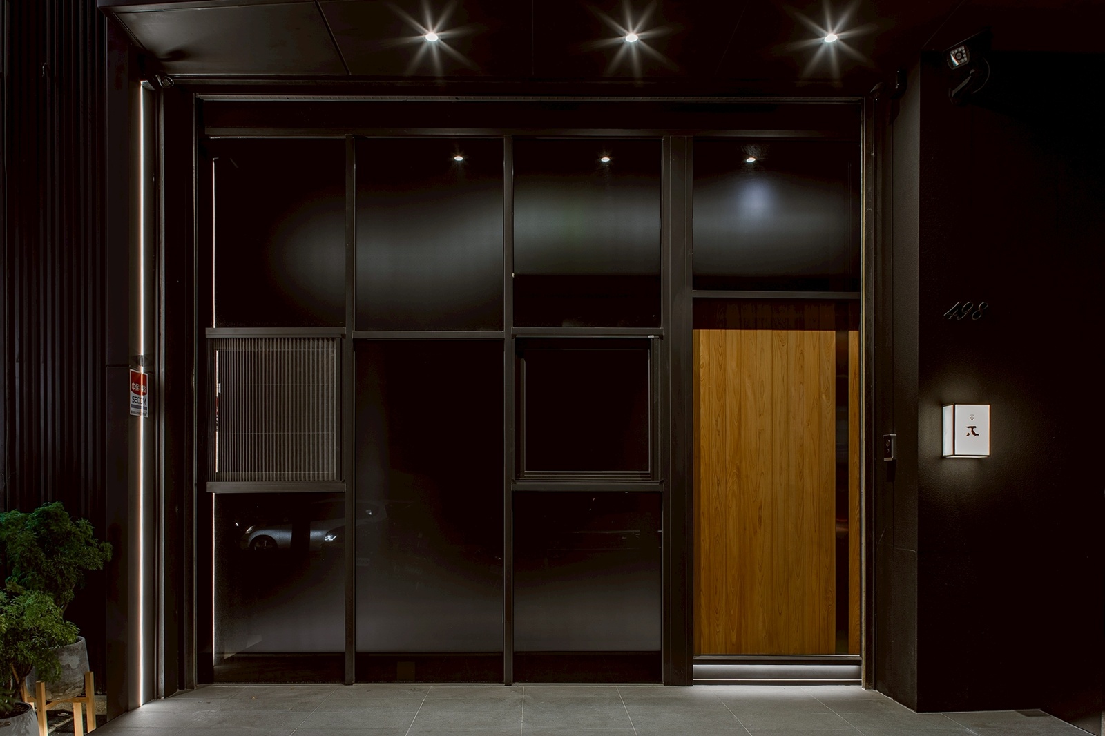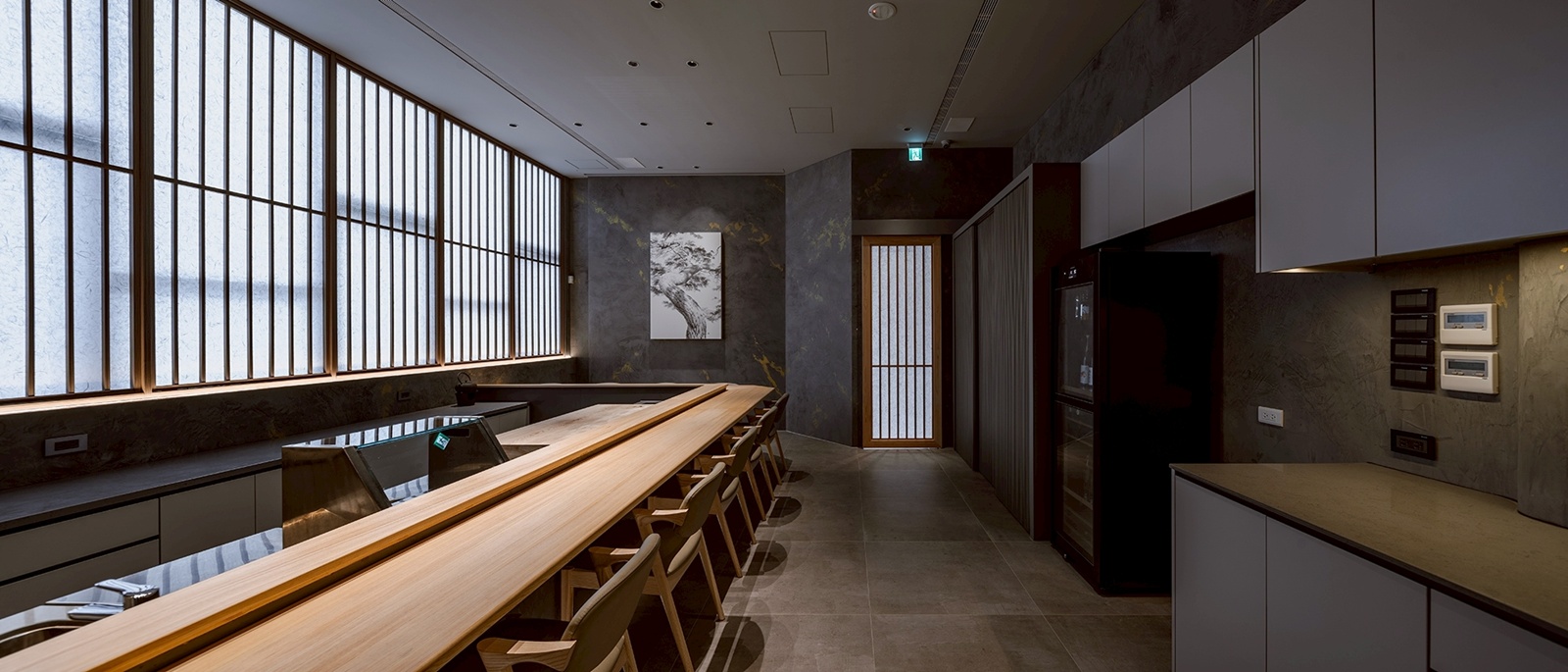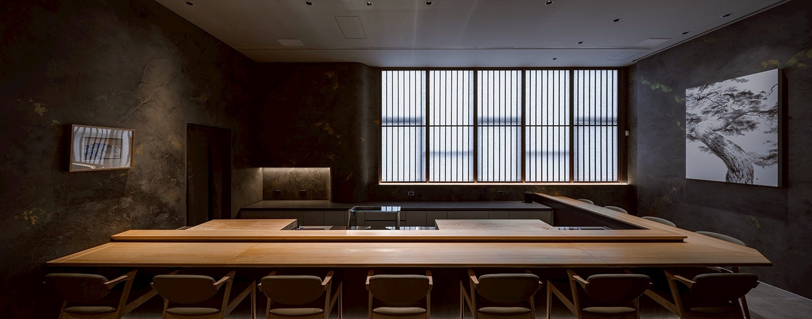 由街道進入,立面以低彩度與內斂尺度融入城市。入口廊道刻意拉長並設置轉折,重新調整行走節奏,使身體逐步沉浸於寧靜。和紙木門作為光線與視線的過濾介面,柔化自然光,完成心理過渡。核心區域以十二席實木長桌構成,透過距離與尺度的設定,確保每位使用者皆能在不受干擾的情況下觀察料理工序。桌面與操作台之間的高度差,使視線自然落在廚師的手部動作,強化專注的用餐體驗。