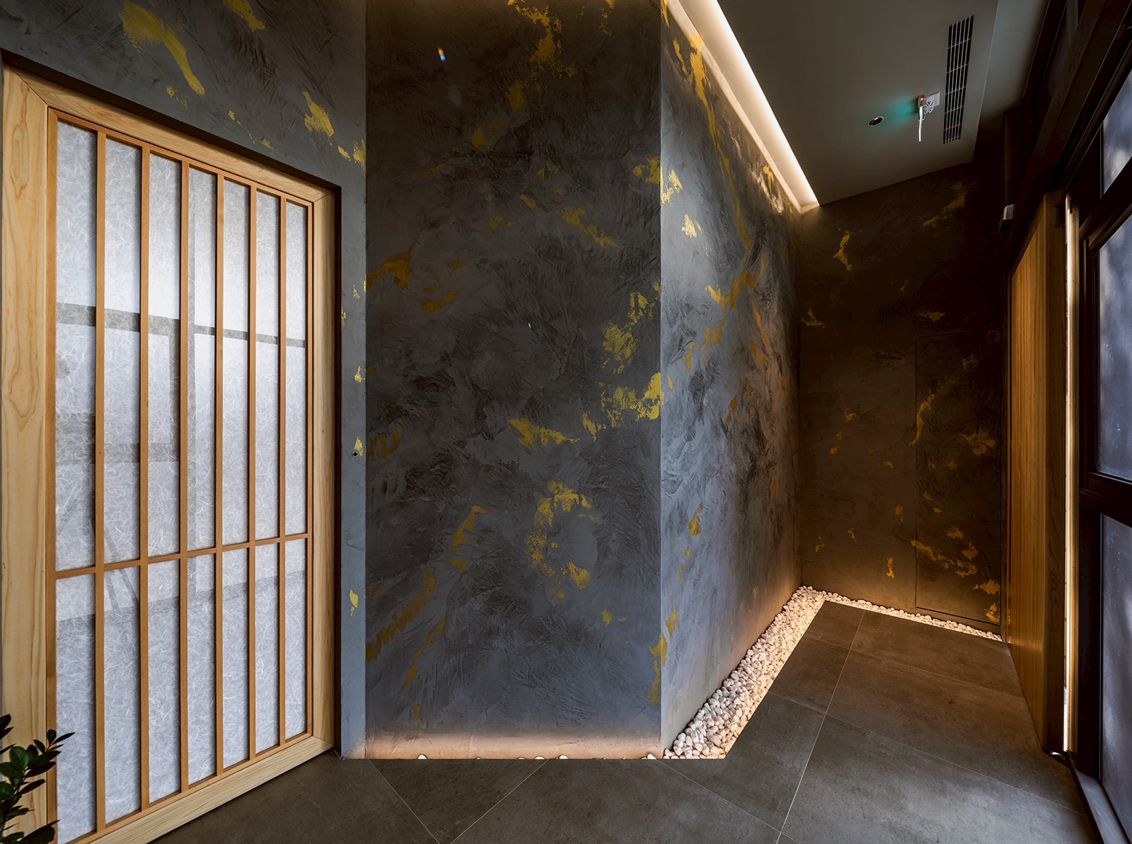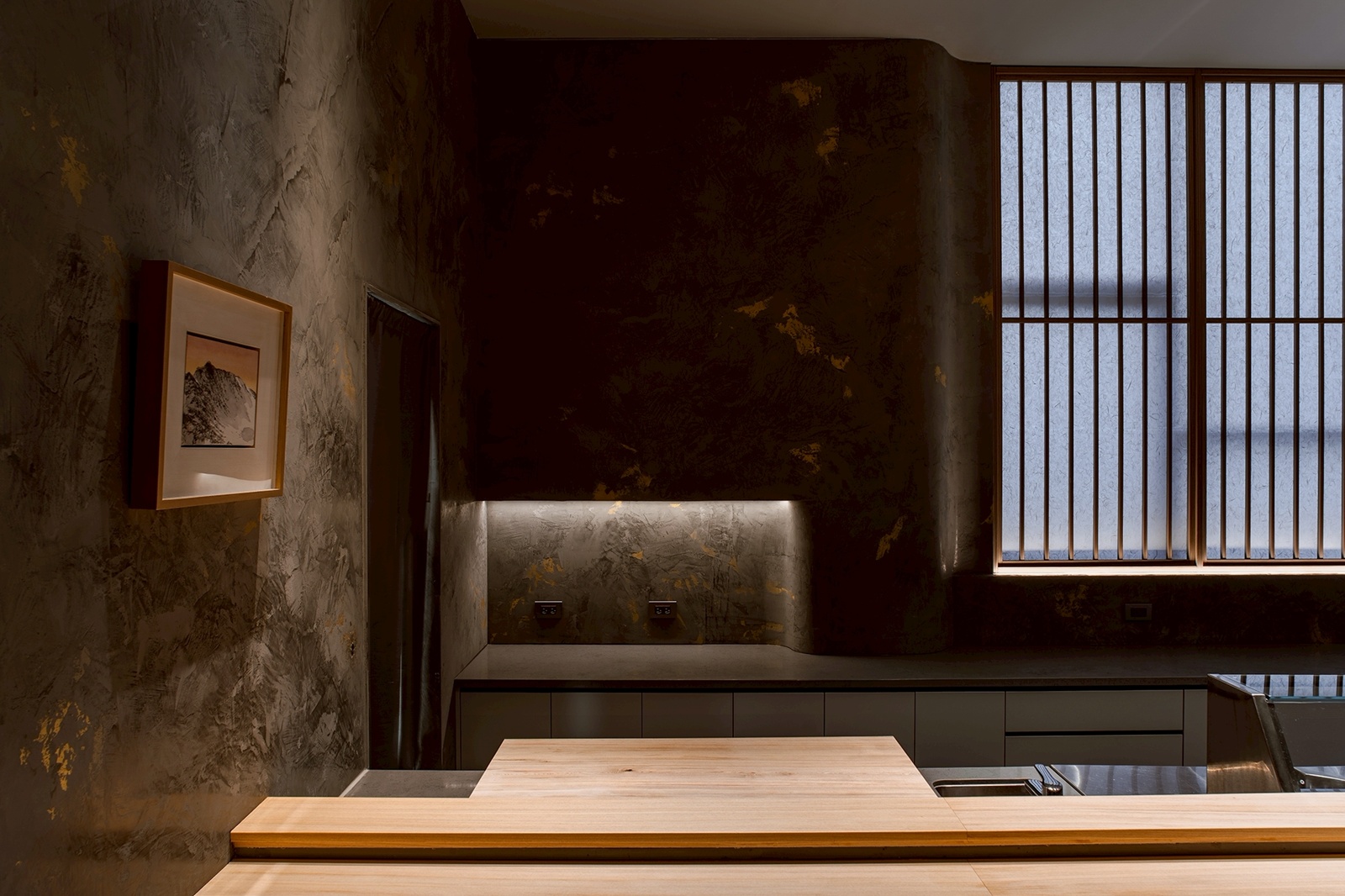 本案榮獲 2026 法國設計獎 French Design Awards – 金獎。本案為一間板前天婦羅餐廳,以「大自然為本」與「比例美學」為核心,將環境視為日常生活的延伸,演繹成一種可被實踐的生活哲學。設計以減法思維為基礎,不追求視覺主導,而透過比例、光影與材質的精準控制,使空間回應天婦羅料理對火候與節奏的掌握,並轉譯其所蘊含的時間性與專注狀態。整體牆面以深灰色藝術塗料作為背景,降低反射與視覺干擾;細緻的金色紋理隨光線角度浮現,如同料理過程中油溫與氣流產生的細微變化,使感官回歸平衡。