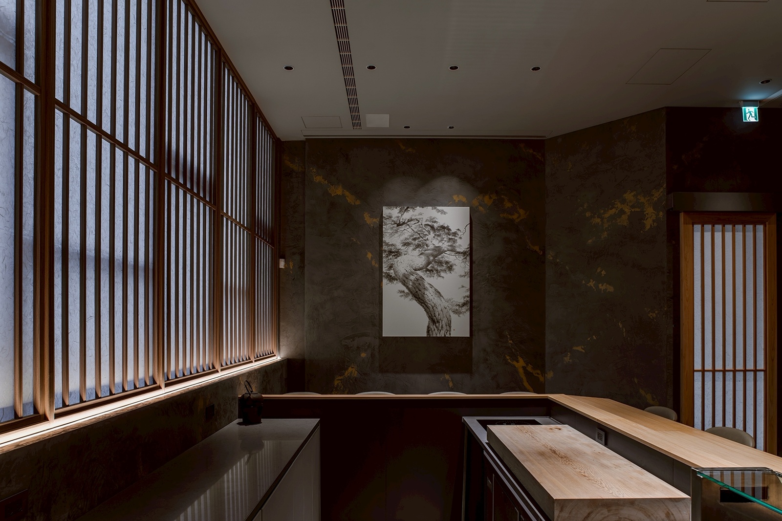 光影設計透過日本進口和紙與隔柵結合,描繪出牆體厚度與結構層次。木格柵窗呼應入口介面,將自然光拆解為明暗韻律,使光成為時間流動的指標。在材料選擇上,日本和紙、木紋金屬隔柵呼應人文底蘊;低色調照明策略則確保感官體驗的穩定。如同天婦羅料理對比例、溫度與時間的拿捏,本案透過空間關係的調整,讓用餐回歸專注,也讓生活的片刻被自然放慢。
