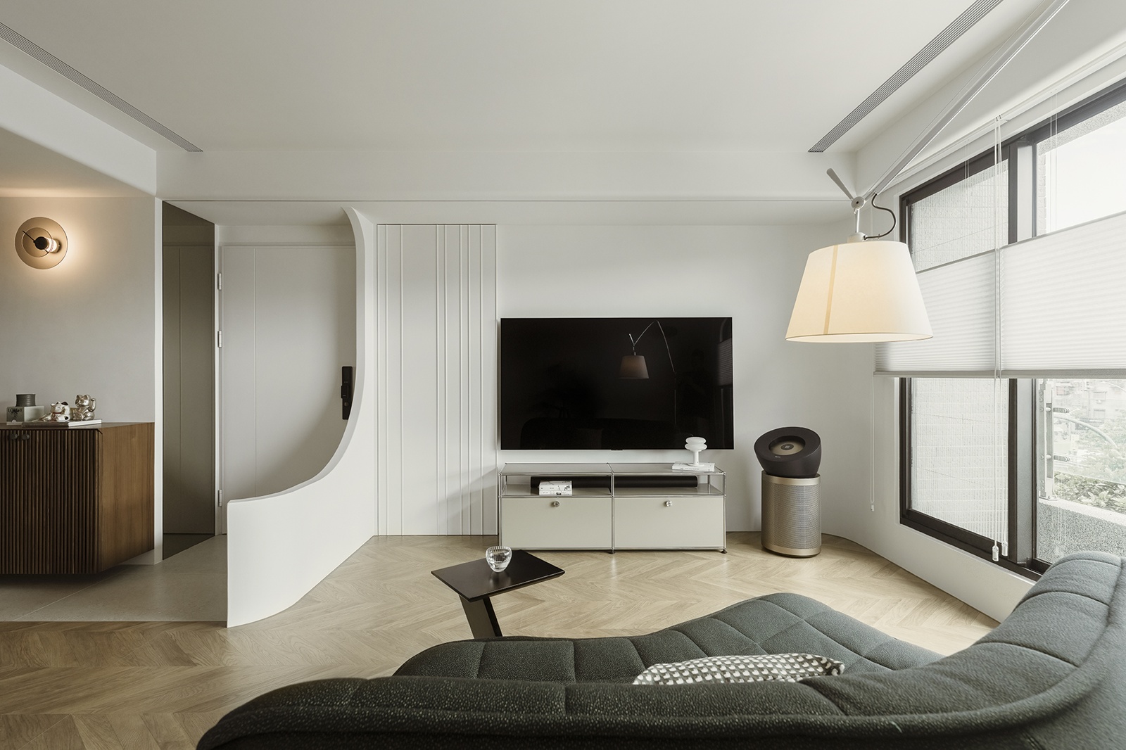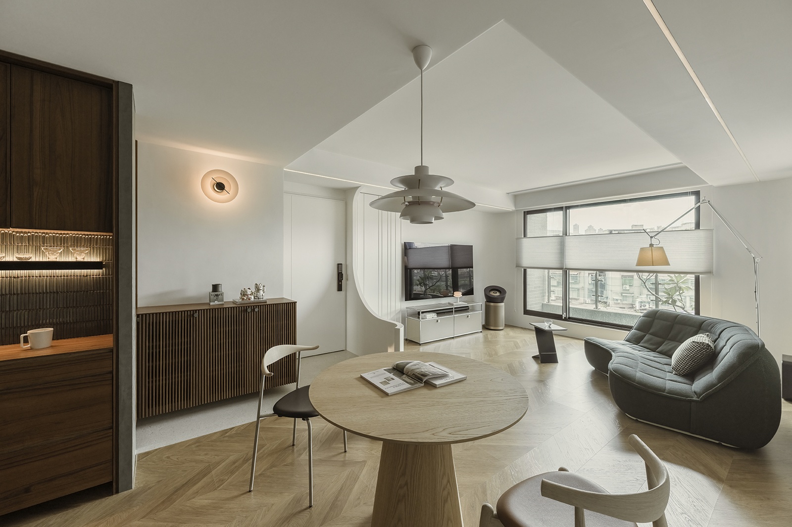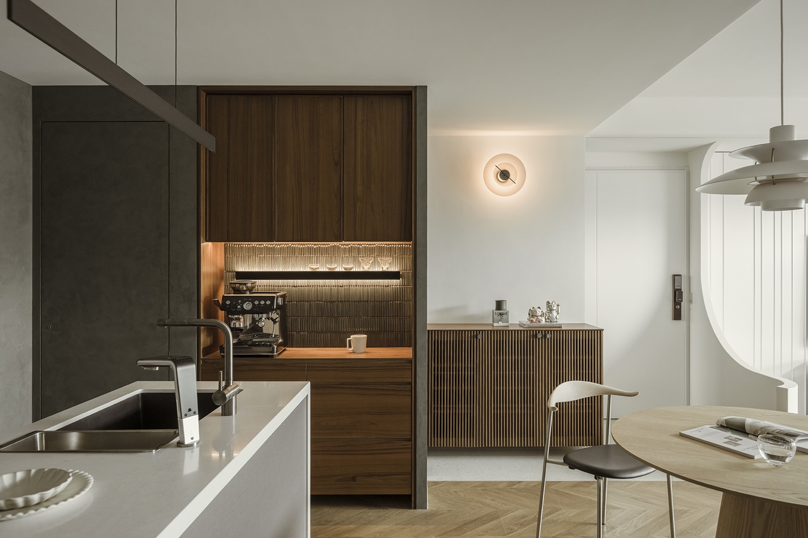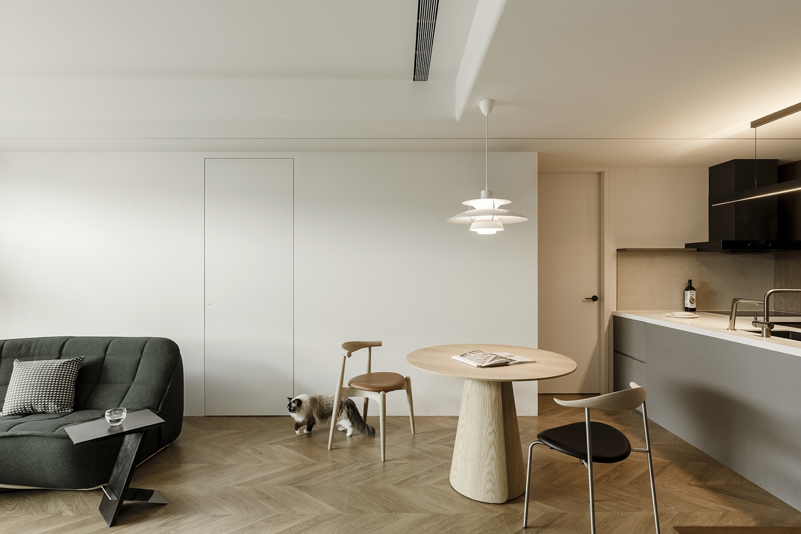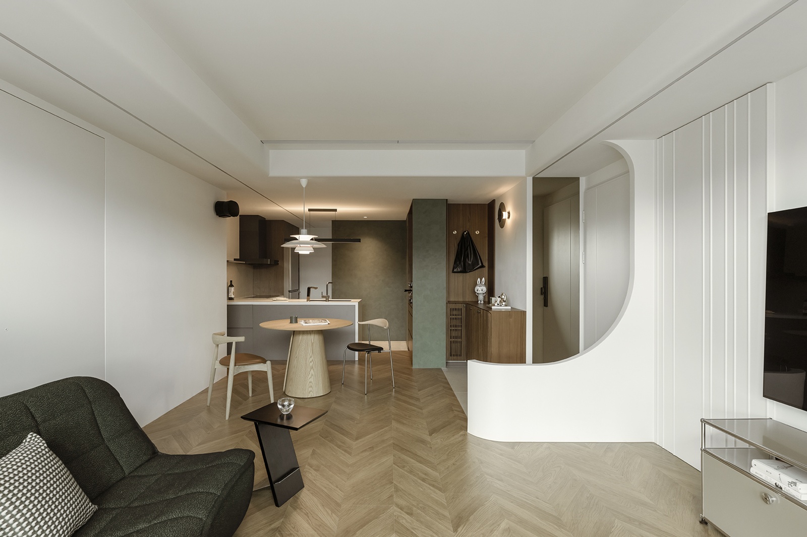 玄關與客廳以異材質地坪與弧形櫃體巧妙界定動線,米白與木質基調延伸至公領域,墨綠色沙發成為視覺焦點,人字拼花木地板增添層次感。餐廳與廚房以開放式中島與圓形餐桌串聯,吊燈呼應空間質感,深色木櫃與灰綠塗料牆面搭配隱藏燈光,展現細膩層次與連貫性。