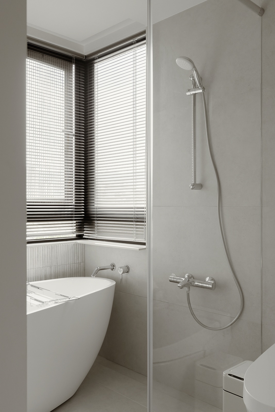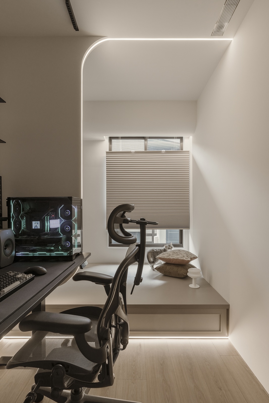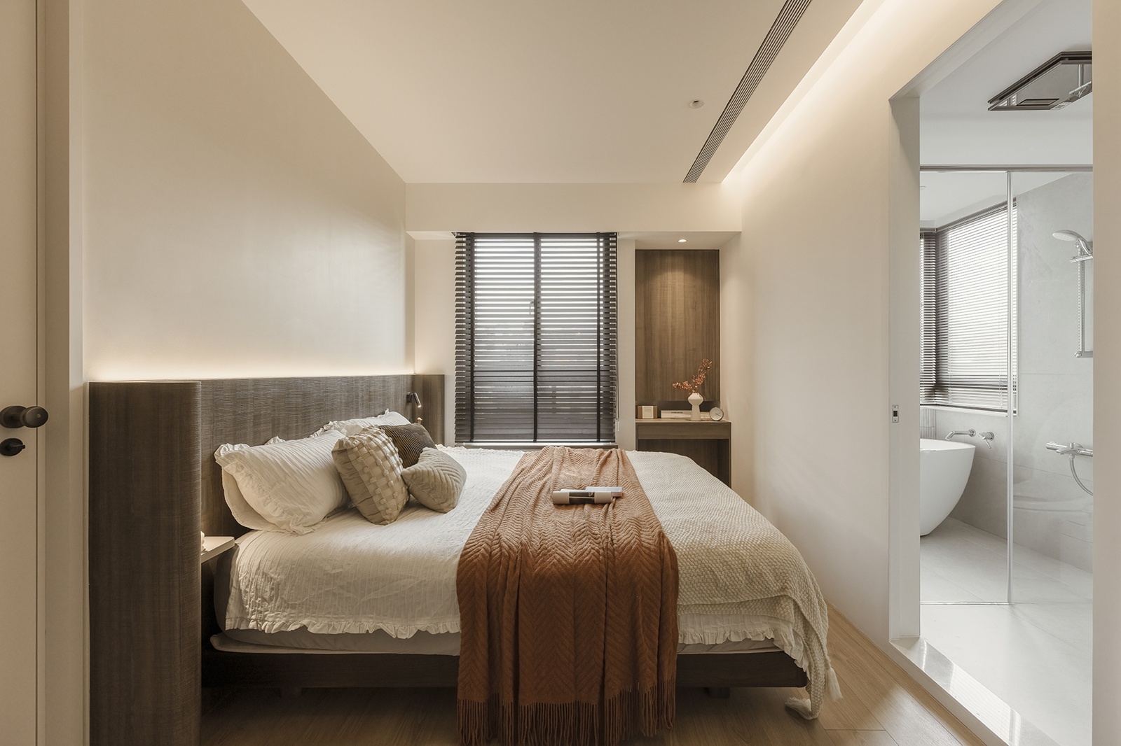 書房功能分明,工作區與架高休憩平台並置,線型燈帶勾勒輪廓,增添空間層次。臥室延續暖白與木質語彙,設有步入式衣帽間,以深色木門區隔,間接光源營造寧靜感。浴室以淺灰白磁磚為基底,玻璃門引入光線,塑造通透且放鬆的沐浴環境。