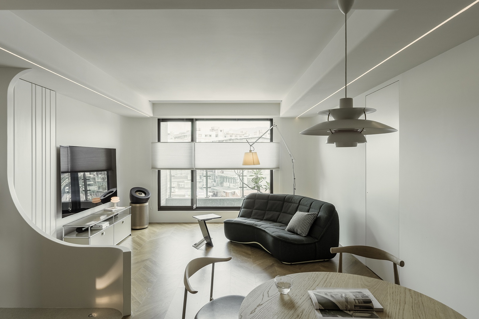 全室採無毒油漆與木料,櫃體由木工工廠客製化現場安裝,有別於系統櫃,減少粉塵與噪音並精準呈現細節;住宅導入智能系統,提升生活便利與舒適度。多處結合流線燈帶、落地窗與雙層窗簾,以光線營造舒適、健康的生活環境,呈現對居住者的全面關懷與質感都會樣貌。