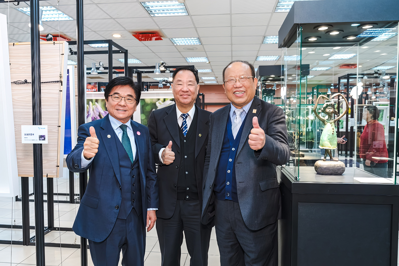 三位企業主說自己是素人藝術家 (左起)麗明營造董事長吳春山、龍寶建設董事長張麗莉、生產力建設董事長張忠弘