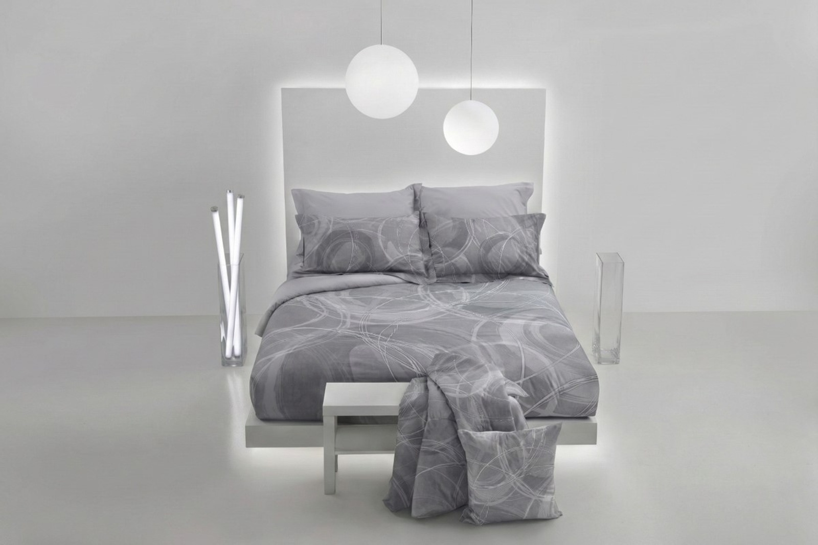 在簡約單純的灰色系之下,以數位印染呈現出奔放的幾何大圖騰,彷彿圓規刻劃出的線條,些微的抖動感反而更彰顯出動感,而非死板的單一線條,結合最單純的色彩與圖形,創造出低調摩登的設計感。