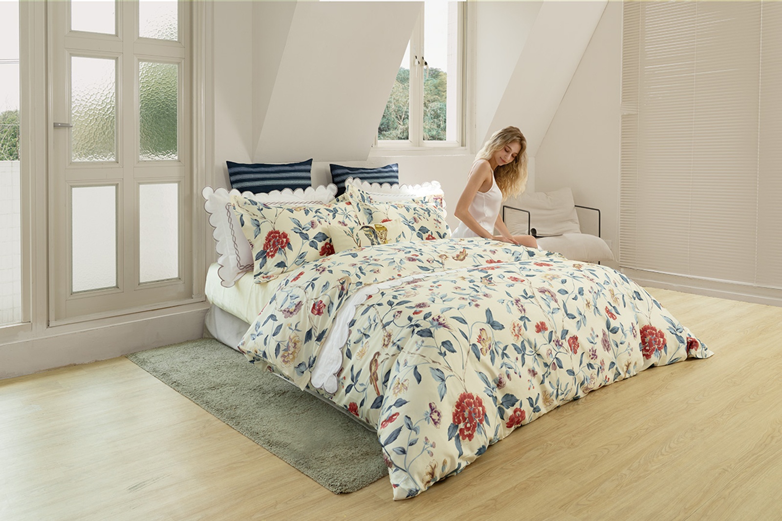 靈感來自於英格蘭的Sissinghurst城堡花園,描繪生動靈巧的鳥兒棲息於色彩繽紛的牡丹樹,靛青色的枝葉與紅寶石般的花朵相互襯托,展現內斂深邃與華麗溫暖的對比。以超長纖棉─埃及棉帶來柔軟細緻觸感,附有國際埃及棉認證標章吊卡。
