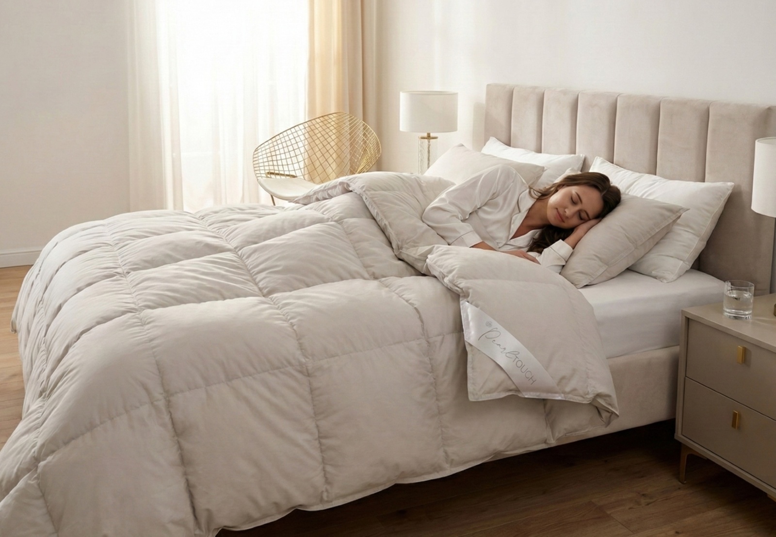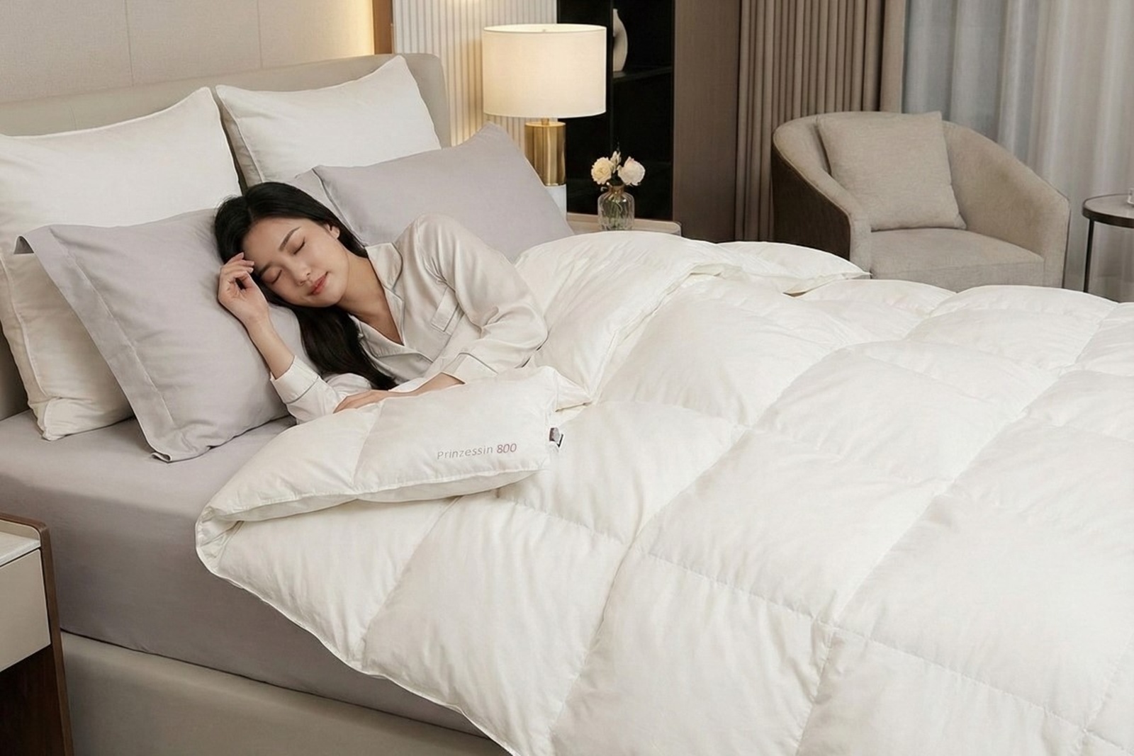 採用來自波蘭波美拉尼亞地區的100%一級白鵝絨,羽絨蓬鬆度高達 800 CUIN,更保暖、更輕盈;外層選用德國製超細緻Mako batiste表布,同時通過Downpass認證(保障羽絨來源)、NOMITE防蟎認證、Öko-Tex Standard 100國際紡織品認證、SanProCare® Sensitive 親膚認證,用溫柔奢華包覆每寸肌膚。