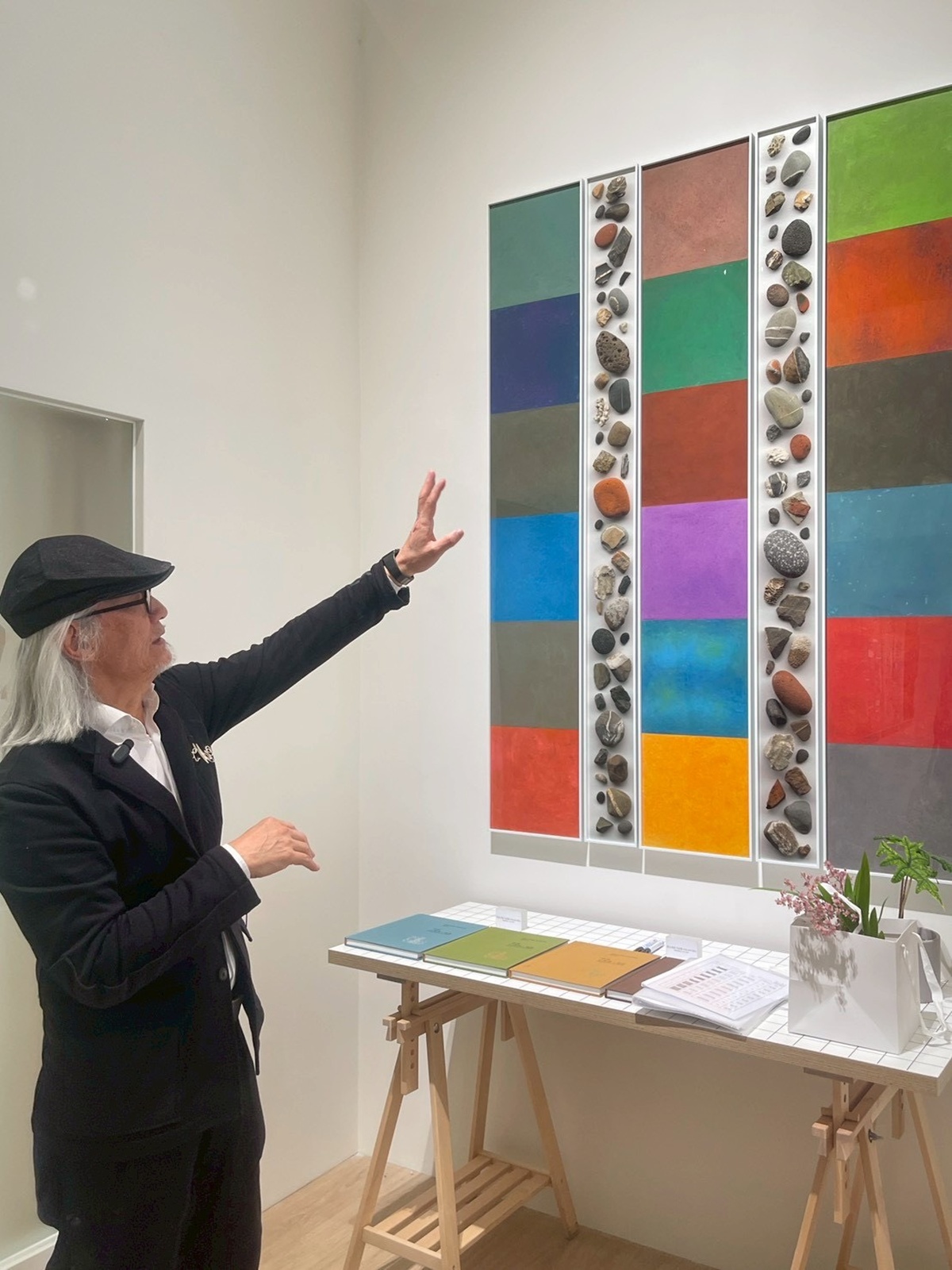 與攝影的冷峻與形式主義對照,繪畫與複合媒材則承擔了「思行」軸線的情感與物質性。在《殘思未盡》系列中,藝術家以石塊拼貼、顏料層次、與抽象線條,將目光轉向有機生命的掙扎。