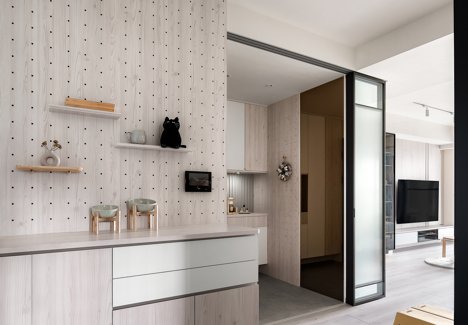 入門玄關採二進式設計,以黑色鋁框長虹玻璃拉門作爲隔 間,保有隱私與光影穿透感。壁面結合洞洞板與茶鏡,可自由 掛置小物與裝飾,以及延伸視覺提供穿衣功能,創造出靈動的 迎賓端景。洞洞板元素延伸至客廳、矮櫃備餐區與主臥牆面, 增加收納機能外,也為注入變化與趣味,結合全室榮獲綠建材 標章的 Order floor 超耐磨木地板,讓居家空間更添溫馨雅致。