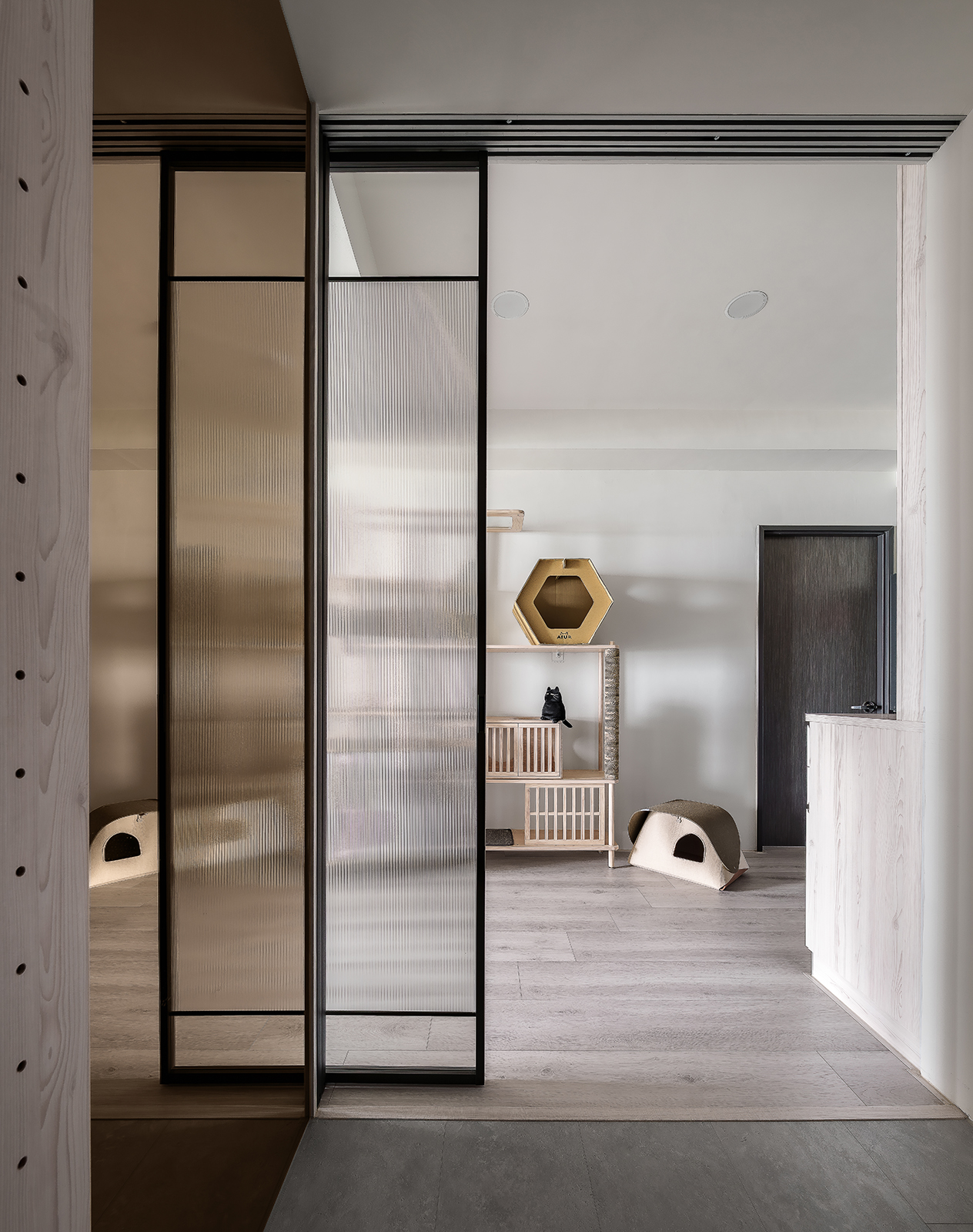 全室採隱藏式收納設計,維持俐落視感,讓動線更流暢自由, 也創造寬敞空間。透過木紋、白色與淺灰線性格柵三種材質的 交錯,燈光以暖白層次交錯,搭配間接光源,讓歸家時光倍感 放鬆。住宅展現出輕盈與活潑兼具的生活氛圍,屋主與毛孩在 光影交錯間共享每一刻,空間因生活而溫潤、因互動而生動。