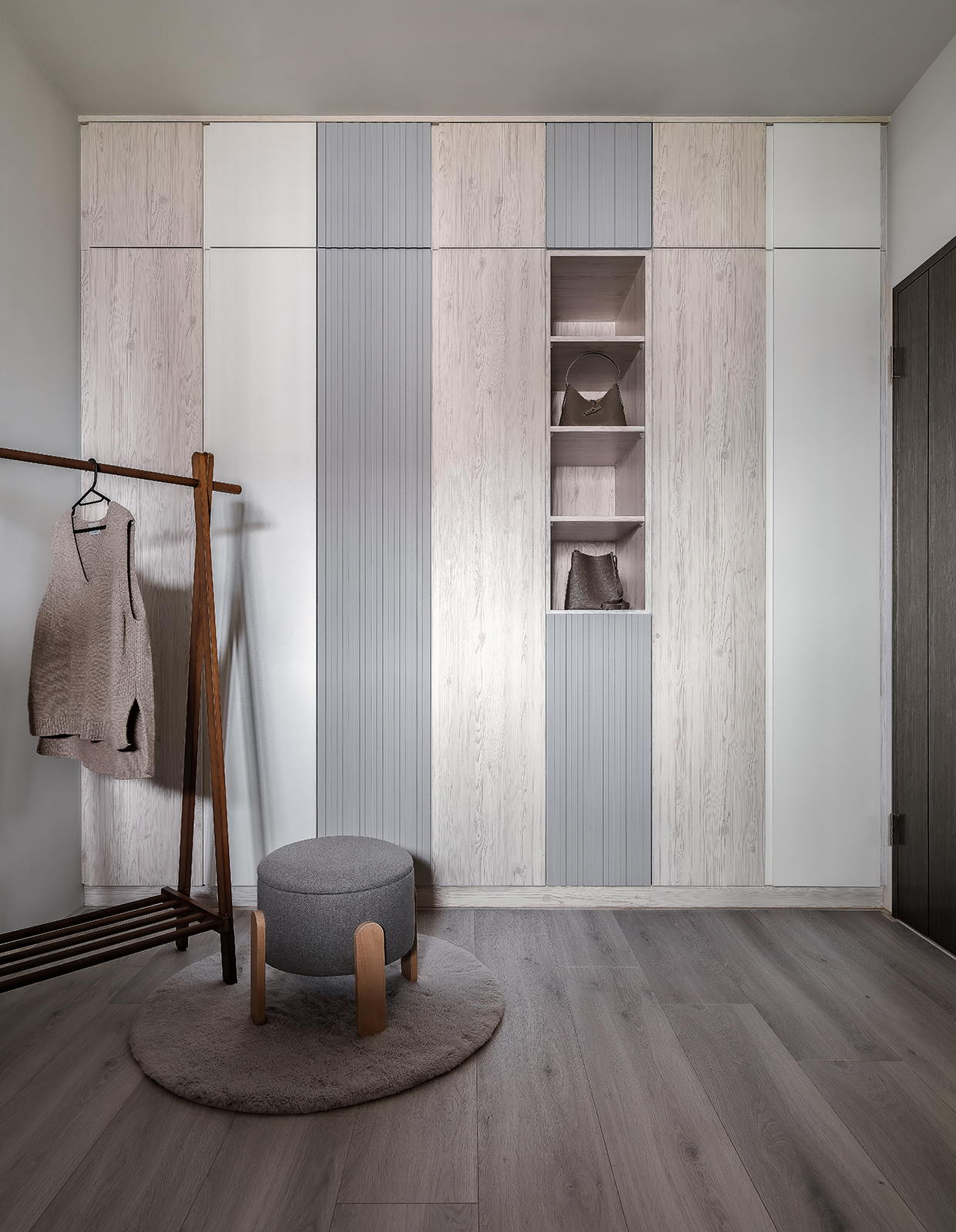 主臥保留窗邊採光,設置臥榻作休憩角落,延伸出簡約梳妝 台與床頭板,視覺統整而柔和。獨立更衣室以頂天立地衣櫃設 計,並延續灰色格柵與木紋系統板設計,兼具收納功能與北歐 清新感。搭配深色木質掛衣架與圓形椅凳,空間簡潔而通透。 每個角落都預留細膩尺度,讓人與毛孩都能自在停留,感受生 活的溫柔節奏。