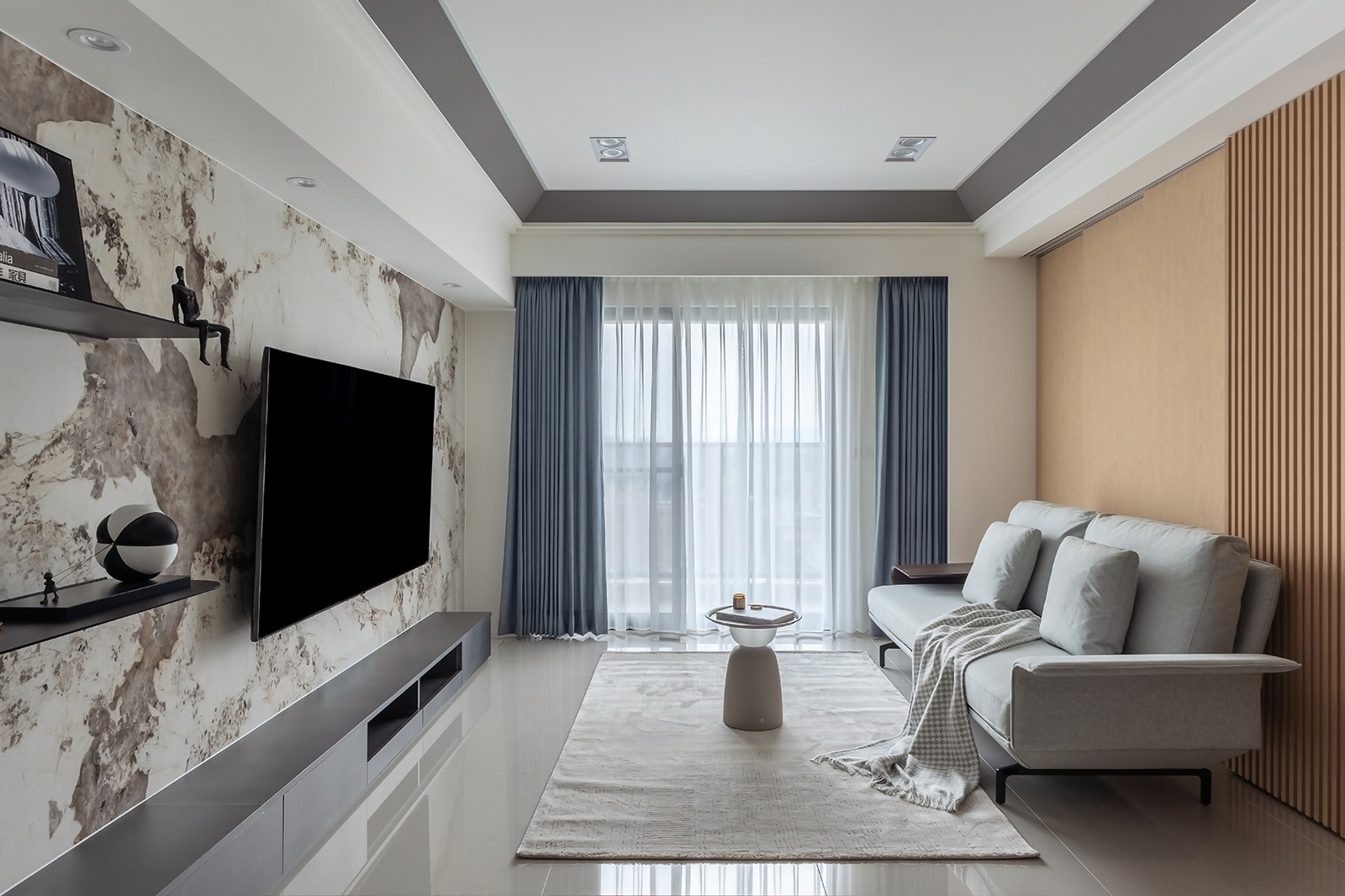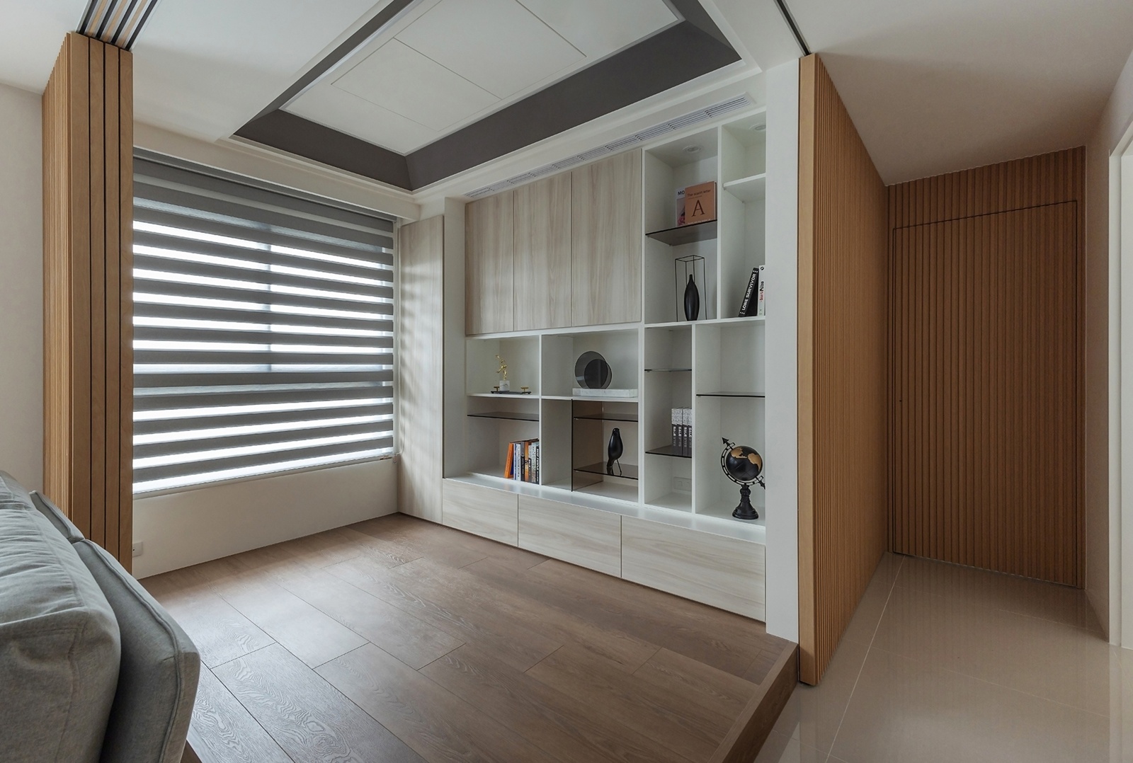 客廳以淺色岩板電視牆為核心,沙發背牆結合滑動木格柵門,兼具隔斷與牆體功能。門片開闔之間,空間自由轉換:開放時串連多功能區,閉合時形成柔和立面,維持秩序與隱私。多功能區以架高木地板劃分層次,櫃體整合收納與端景,作為私領域過渡節點,同時保留生活彈性。