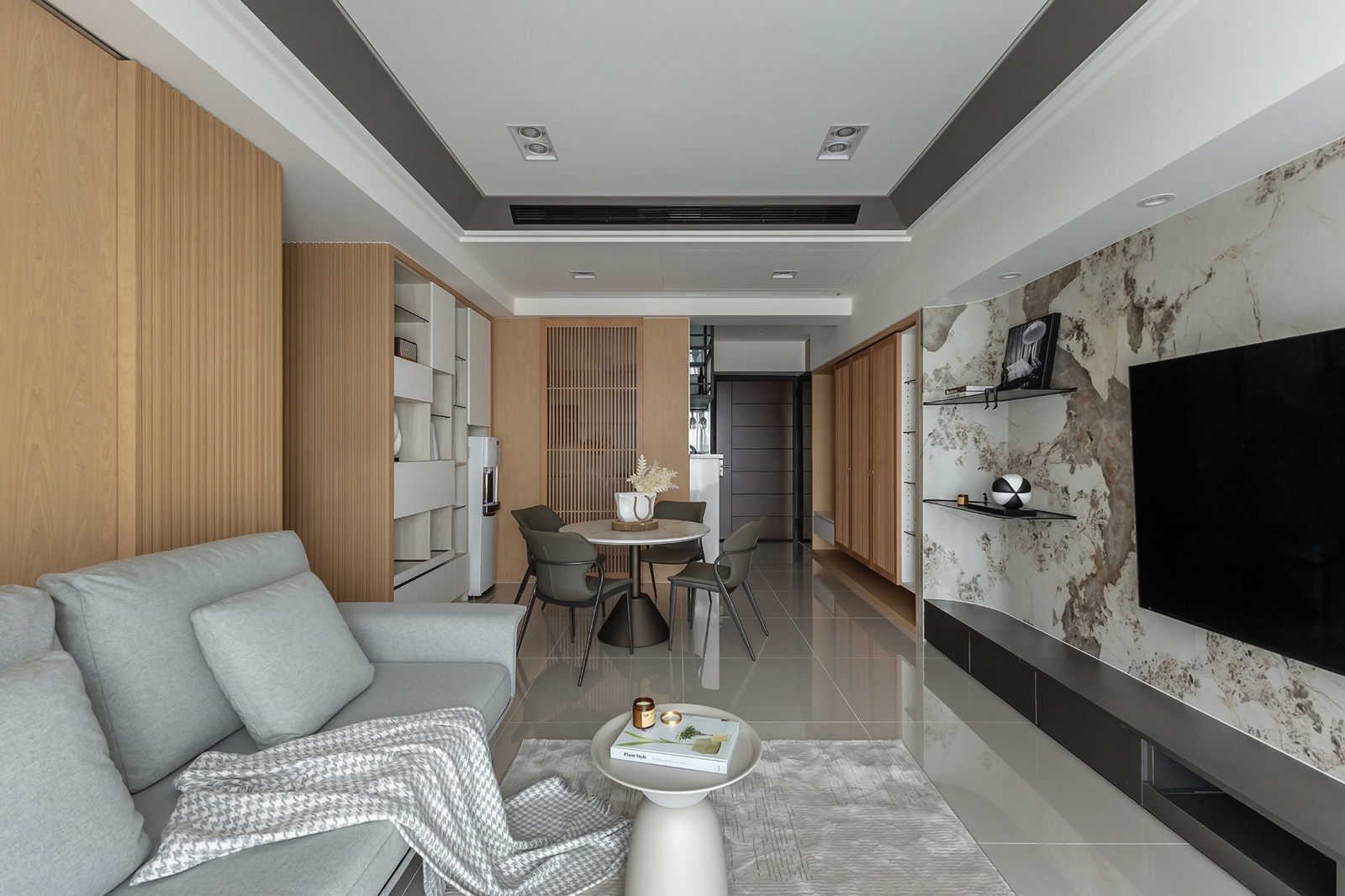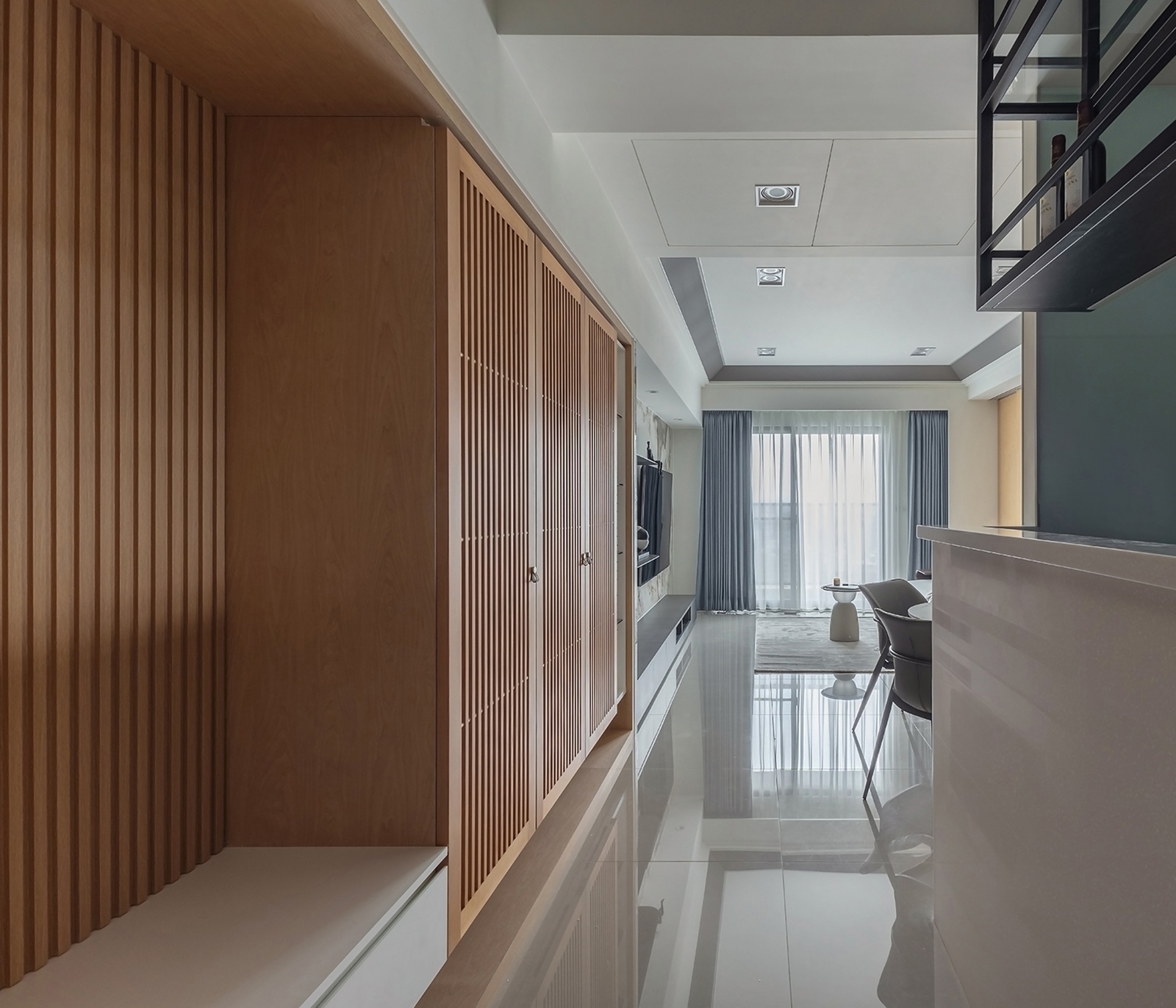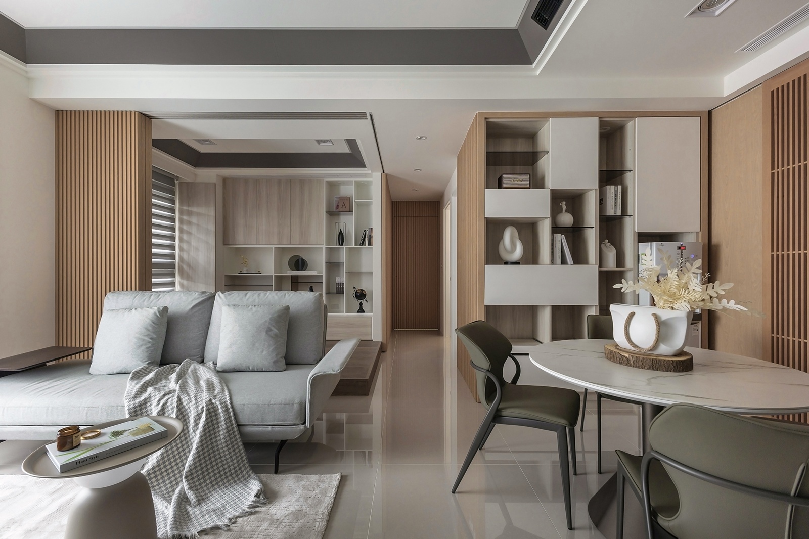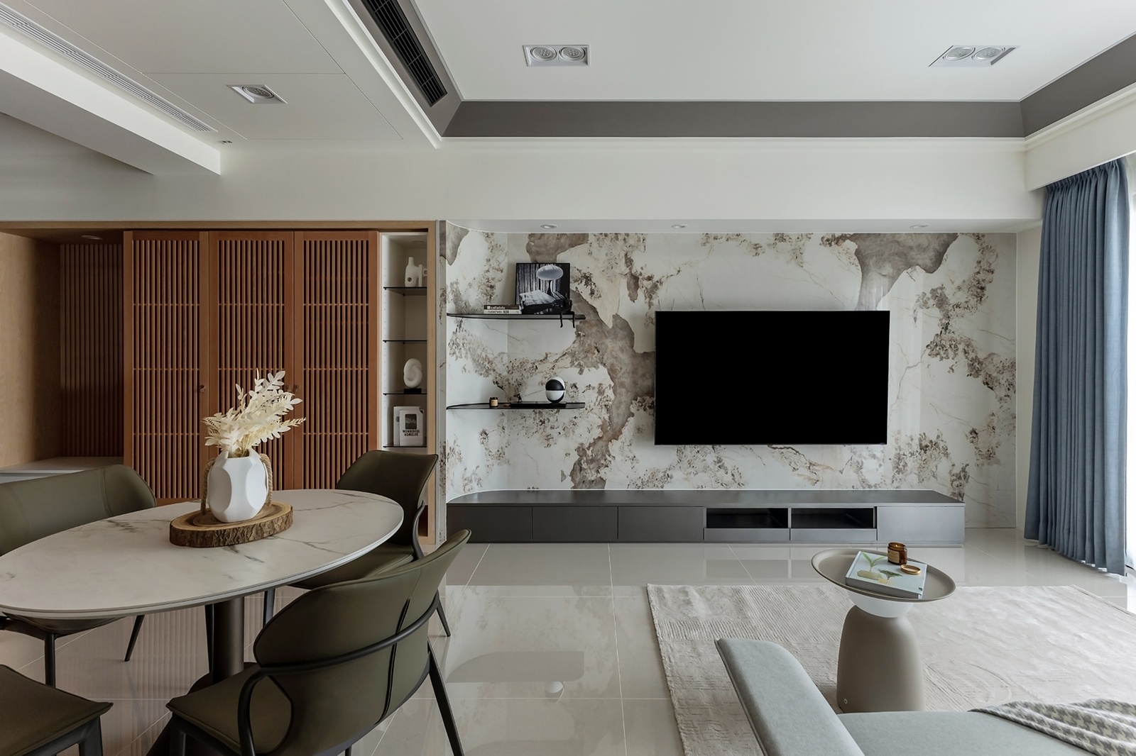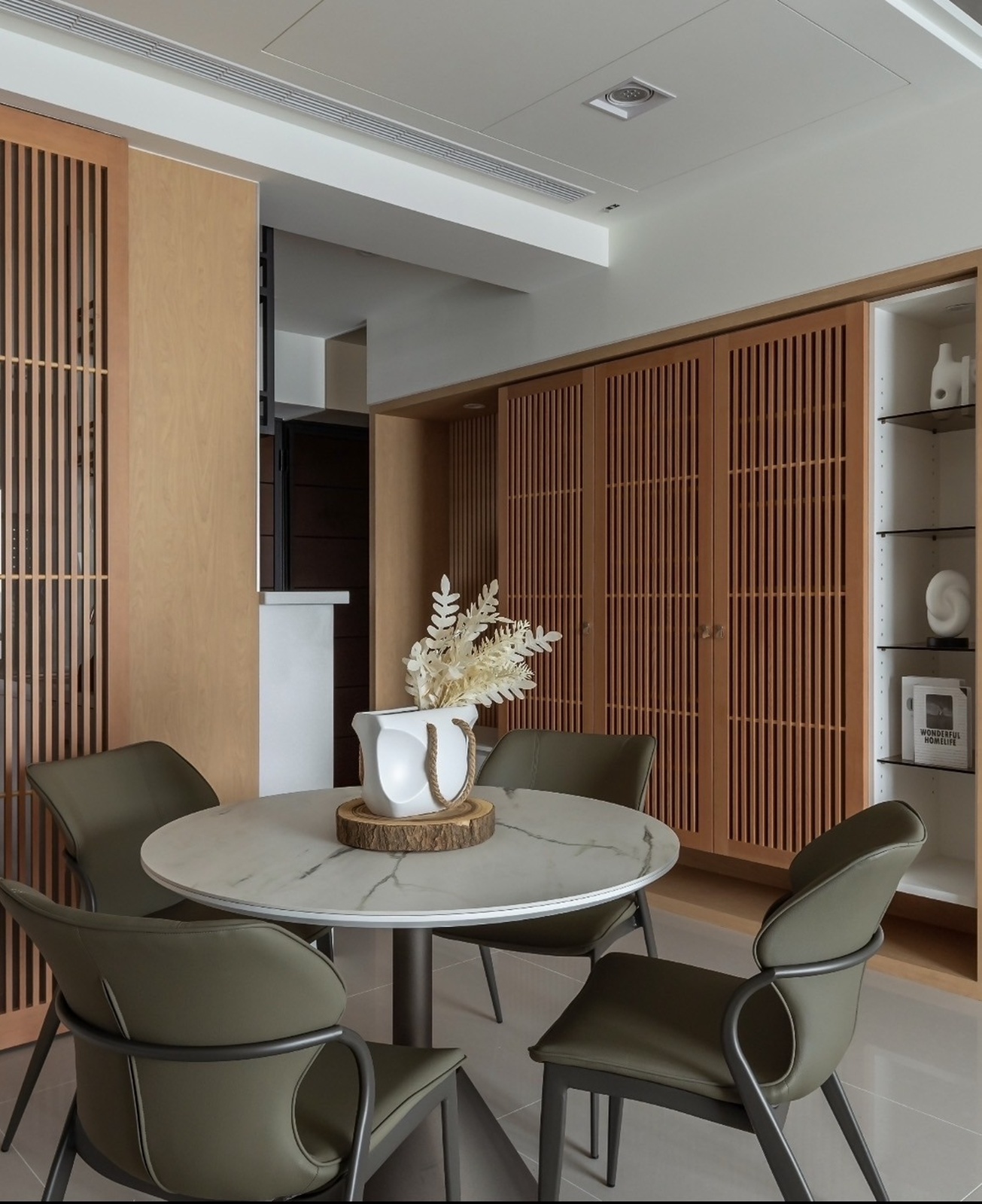 動線由玄關展開,格柵收納牆界定迎賓區,拋光石英磚地坪串聯公領域,形成空間連續感。右側半開放吧台與廚房自然銜接,木格柵滑門劃分餐區,使視覺與動線兼具彈性。餐區以圓形石紋桌與軍綠餐椅為焦點,格櫃整合展示與收納機能,在秩序中融入家的溫度。