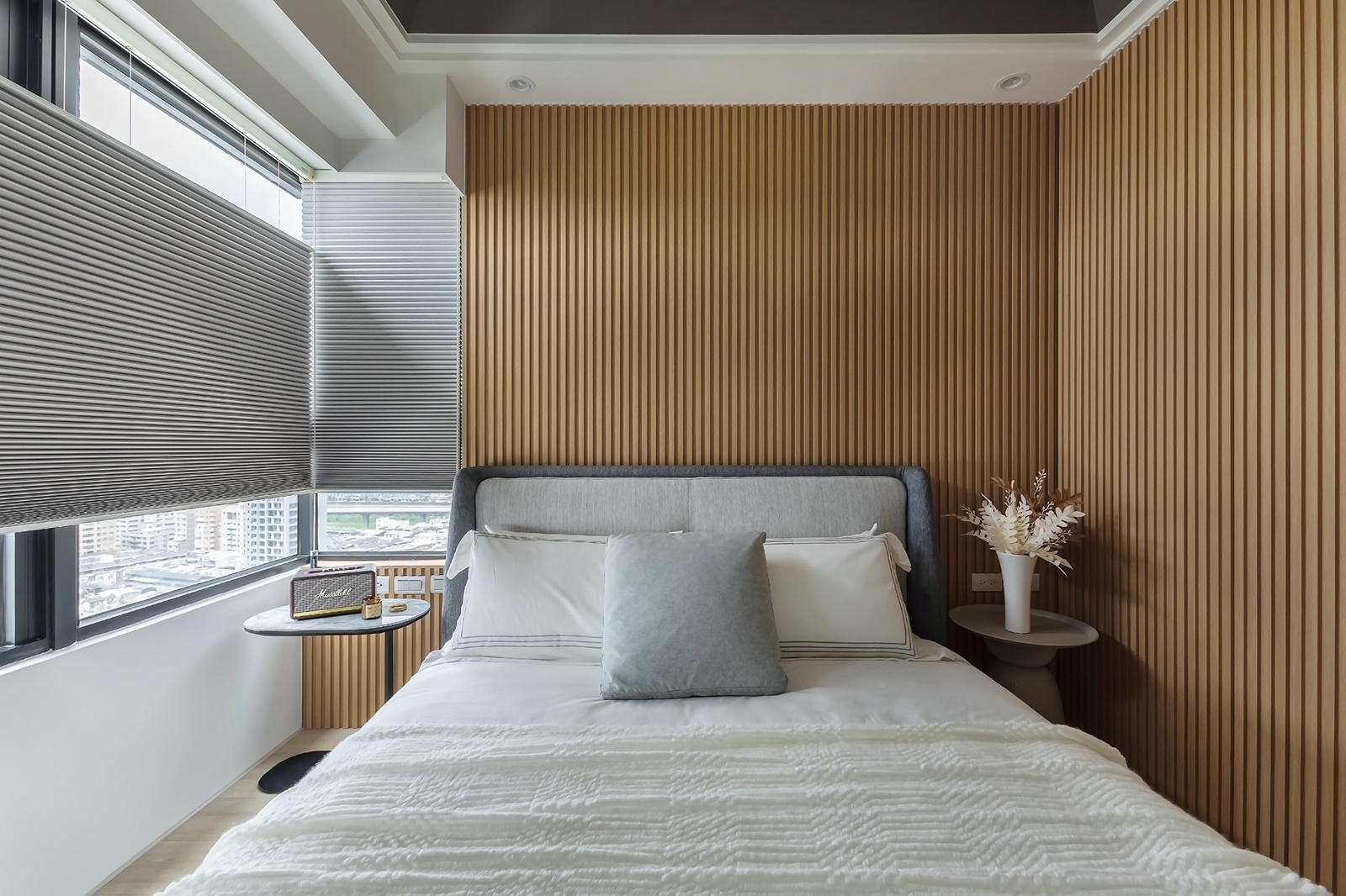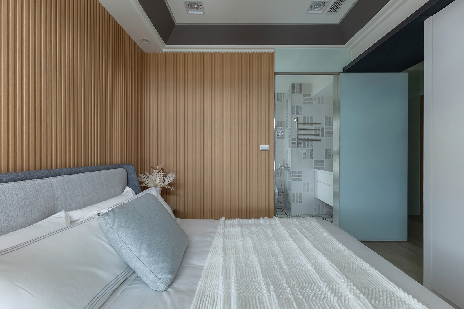 私領域延續整體語彙,更衣區採玻璃隔間與開放層架,輔以間接照明,柔光勾勒出清爽而溫暖的氛圍。主臥床頭垂直木格柵營造安定氣息,衛浴以圖騰磁磚與六角地磚構成現代節奏,細節中注入個性與生活感。