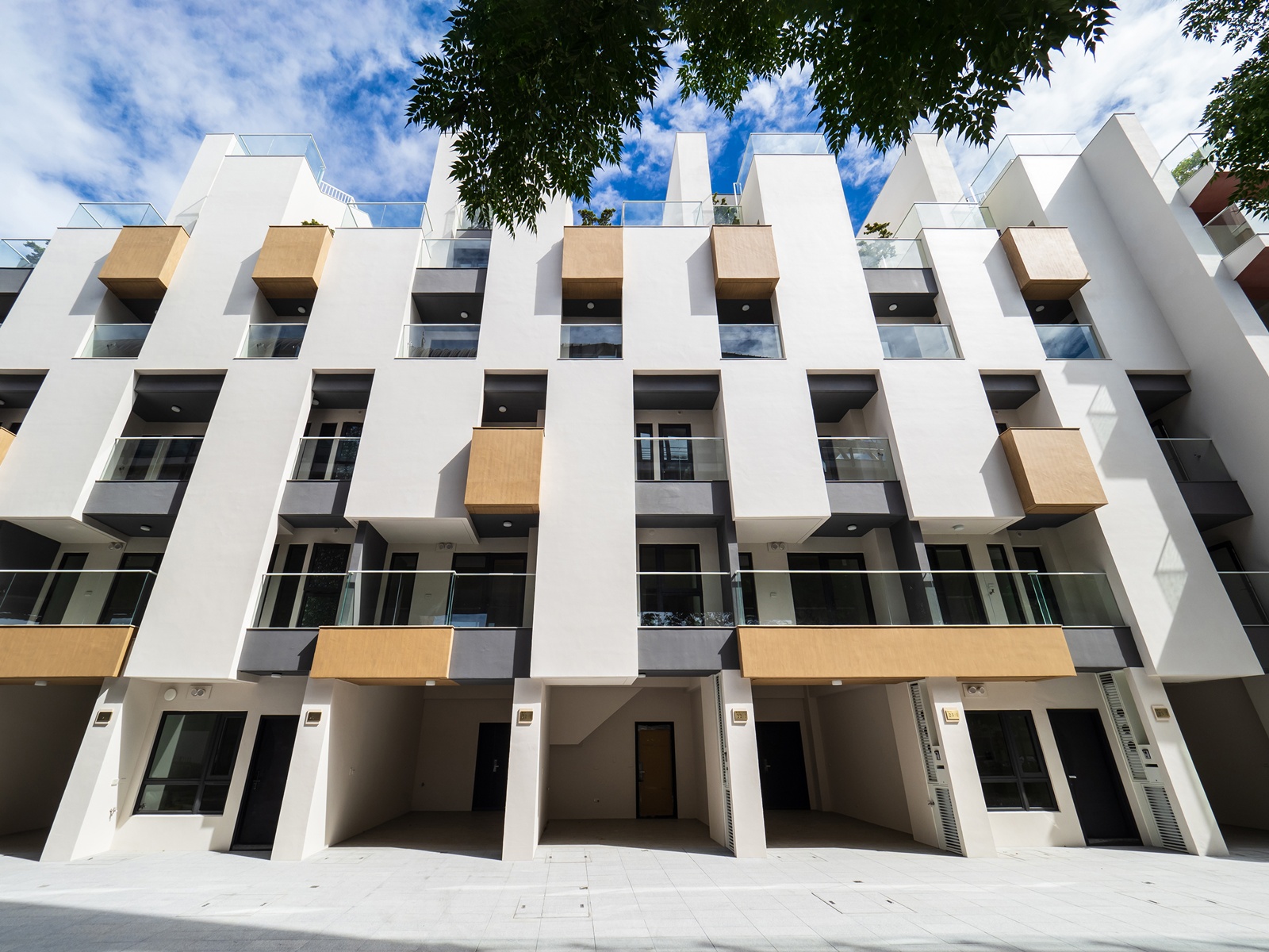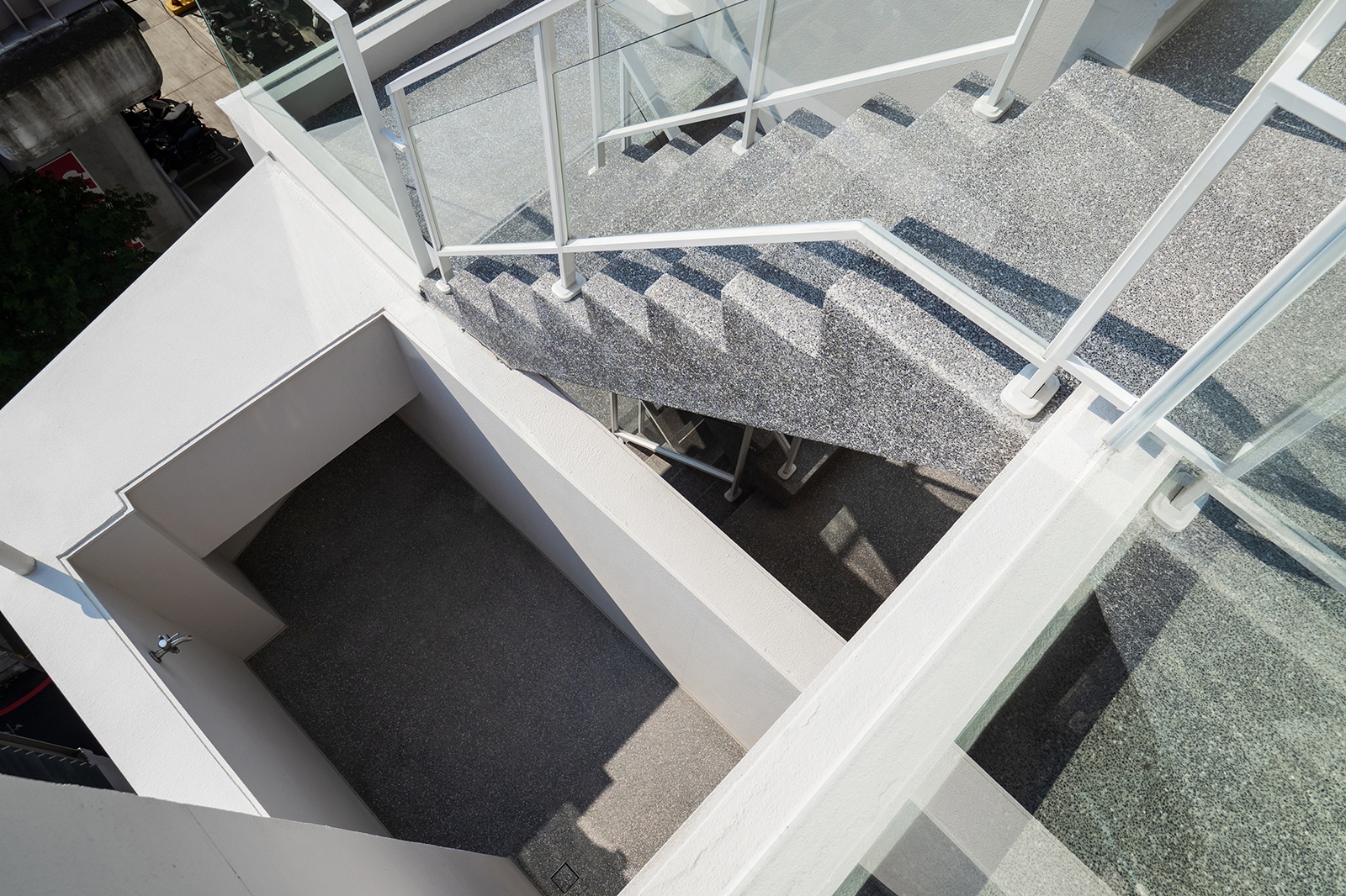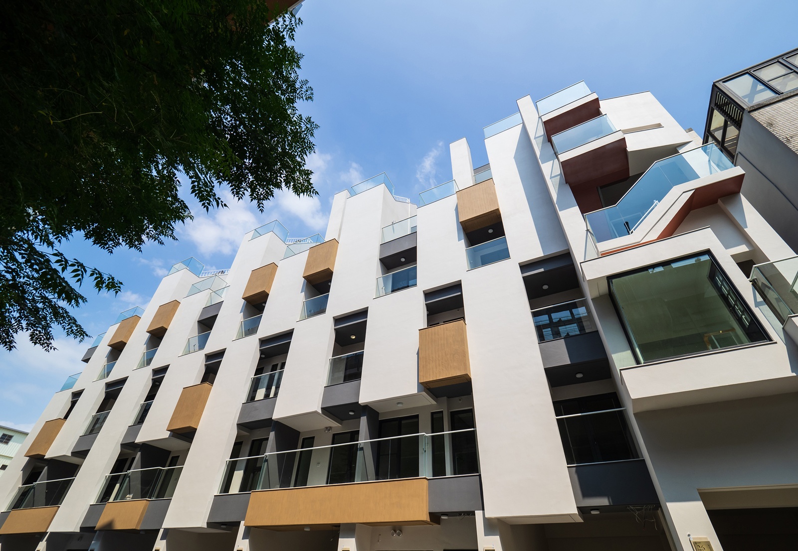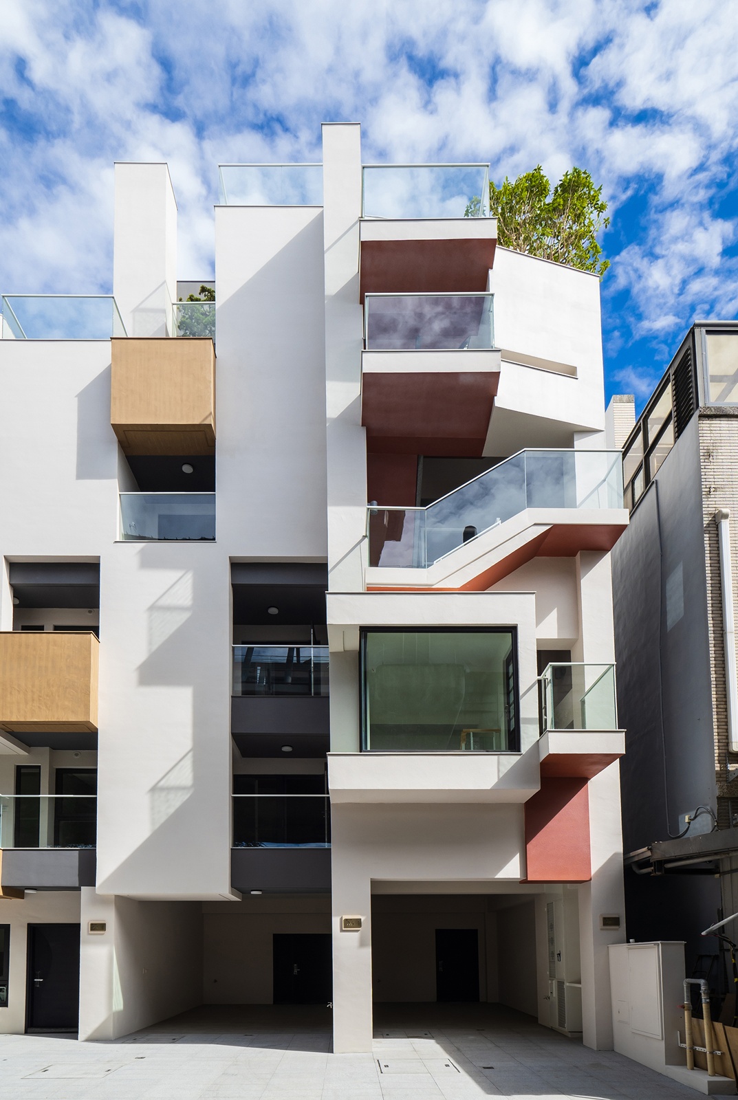 建案位於都市核心,周邊兼具綠意與生活便利性。設計整合多樣化戶外空間,每戶皆享內縮或外凸陽台、屋頂露台與庭院,立面延伸空間皆採用清玻璃欄杆,將室內外無縫連接。樓層錯落與門前景緻相互映襯,呈現建築量體與戶外景觀的層次美感;此外,動線與窗戶交織,引入室外綠意與四季變化,將視覺框景延伸至室內,讓步行動線與日常生活融入景觀體驗。屋頂及樓梯地面採用灰色洗石子,兼具耐久性與防滑功能。每戶獨立佈局明確,確保隱私同時保有與城市景觀的連結。